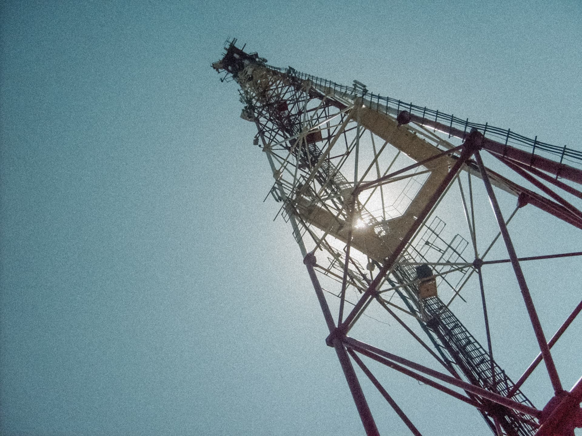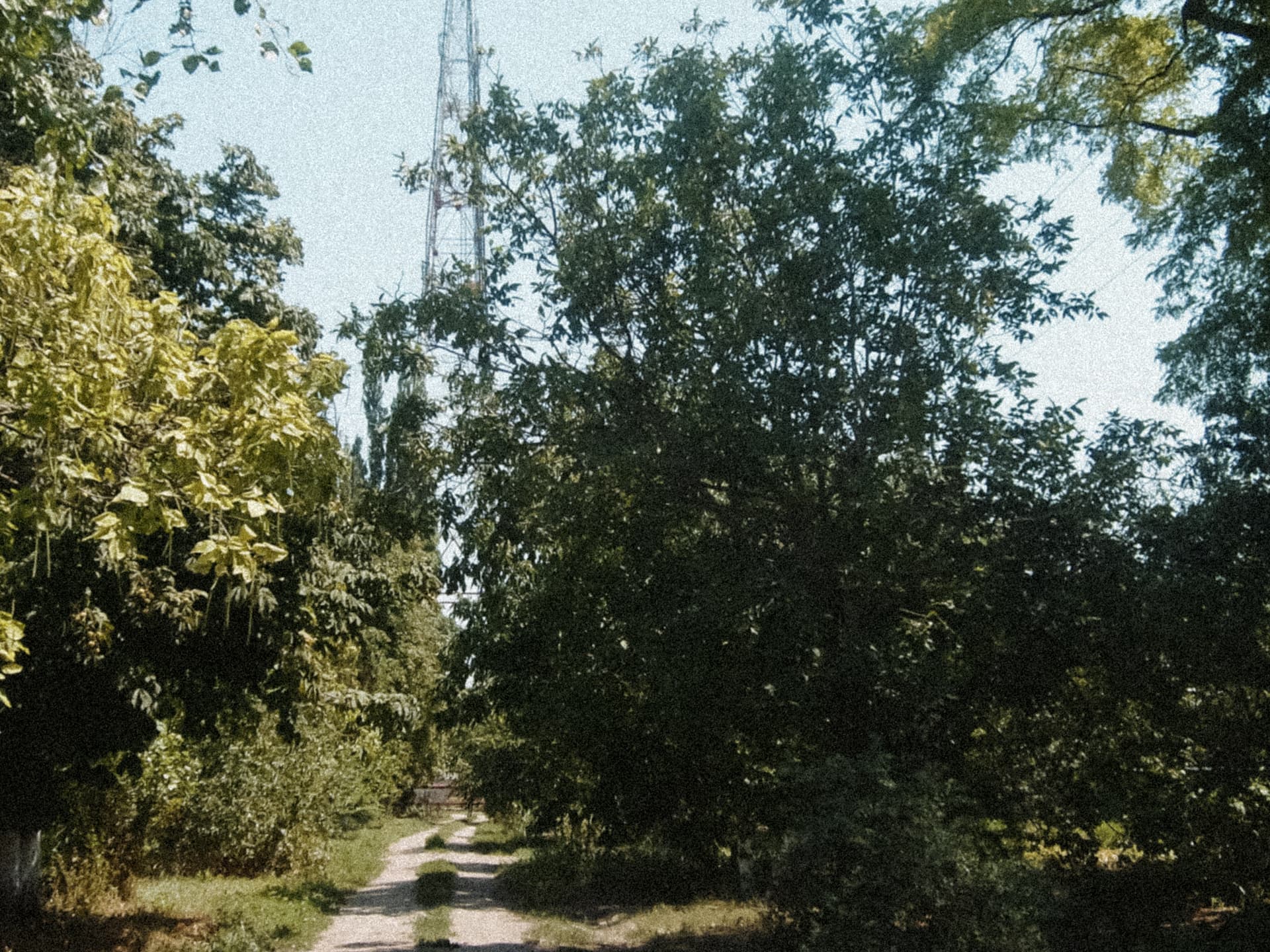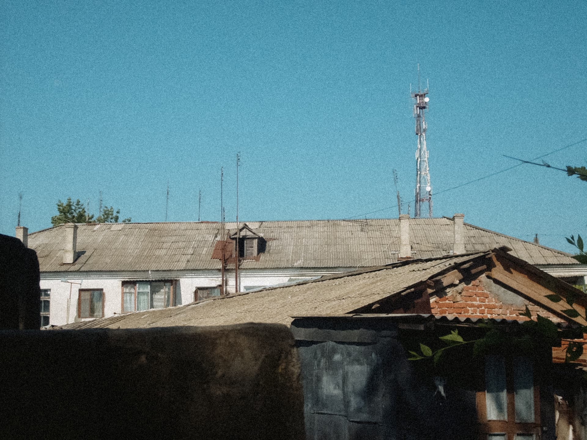Телевизионная вышка выглядывает из-за хозпостройки и старого двухэтажного жилого дома.