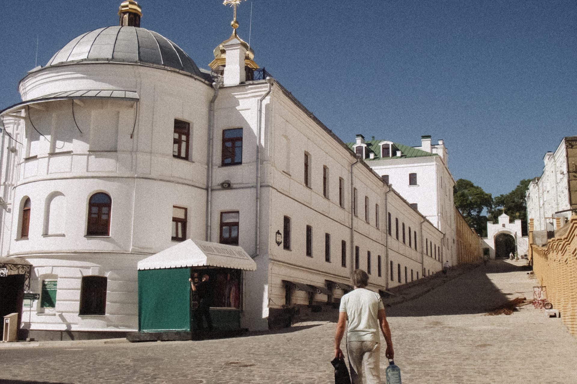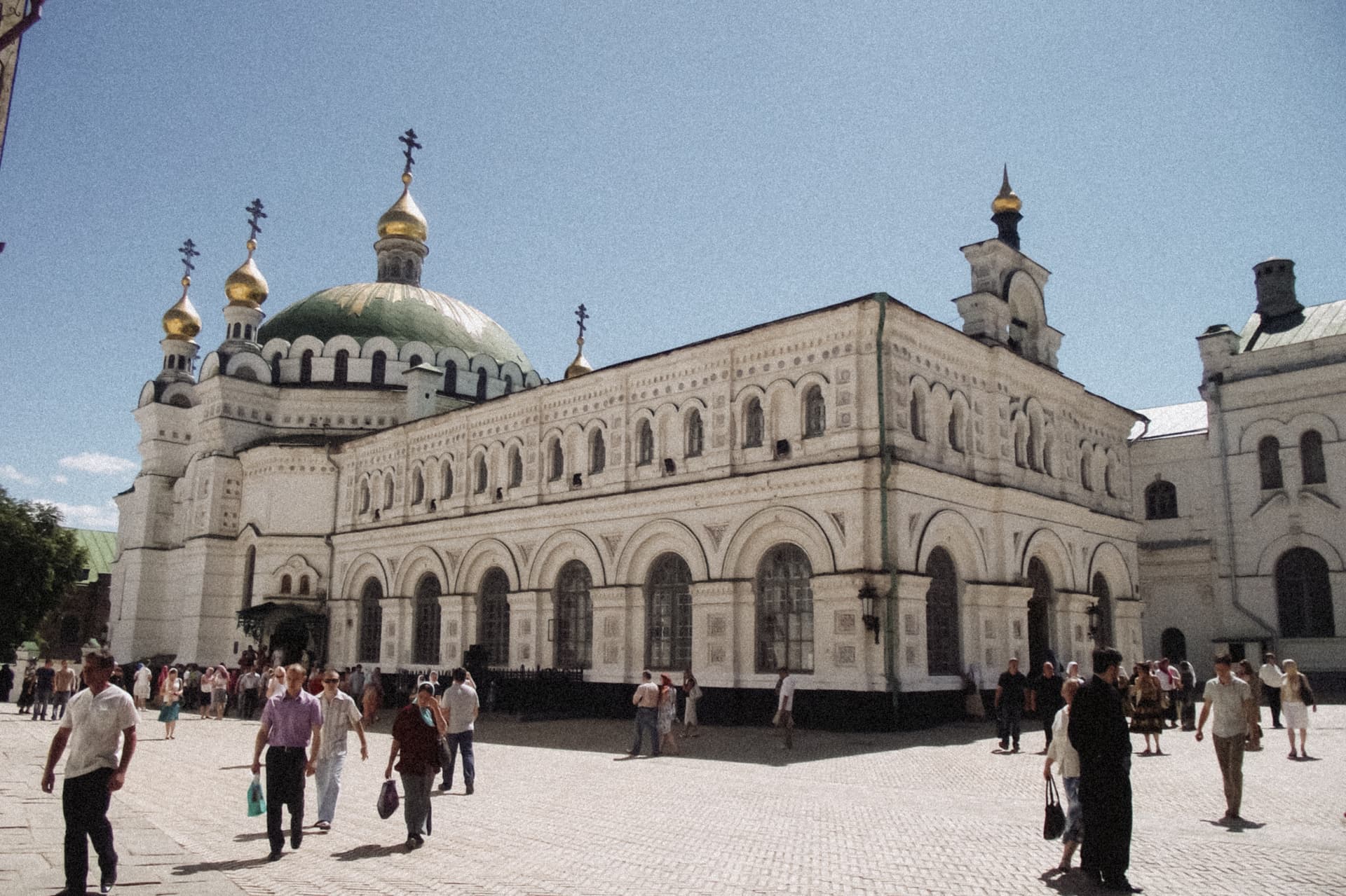 Вид от главных ворот на Церковь Зачатия Анны на Дальних Пещерах и Церковь Рождества Богородицы.