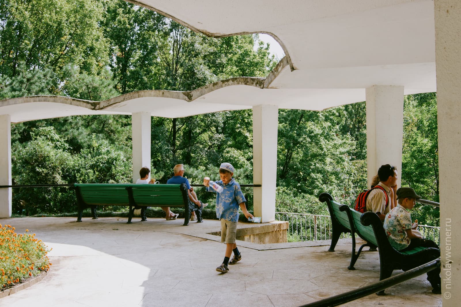 Тёплым днём кабинка фуникулёра напомнила духовой шкаф. До верхней станции доехал будто в пыточной камере. Сама же станция стоит в самой глубине дендрария и в отличие от нижней сетрицы дышит полной грудью без сомнительных соседей.
