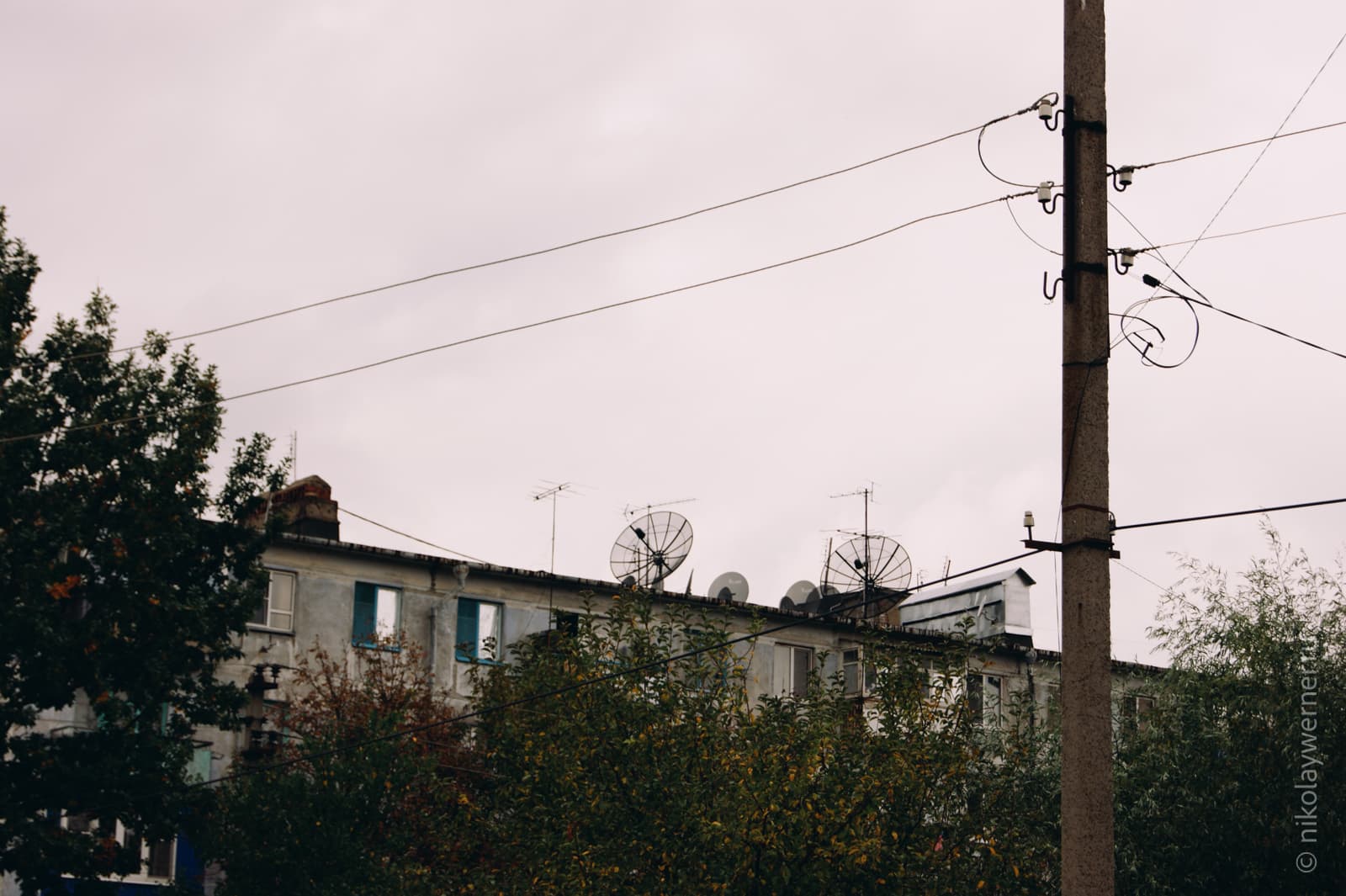 Пятиэтажка со странными антеннами на крыше.