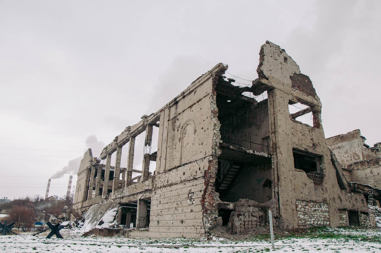 Неподалеку эхо войны — разрушенный во время боев дом, сохраненный в том виде, в каком его оставила война.