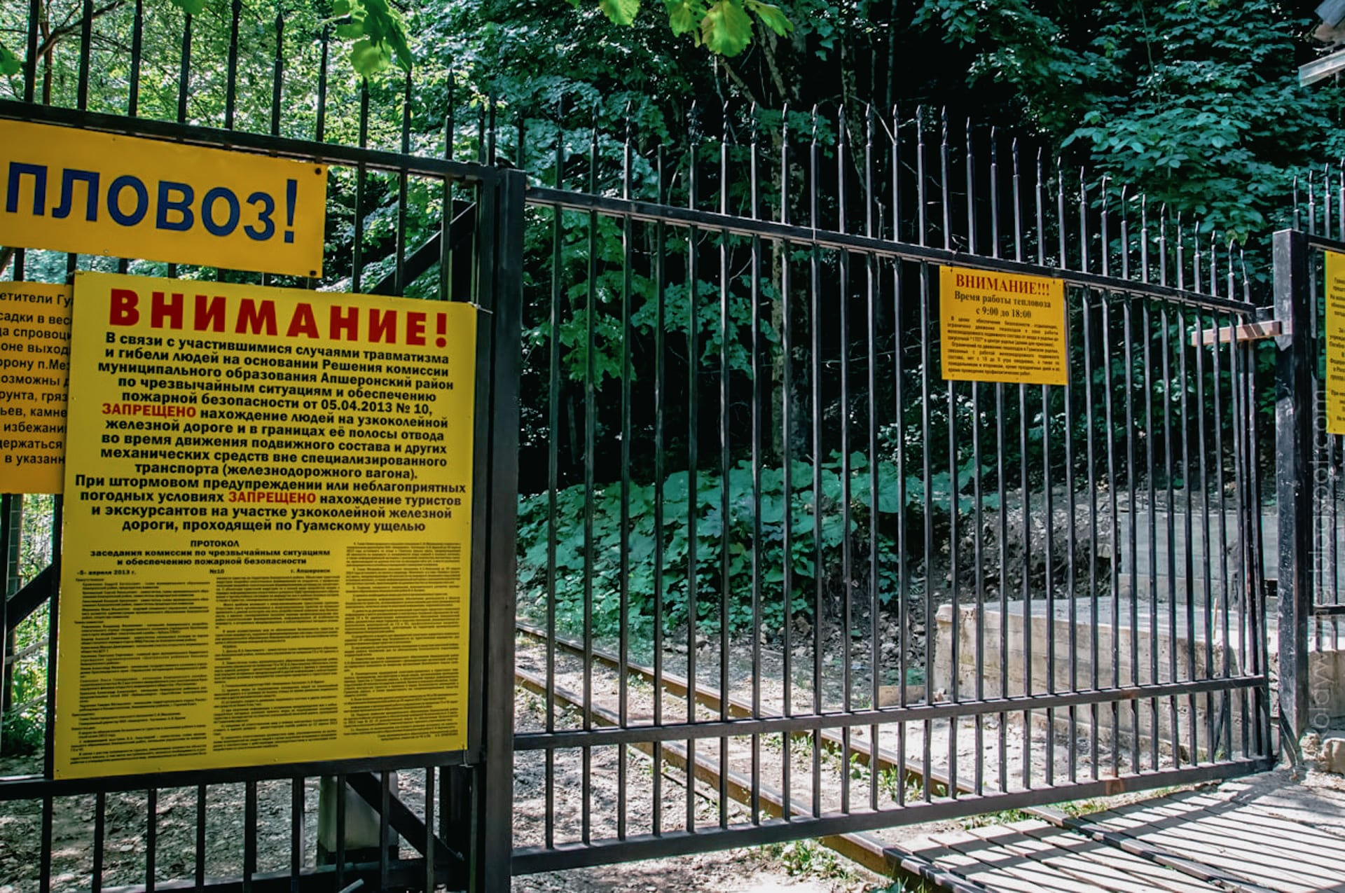 Гуамское ущелье невелико, около трёх километров в длину — идеально для пешей прогулки, но не вышло. Ради безопасности туристов, но по сути ради отжима денег, Апшеронские власти запретили вход в ущелье, поставили забор и даже колючую проволоку натянули.