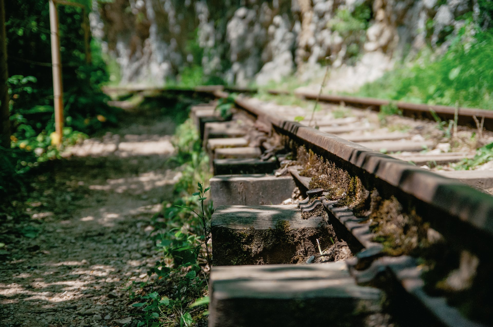 Старая лесовозная дорога повела вниз. Прошли место, где её разорвал на части сель — не на шутку разбушевалась тогда природа! Дорога спускается плавно, можно расслабиться и поговорить. За беседами незаметно выходим вниз, к узкоколейке. Под ногами ржавые рельсы, дорога заросла бурьяном, сквозь который вьётся узкая тропинка.