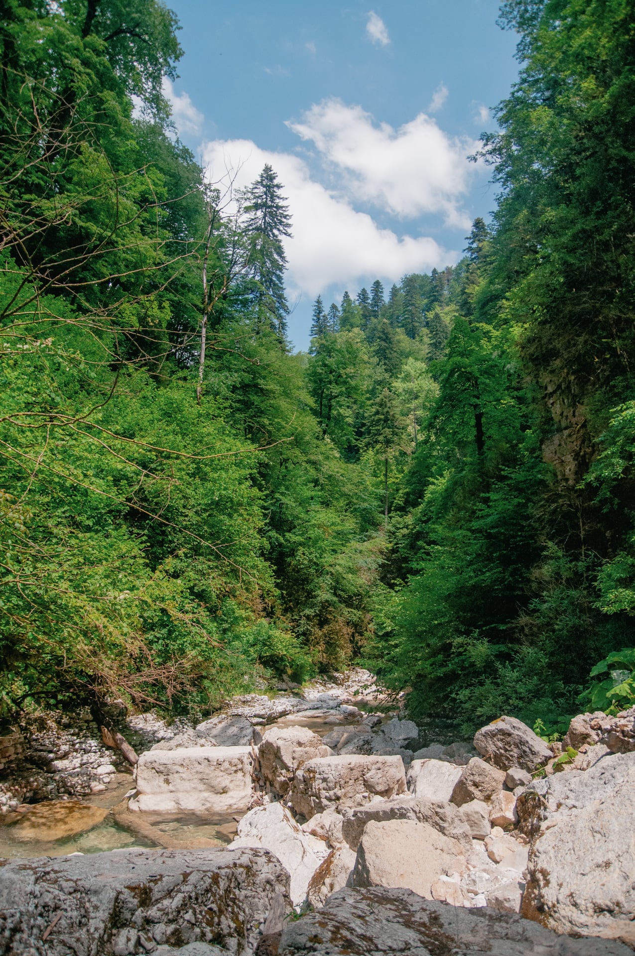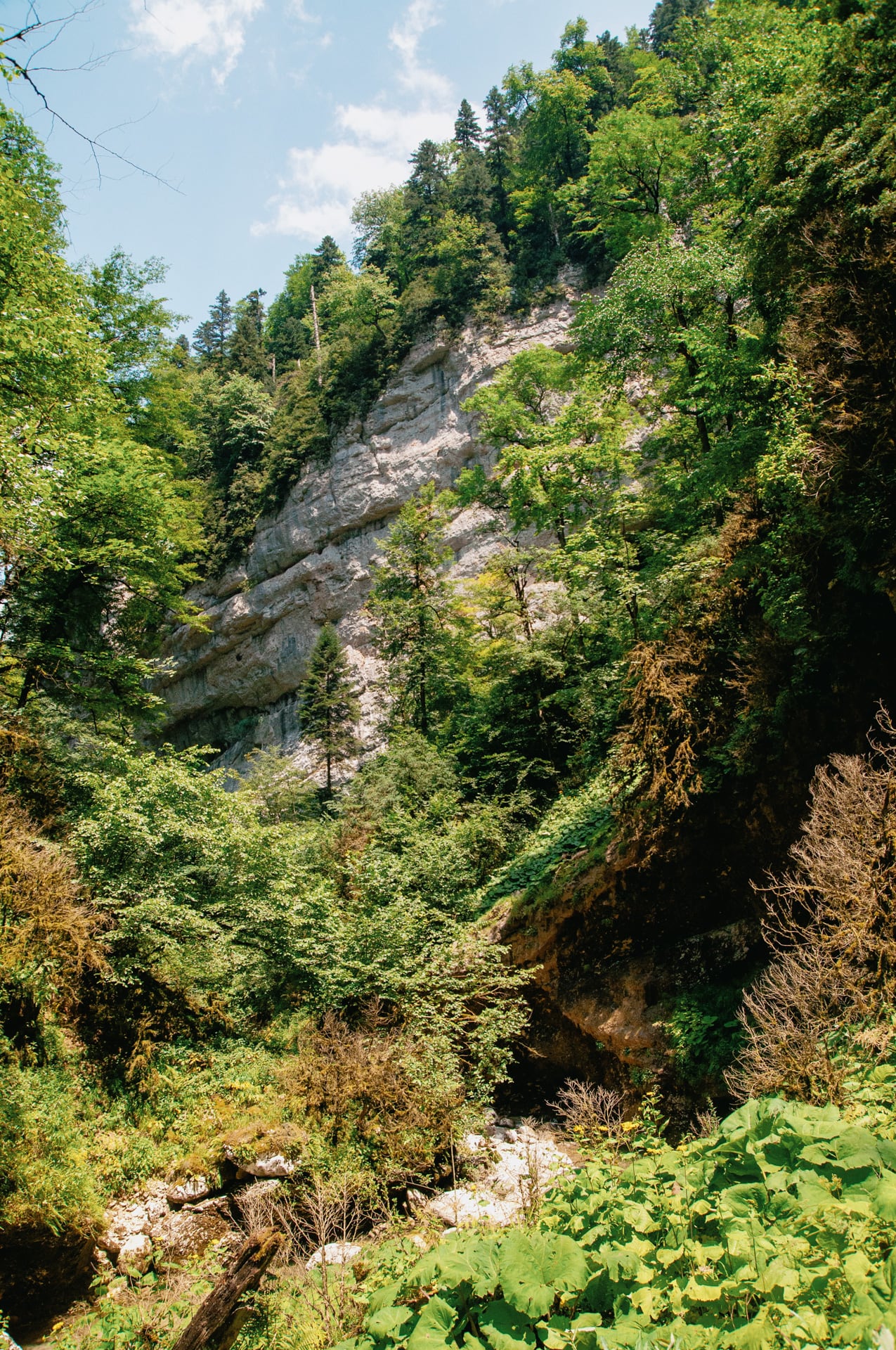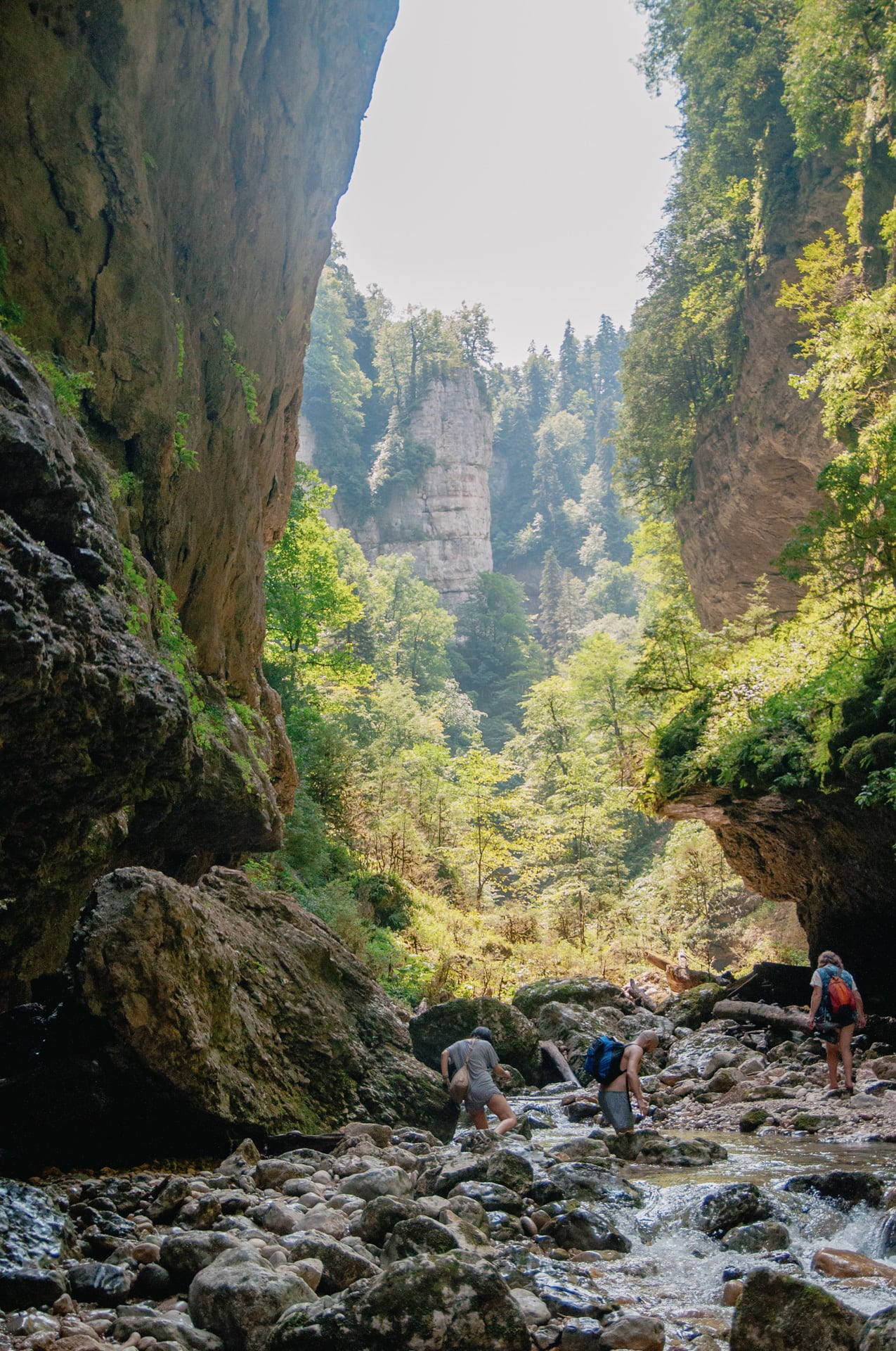 Виды захватили дух. Вниз по течению уходят залитые ярким дневным солнцем склоны. Вековые буки и пихты скрывают кронами неприступные кручи. Река то бурлит между валунов, то разливается заводями цвета лазури. Она скрывается за поворотом — течёт на встречу с Курджипс. А бежит она оттуда, где зелень наливается синевой, деревья не в силах скрыть отвесные скалы, которые могучими бастионами поднимаются ввысь и сжимают реку. Меж ними темно и только в вышине горят на солнце кроны.
