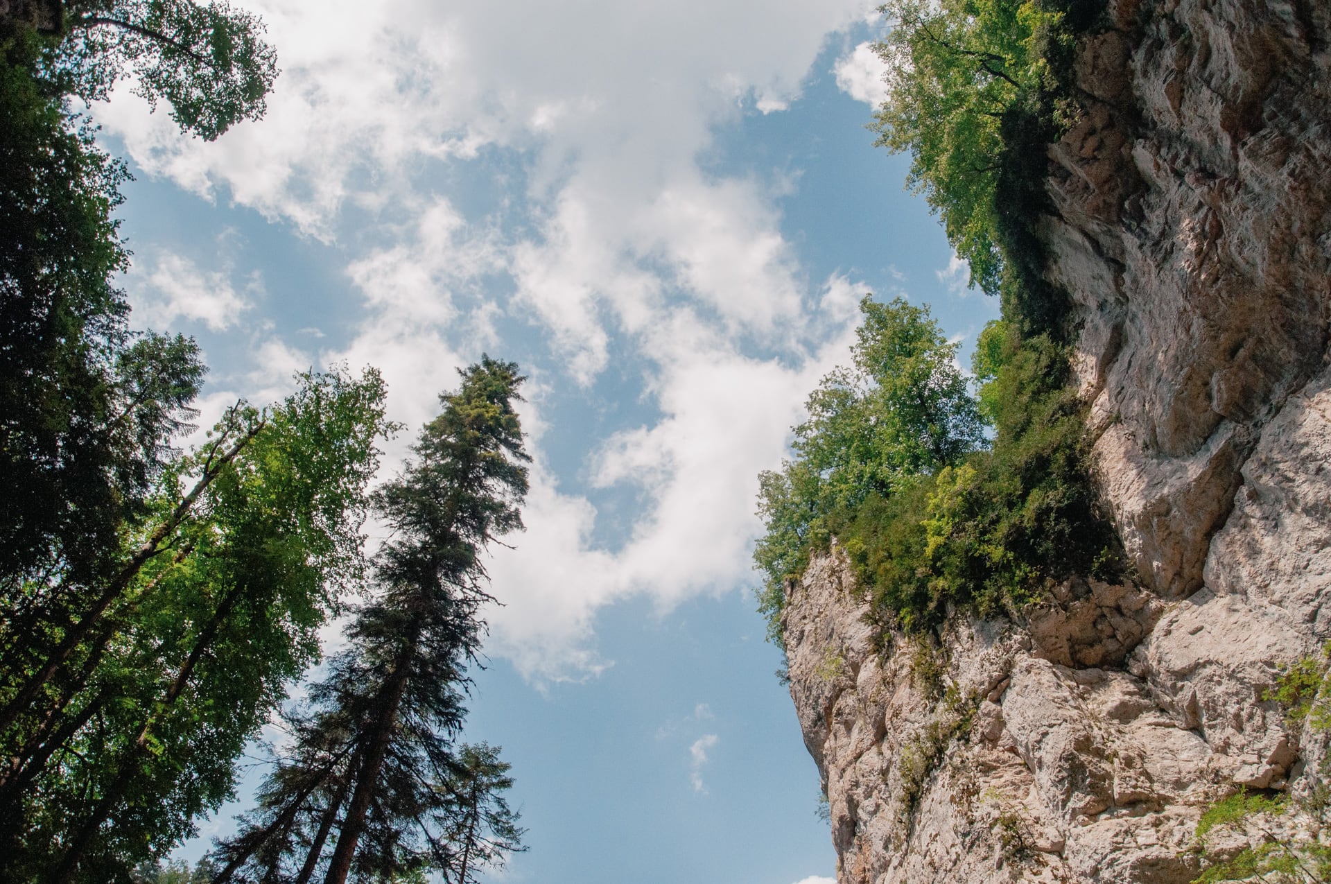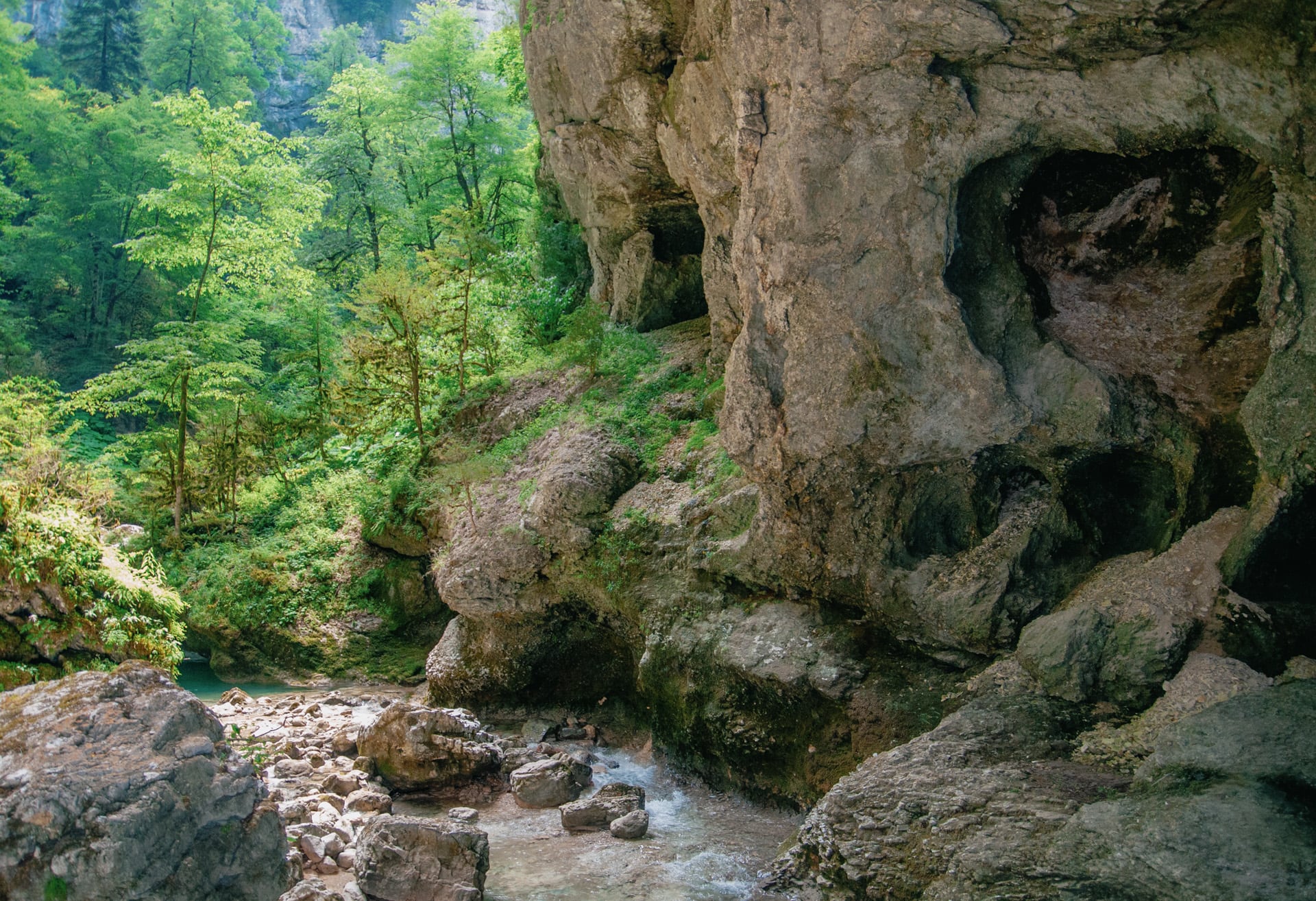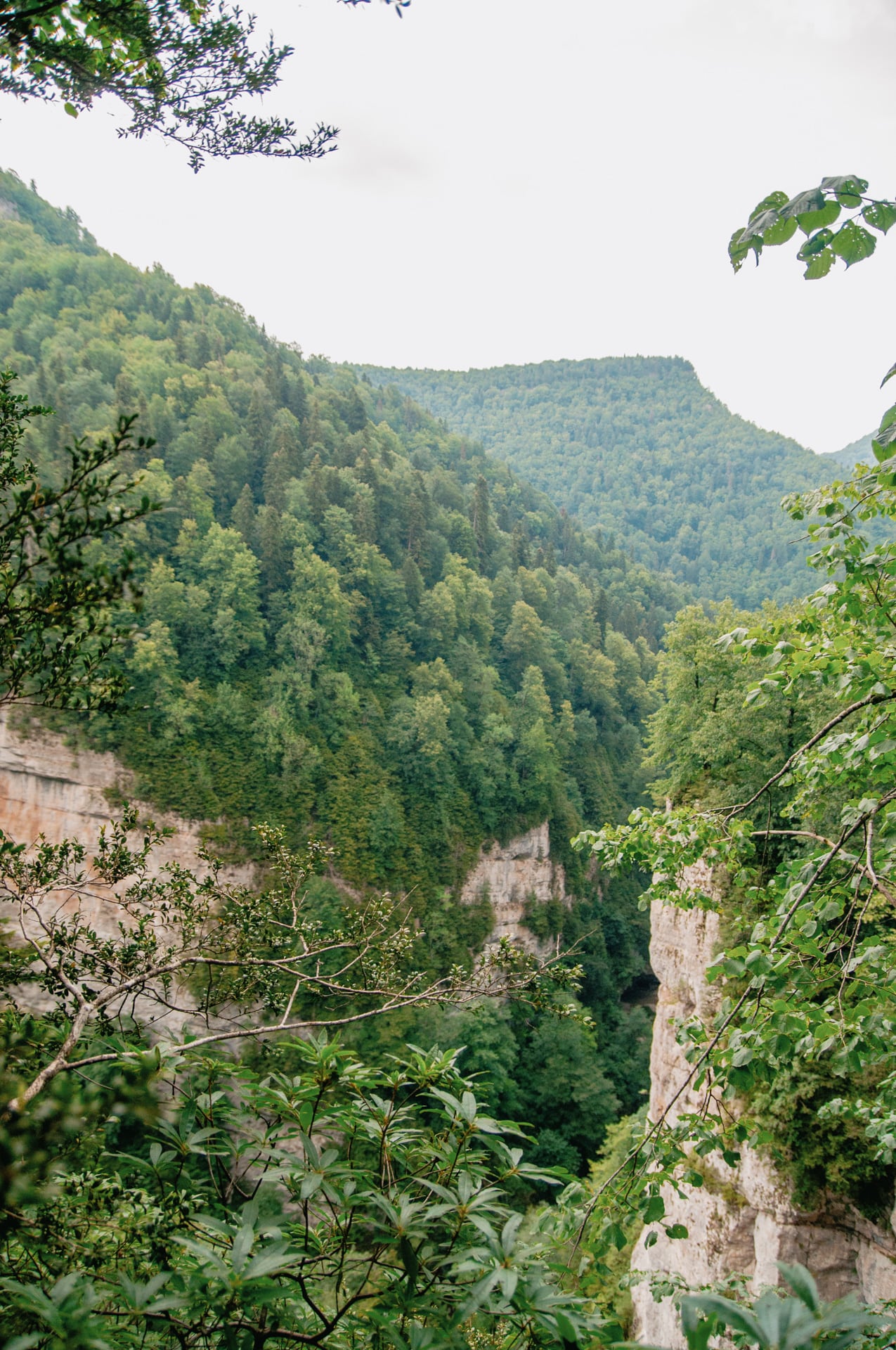 Виды захватили дух. Вниз по течению уходят залитые ярким дневным солнцем склоны. Вековые буки и пихты скрывают кронами неприступные кручи. Река то бурлит между валунов, то разливается заводями цвета лазури. Она скрывается за поворотом — течёт на встречу с Курджипс. А бежит она оттуда, где зелень наливается синевой, деревья не в силах скрыть отвесные скалы, которые могучими бастионами поднимаются ввысь и сжимают реку. Меж ними темно и только в вышине горят на солнце кроны.