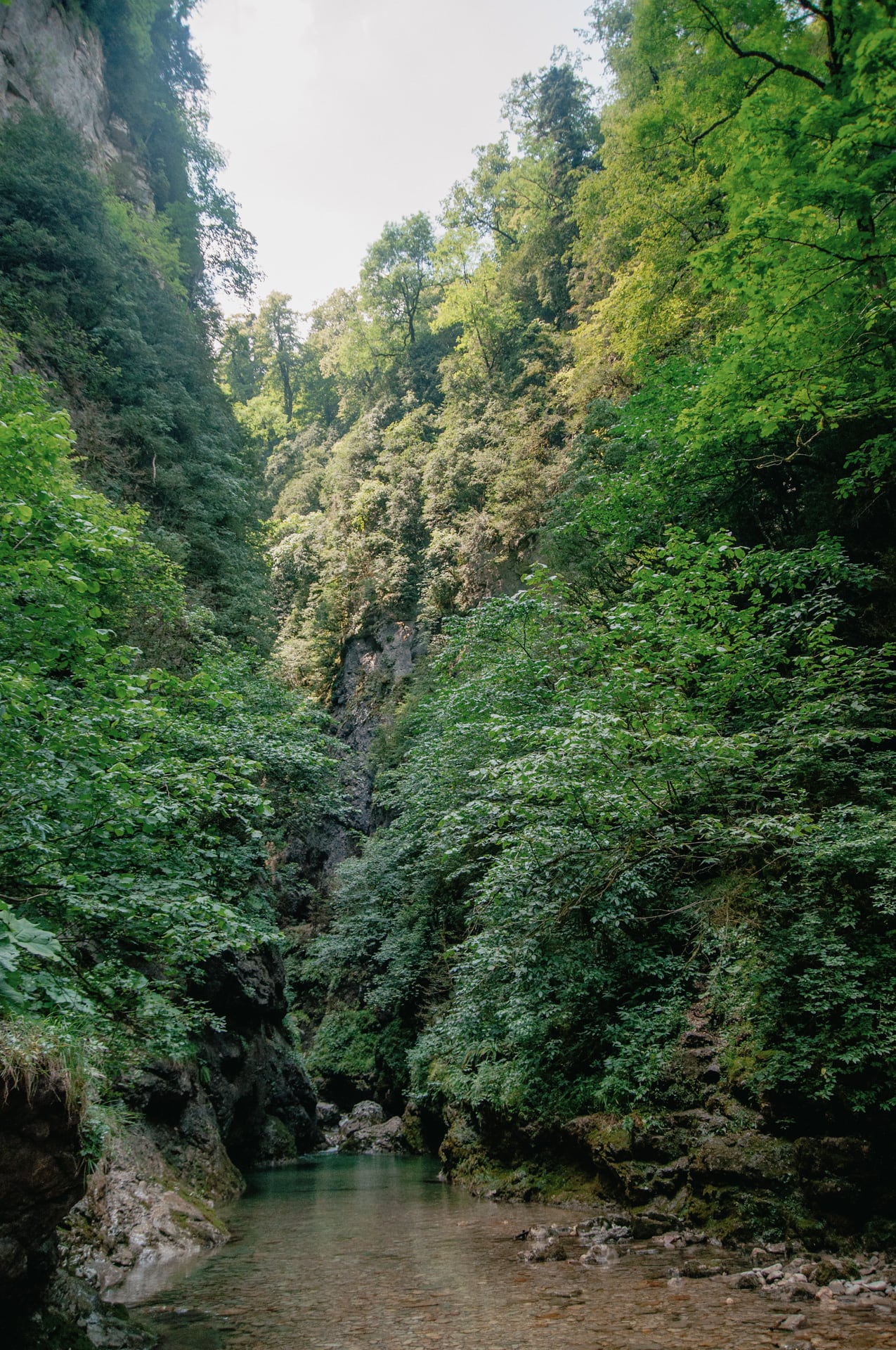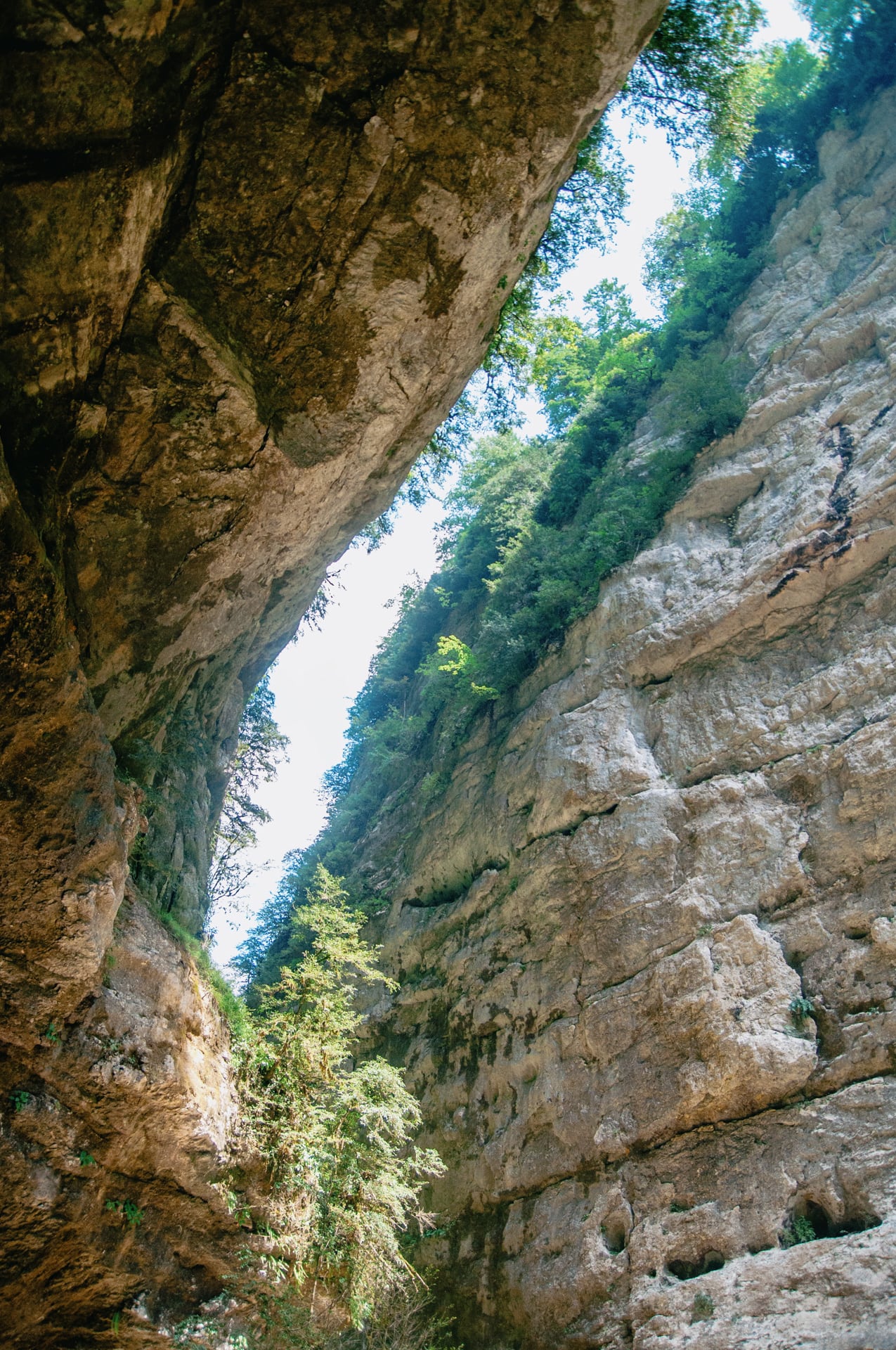 Склоны ущелья принимают отрицательный уклон, мощные карнизы почти смыкаются над головой, редкий куст удерживается на таких неприступных скалах. Просвет неба горит где-то в десятках метров в вышине, солнечный свет не доходит до дна, тут практически вечные сумерки. Чувствуешь себя песчинкой.