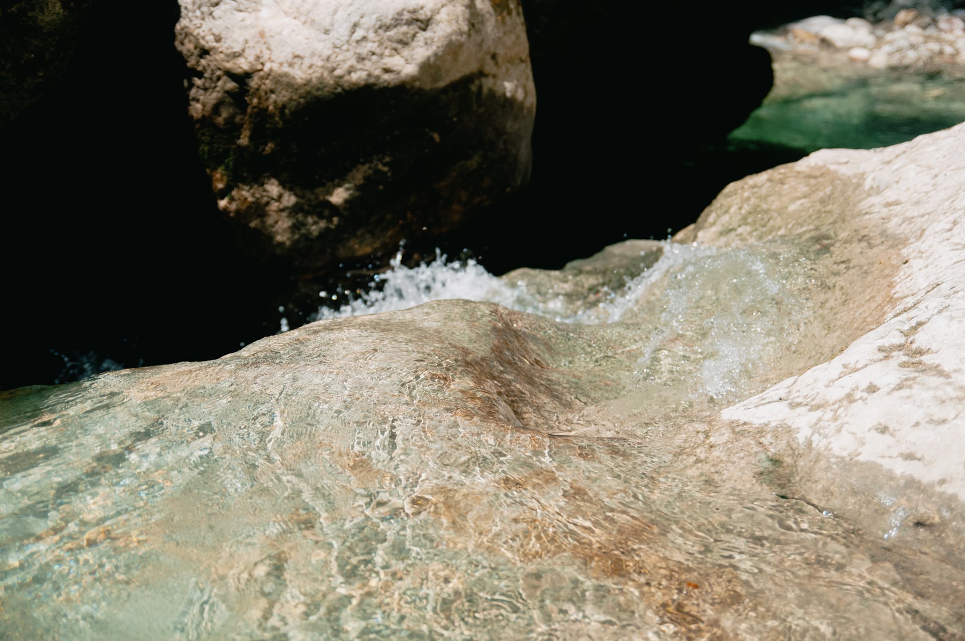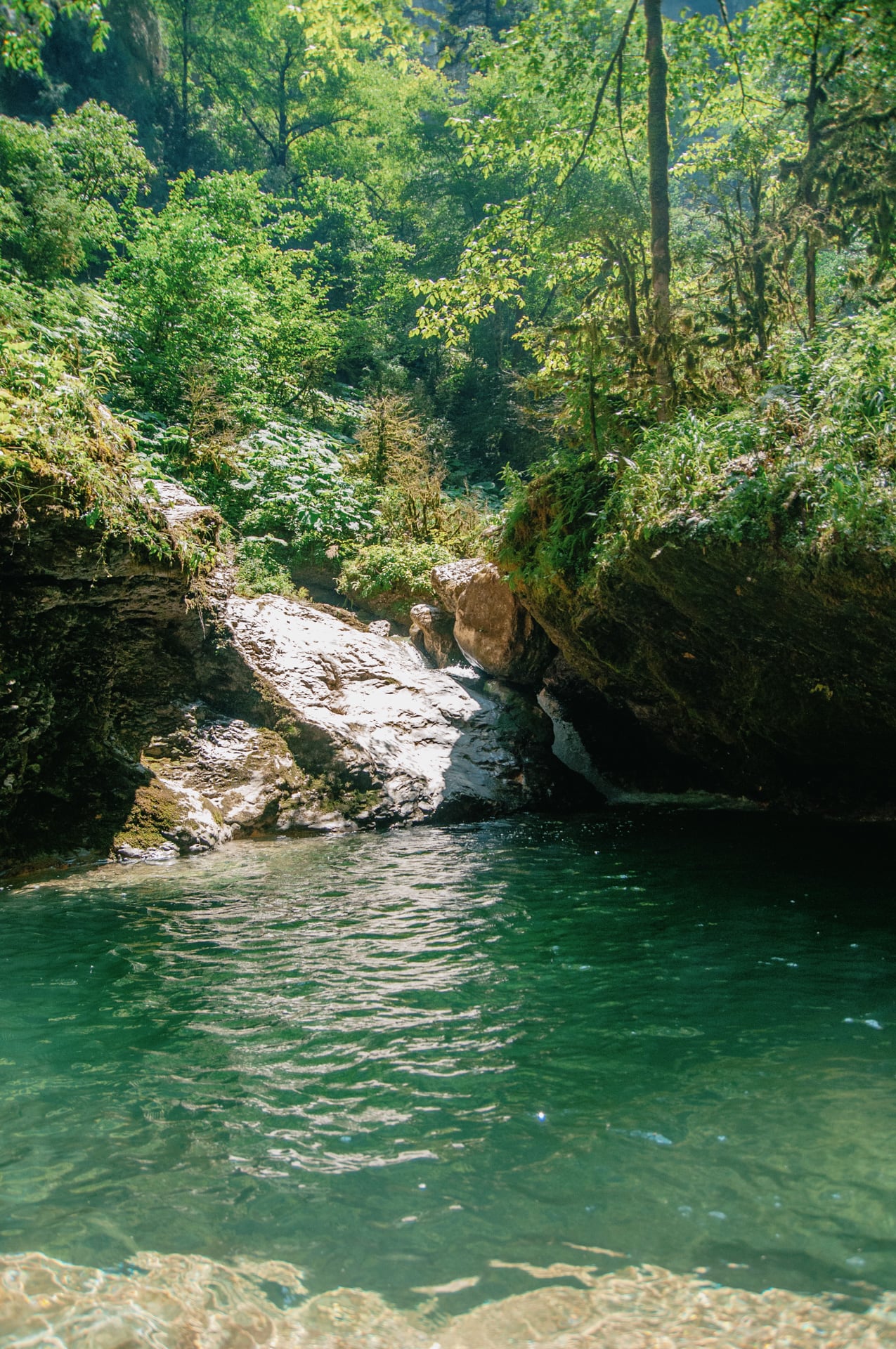 Прямой проход по руслу преградила широкая и глубокая ванна длиной метров в тридцать. Сквозь кристально чистую толщу воды просматривалось дно — глубина ванны достигает четырёх метров.