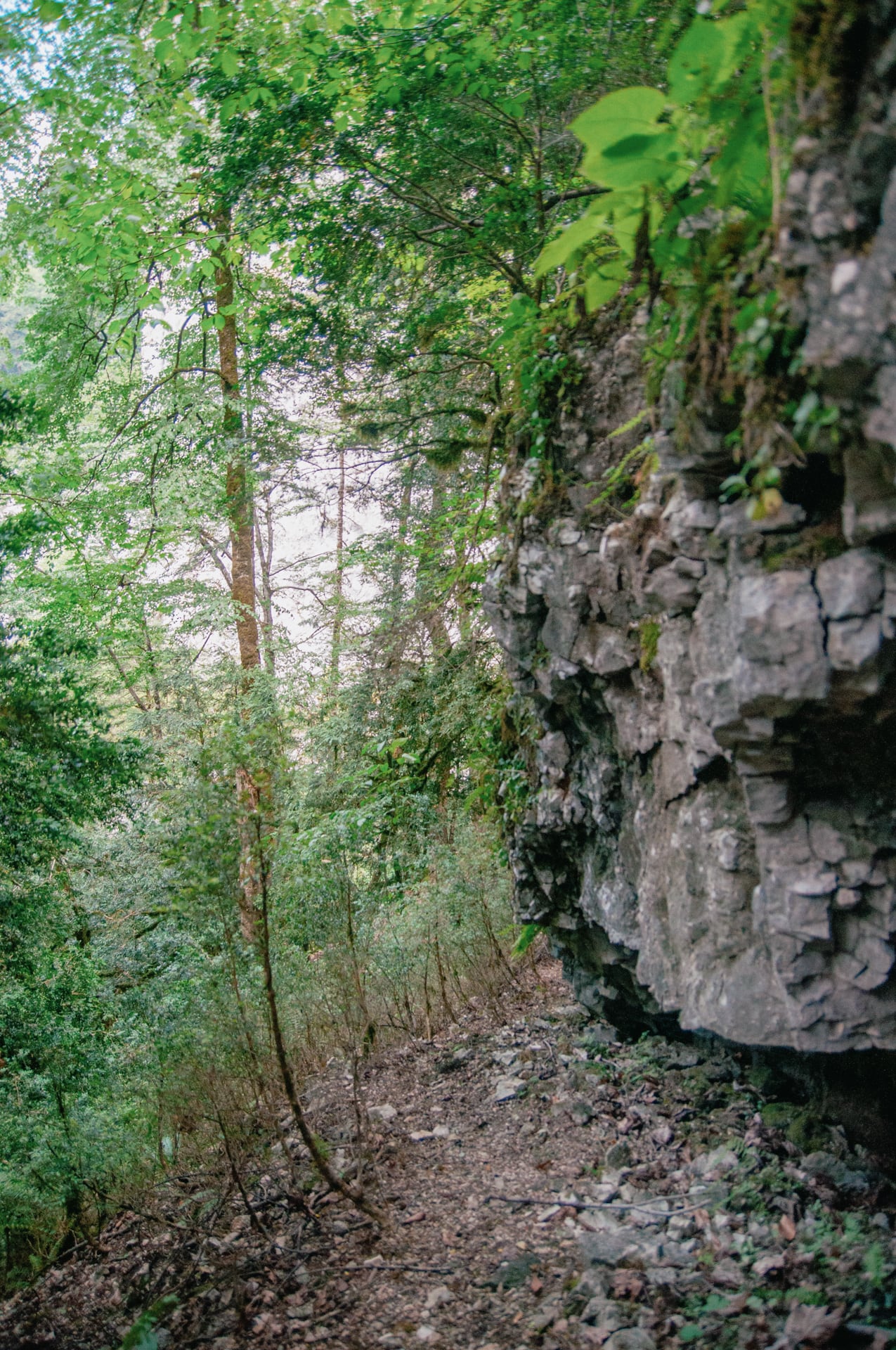 Мы вышли на ровную как тротуар полку. Жалко что она была коротка. Тропа нырнула вниз, мы поползли по землистому, угрожающе крутому склону. Лезли аккуратно, цеплялись за деревья, повязанный добрыми людьми трос, под конец даже немного попрыгали по камням и в итоге спустились к реке.