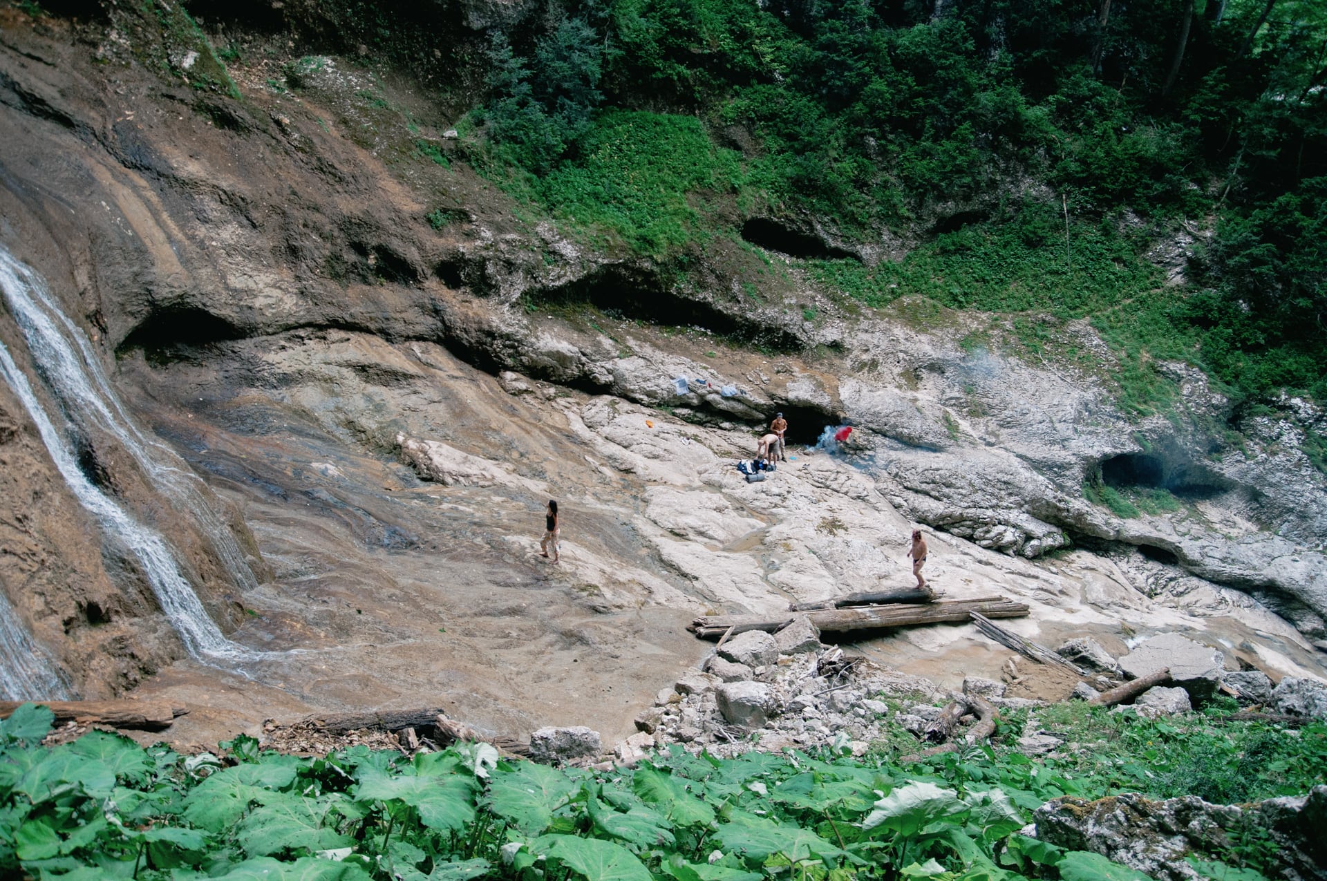 Сложные пороги остались за спиной и мы полезли вниз. На крутом склоне снова помогали деревья: самшиты, поросль бука и граба. У самого подножия вовсе пришлось катиться на пятой точке.