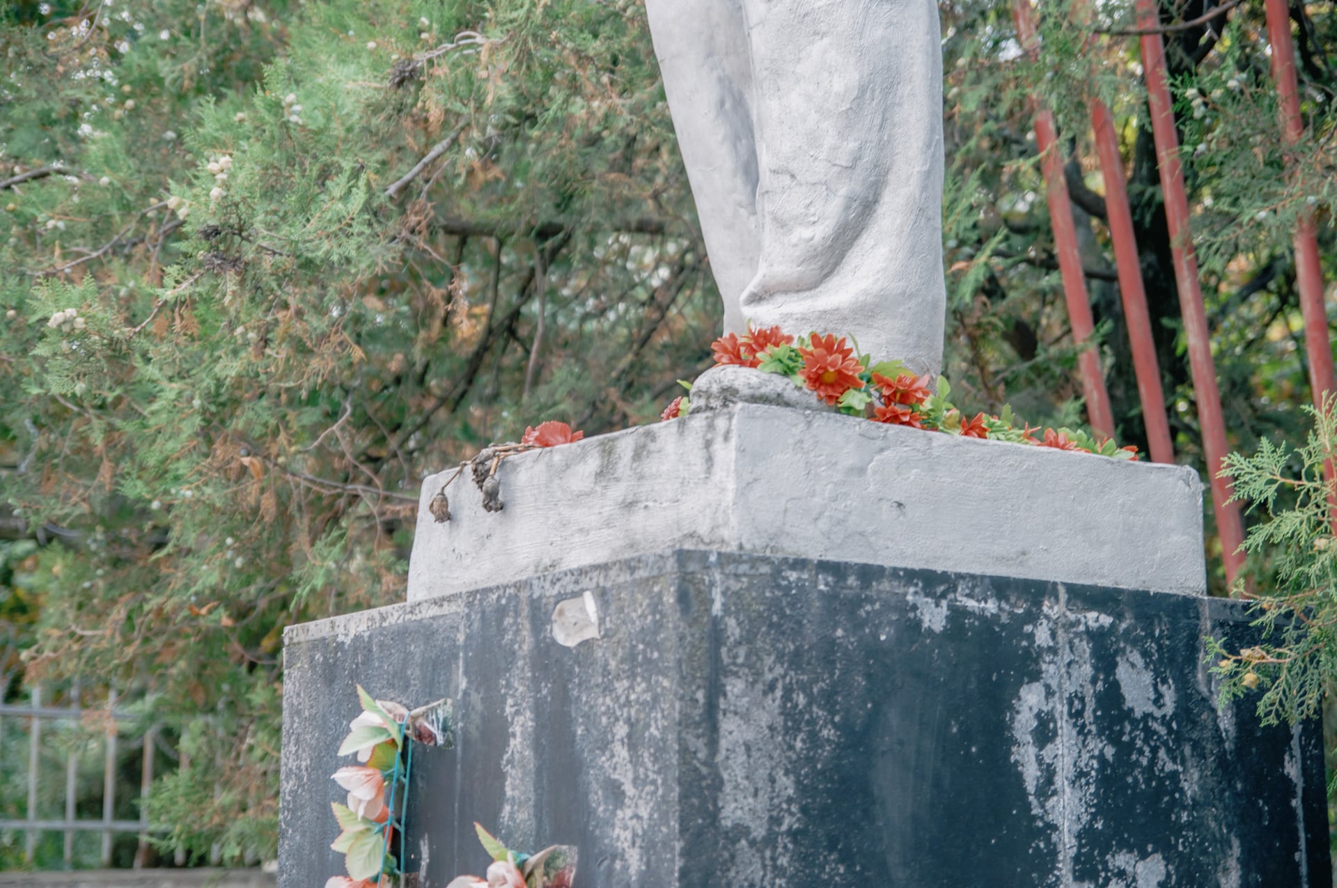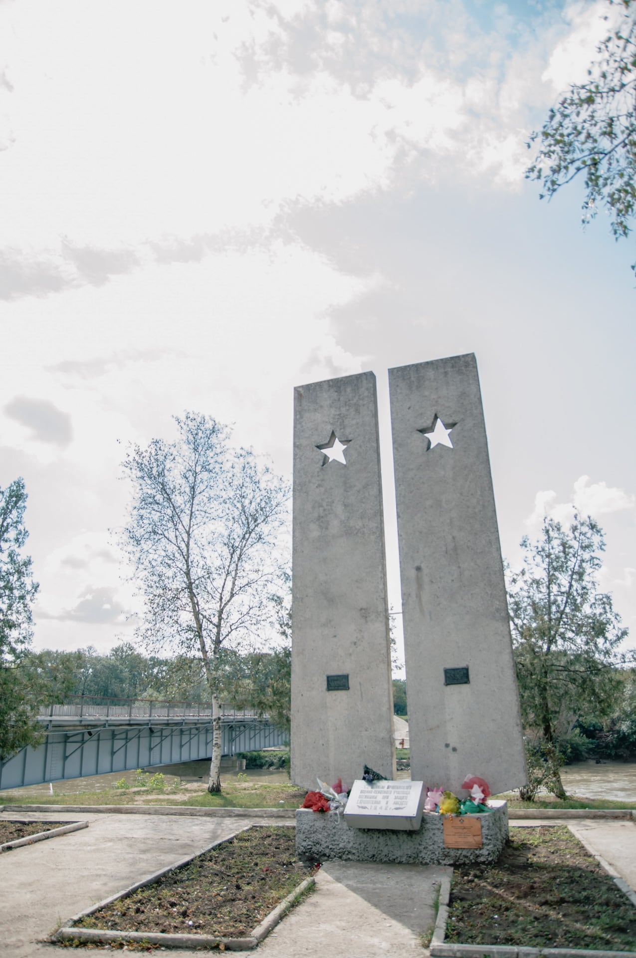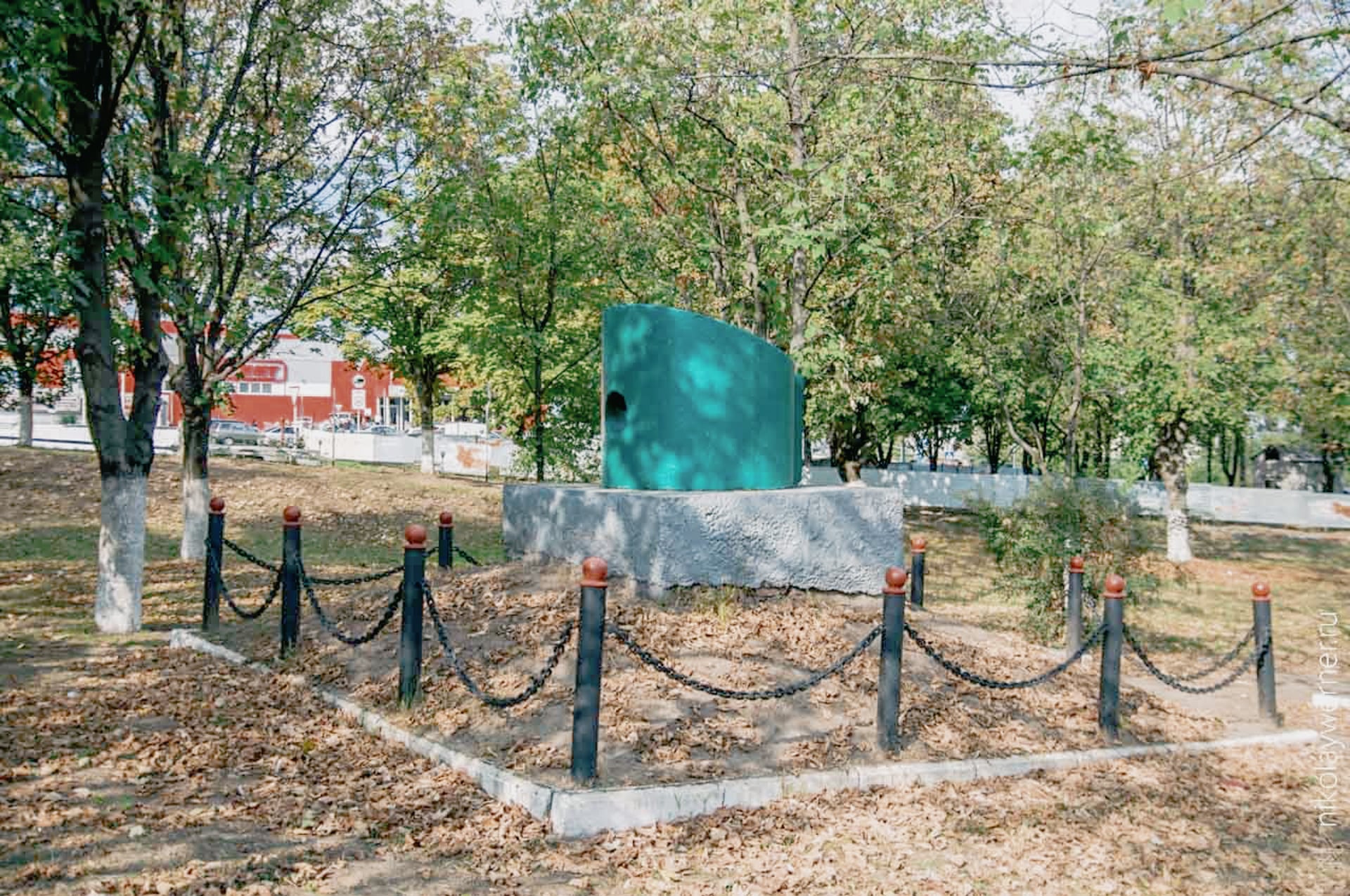 Сразу за переходом ждёт нечто, напоминающее парк, посередине которого стоит кусок бетонной трубы, зачем-то огороженный заборчиком. Оказалось — памятник расстреляным в годы войны.