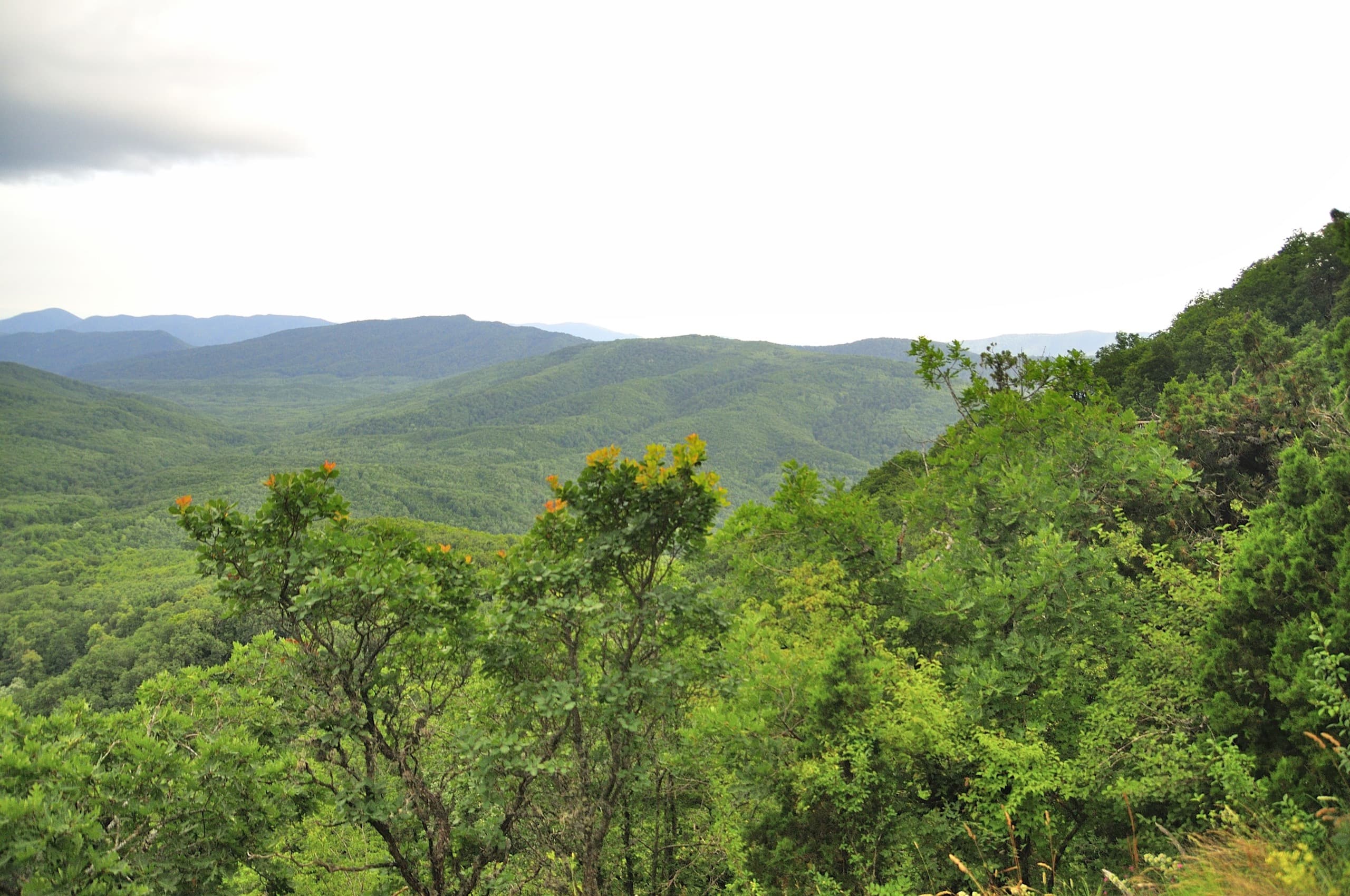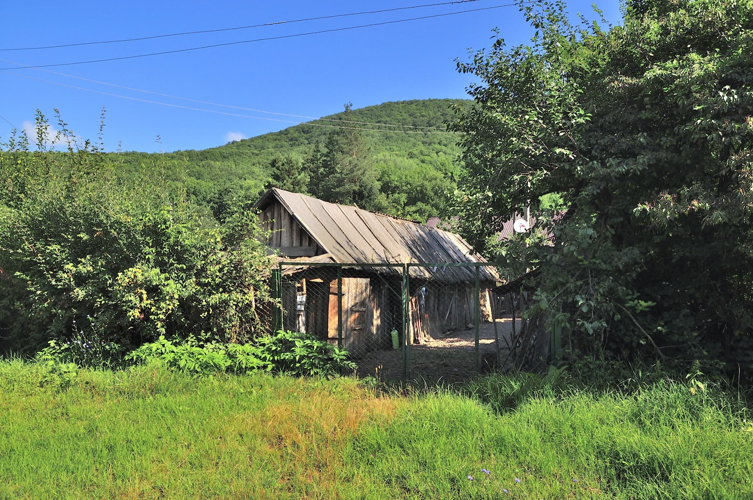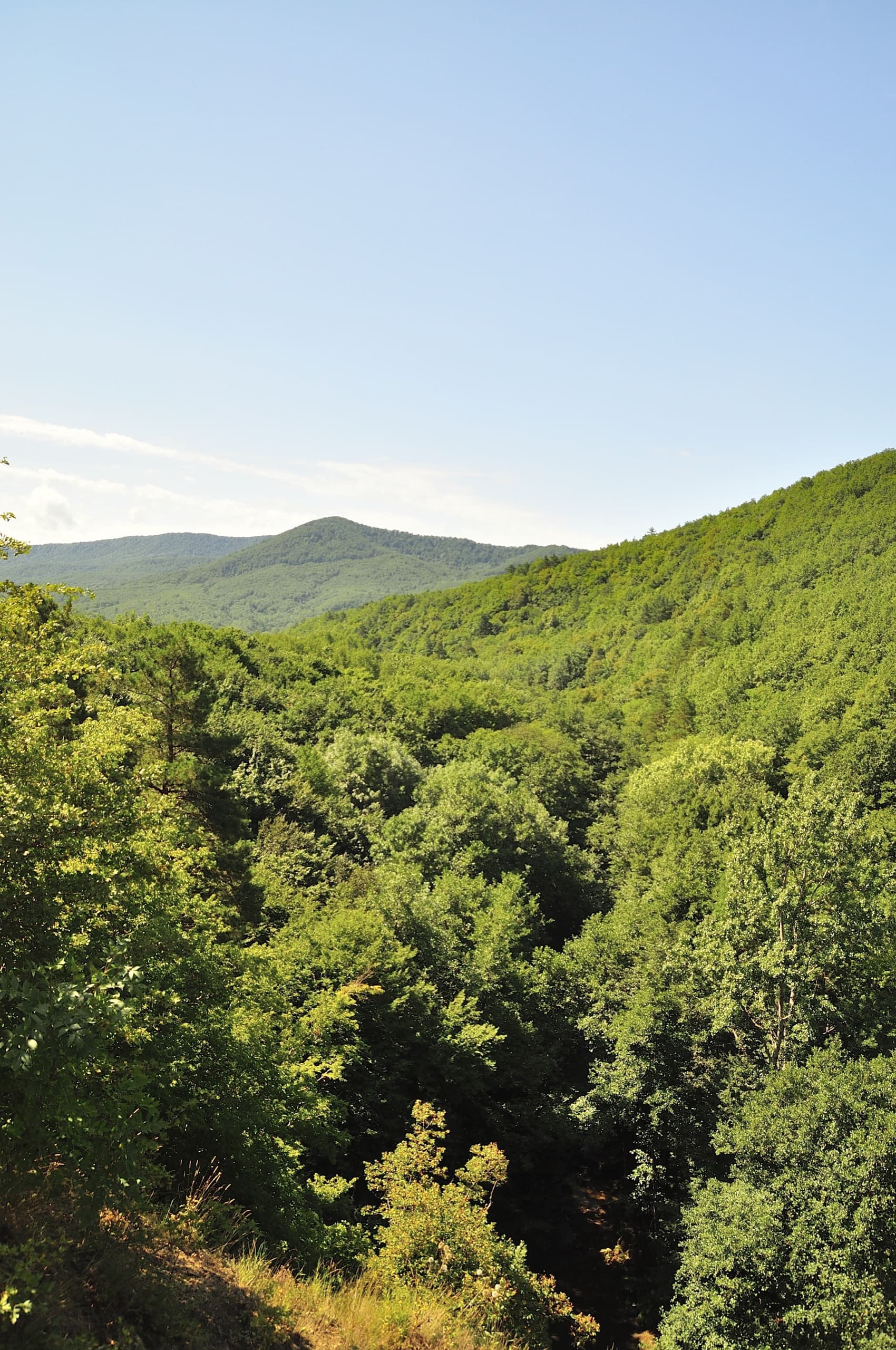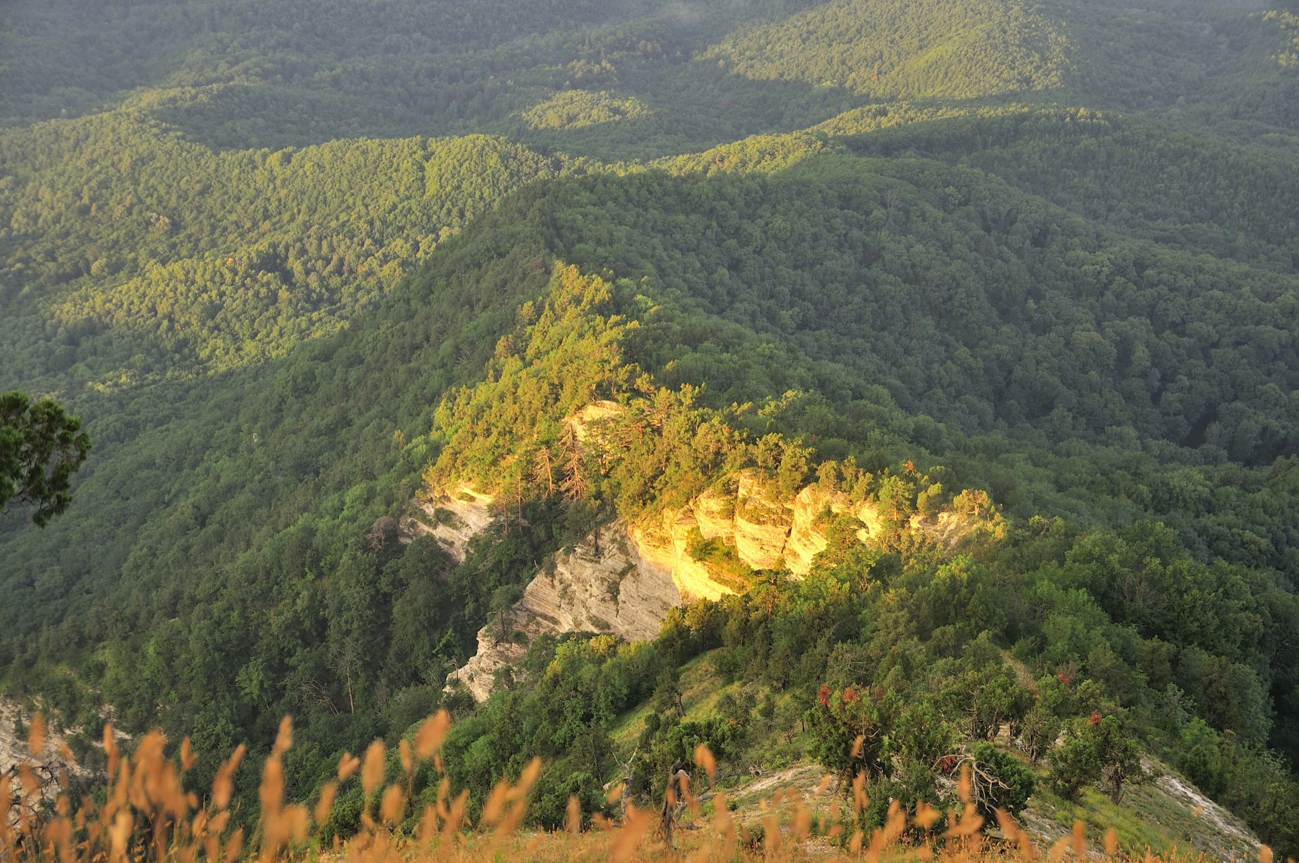 Лес, дорога, лес, дорога, лес дорога, «Нива» пролетела, подняла облако пыли, и снова — лес, дорога, лес, дорога... На полпути к Дубраве открылся симпатичный вид. Дорога забирает выше, склон обрывается, лес разрывается и получается милая обзорная площадка, с которой видно долину Убина, гору Шишан, высотой в 554 метра и Мачмалов хребет. Помнится, в апреле мы выбирались в это место поматрасить в первые тёплые весенние дни, когда лес только начал примерять зелёное платье. Тот вид был интереснее: сквозь голые кроны проглядывалось русло Убина, коричневые камни и земля играли со свежей зеленью и всё это заправляло сочное синее небо. А в июле тоже красиво, но не так — сверху тусклая синева, снизу зелень и дневной летний свет делает всё плоским.