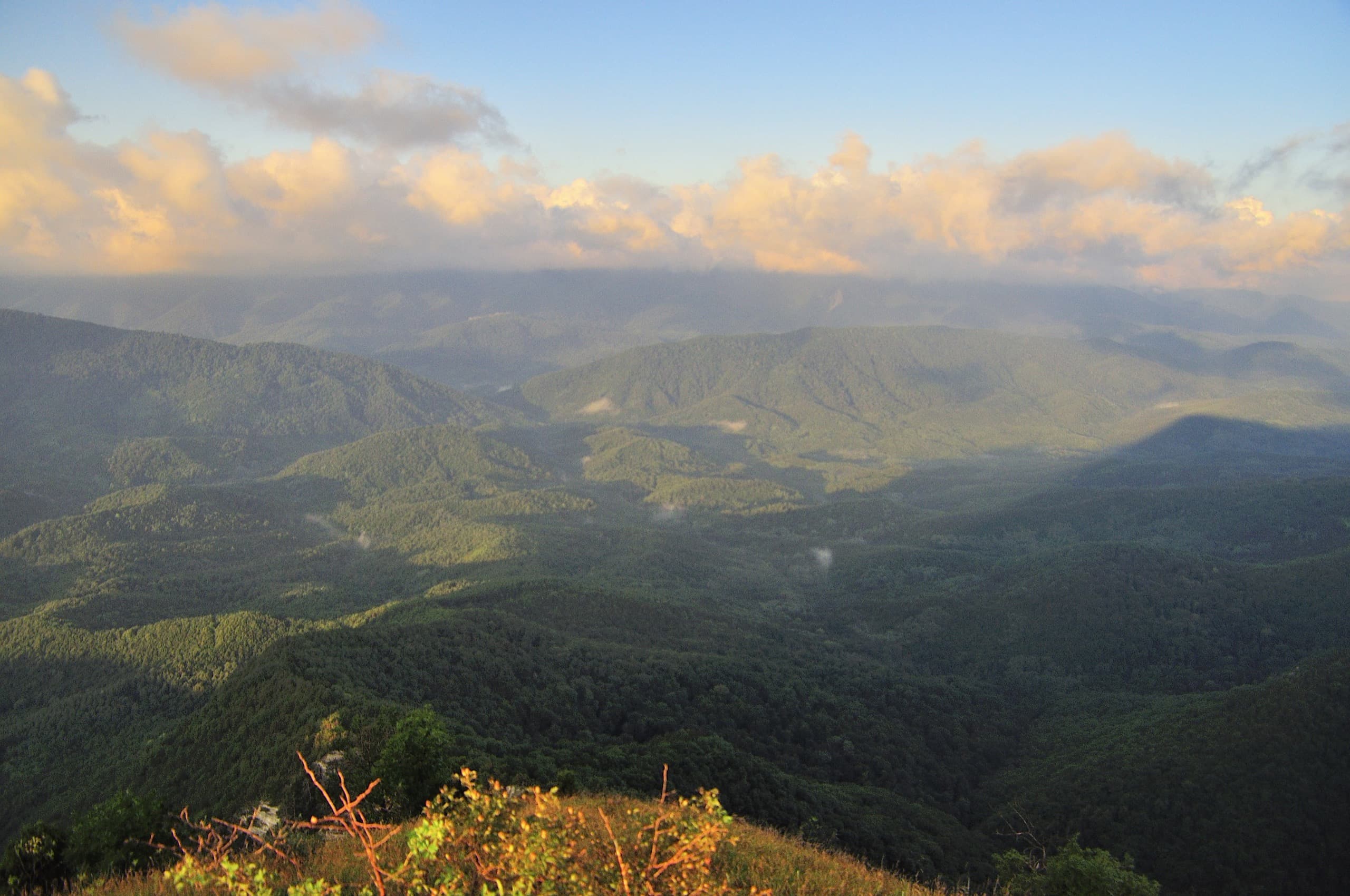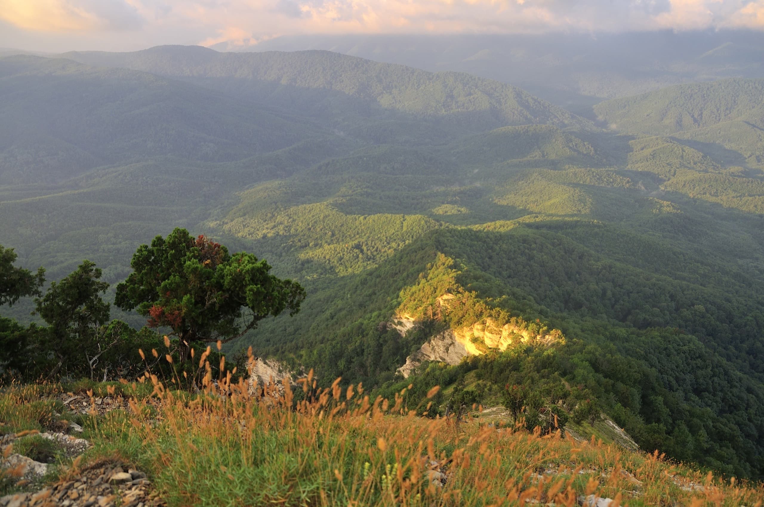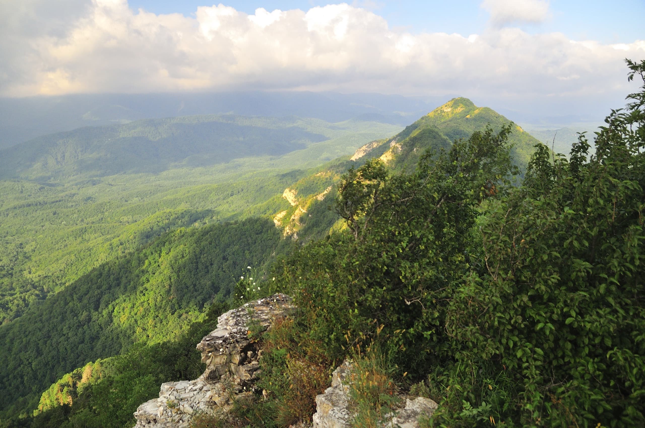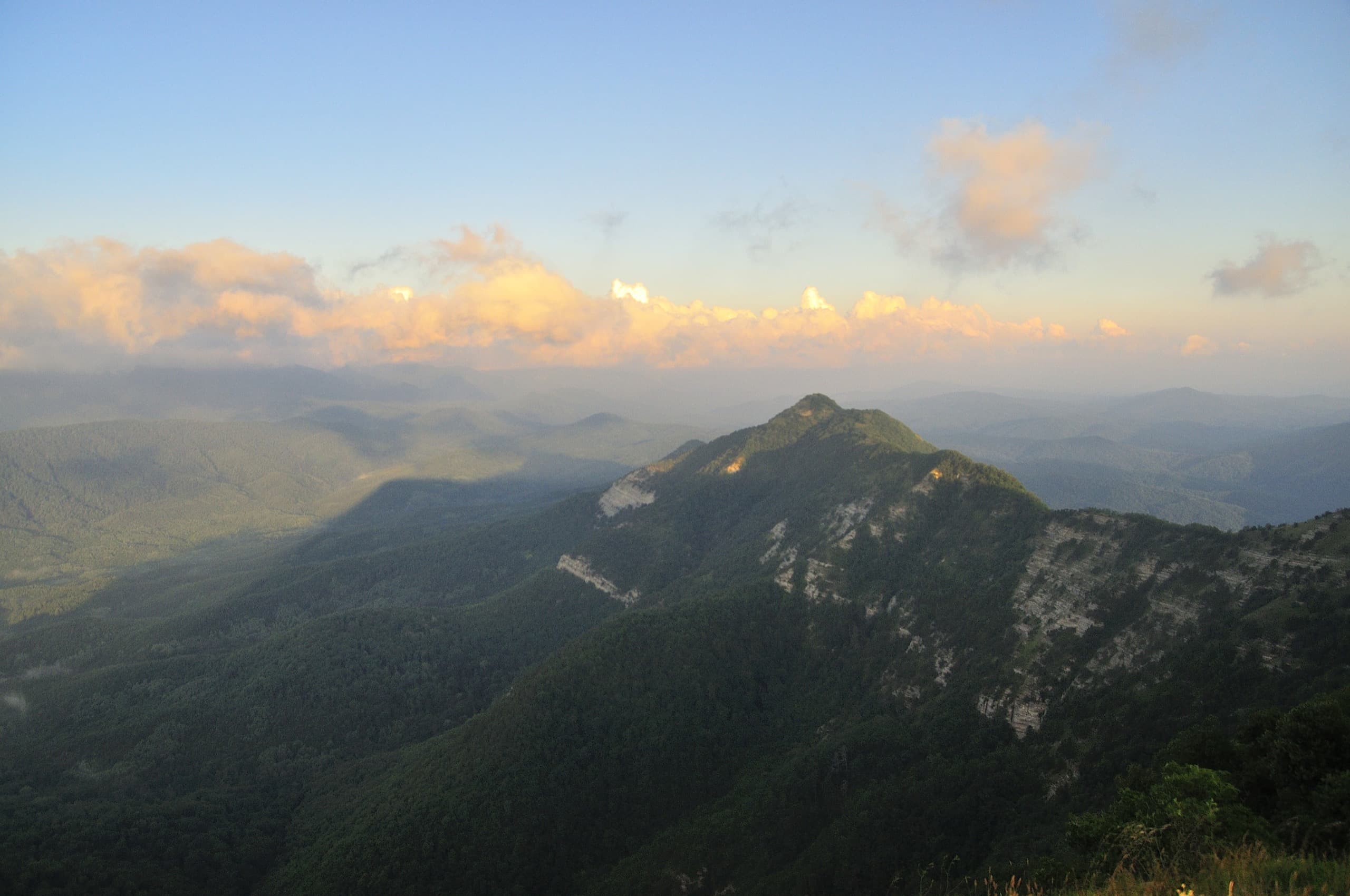 И погода благоволила. От дневной мороси не осталось следа, над головой висело чистое небо и мягкий вечерний свет устилал золотом хребты и долины. Только на северо-западе за хребтом Коцехур клубились облака. Из лёгкой дымки они начали превращаться в тяжёлые свинцово-серые тучи. Облачный фронт рос, силился броситься на нас, но ничего у него не вышло. Мы своими глазами наблюдали как горы влияют на погоду. За главным водоразделом, на берегу моря бушевала непогода, но хребет не дал ей пройти в нашу сторону.