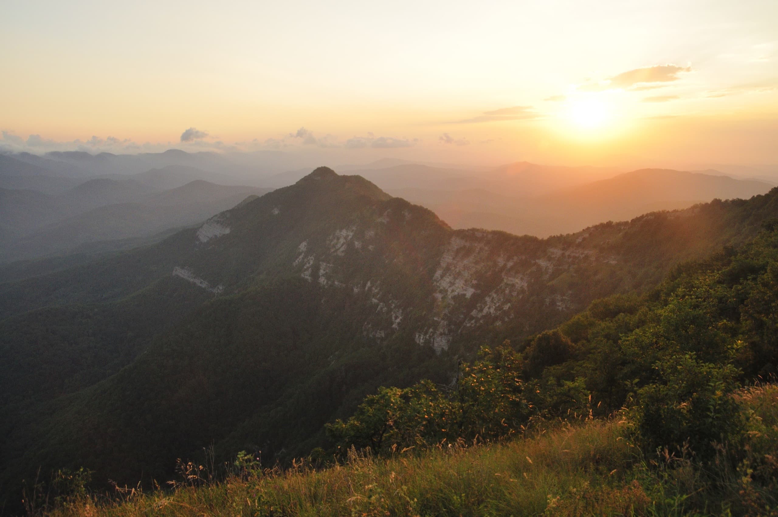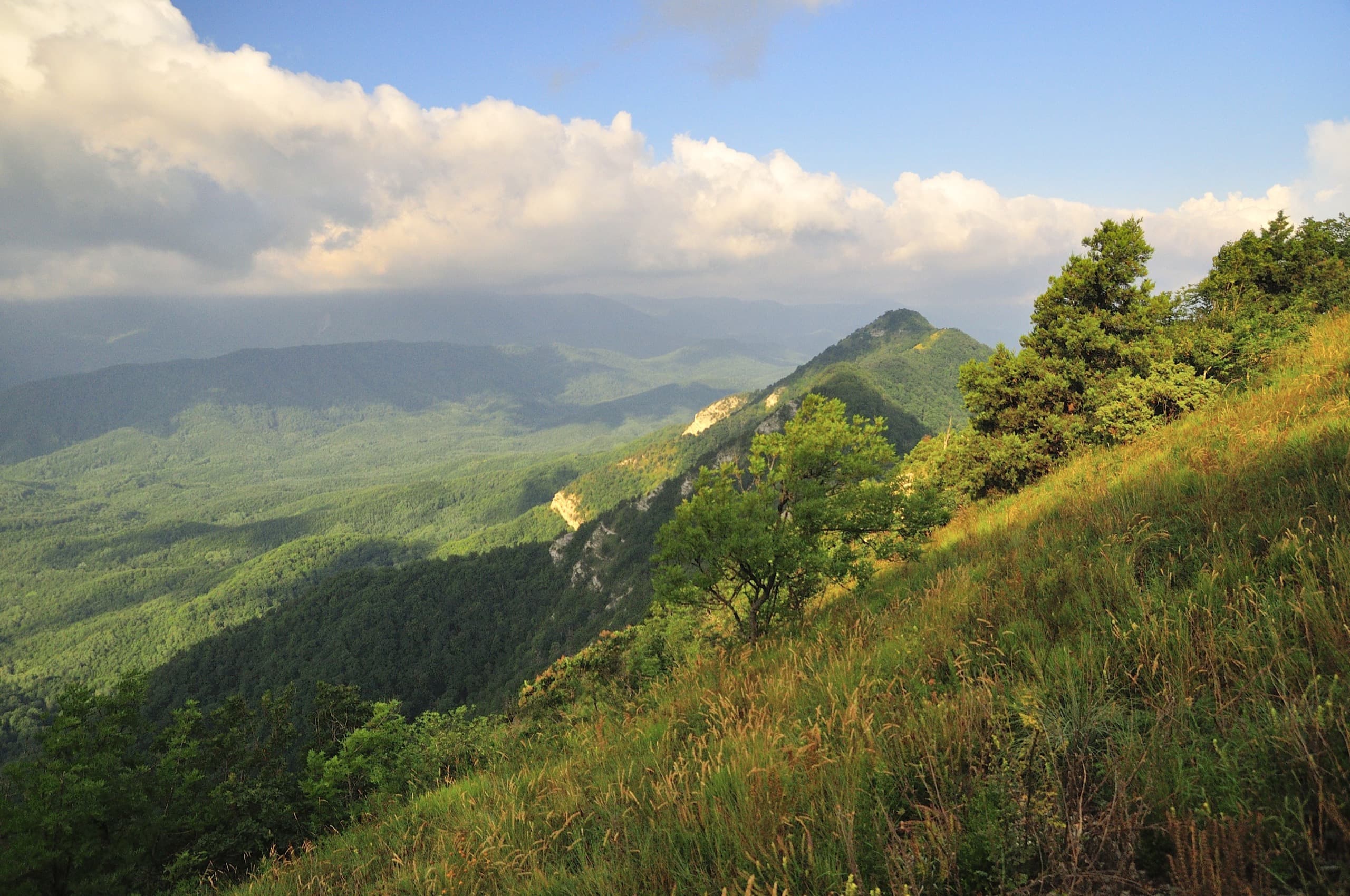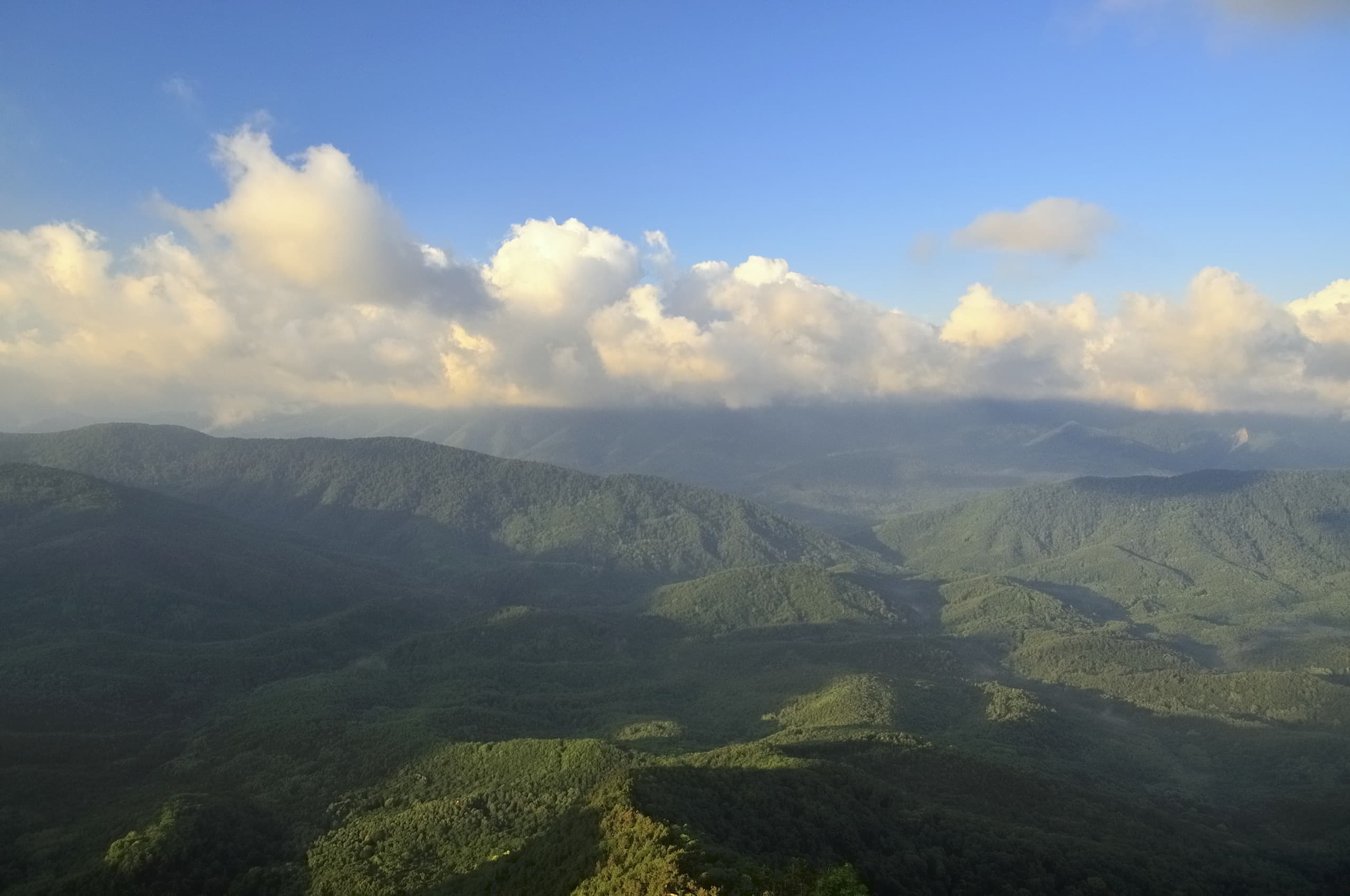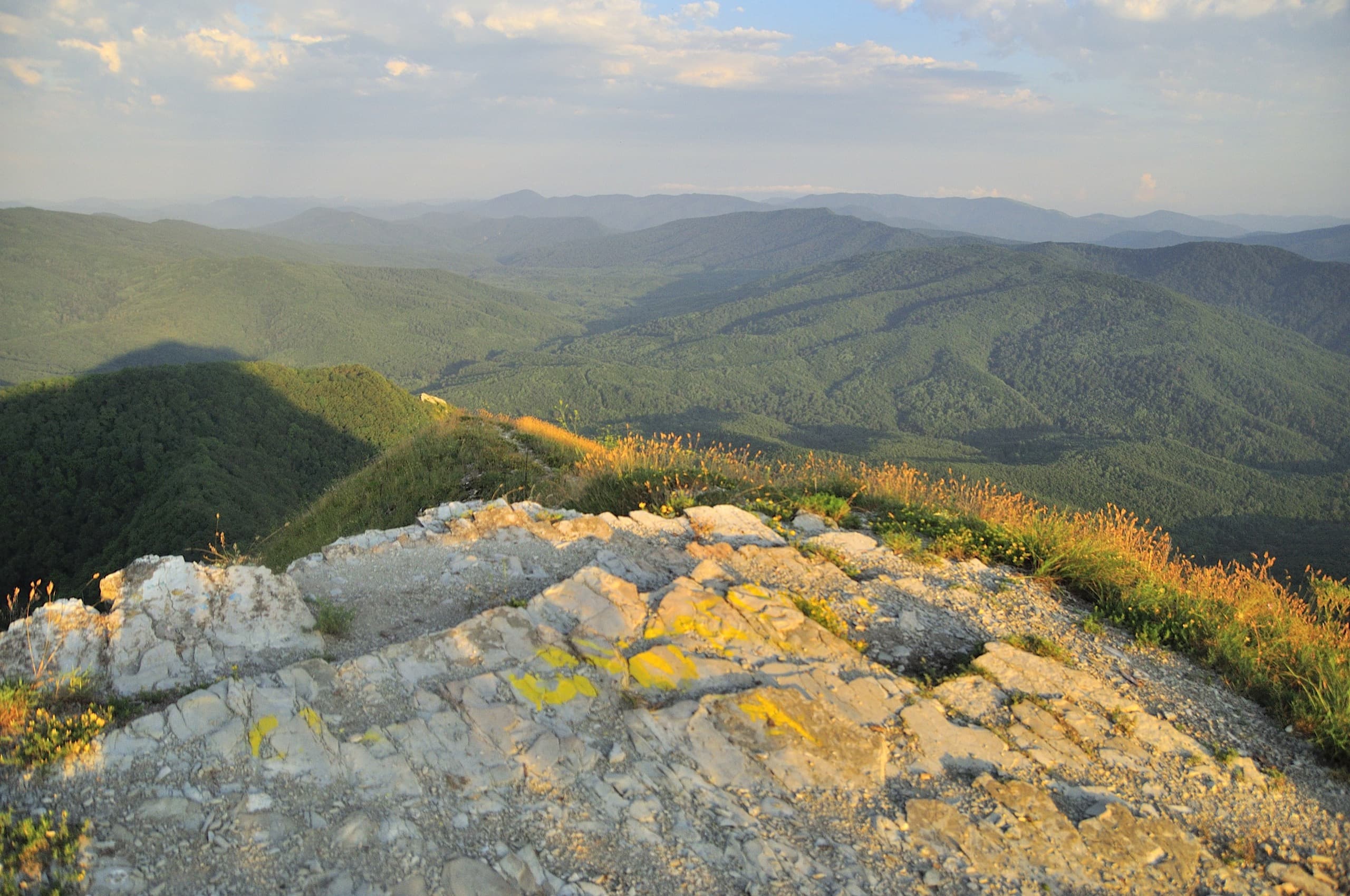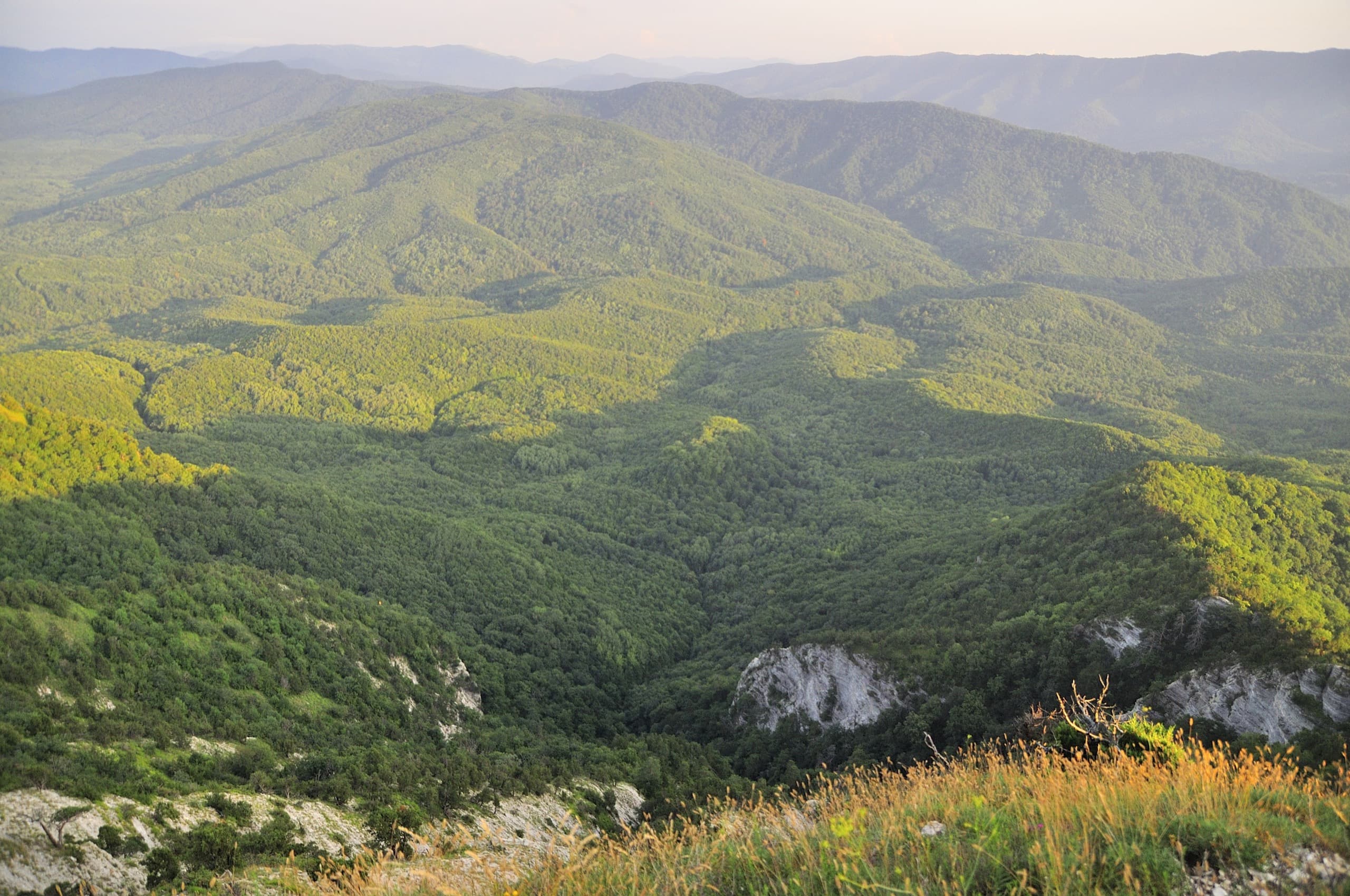 И погода благоволила. От дневной мороси не осталось следа, над головой висело чистое небо и мягкий вечерний свет устилал золотом хребты и долины. Только на северо-западе за хребтом Коцехур клубились облака. Из лёгкой дымки они начали превращаться в тяжёлые свинцово-серые тучи. Облачный фронт рос, силился броситься на нас, но ничего у него не вышло. Мы своими глазами наблюдали как горы влияют на погоду. За главным водоразделом, на берегу моря бушевала непогода, но хребет не дал ей пройти в нашу сторону.
