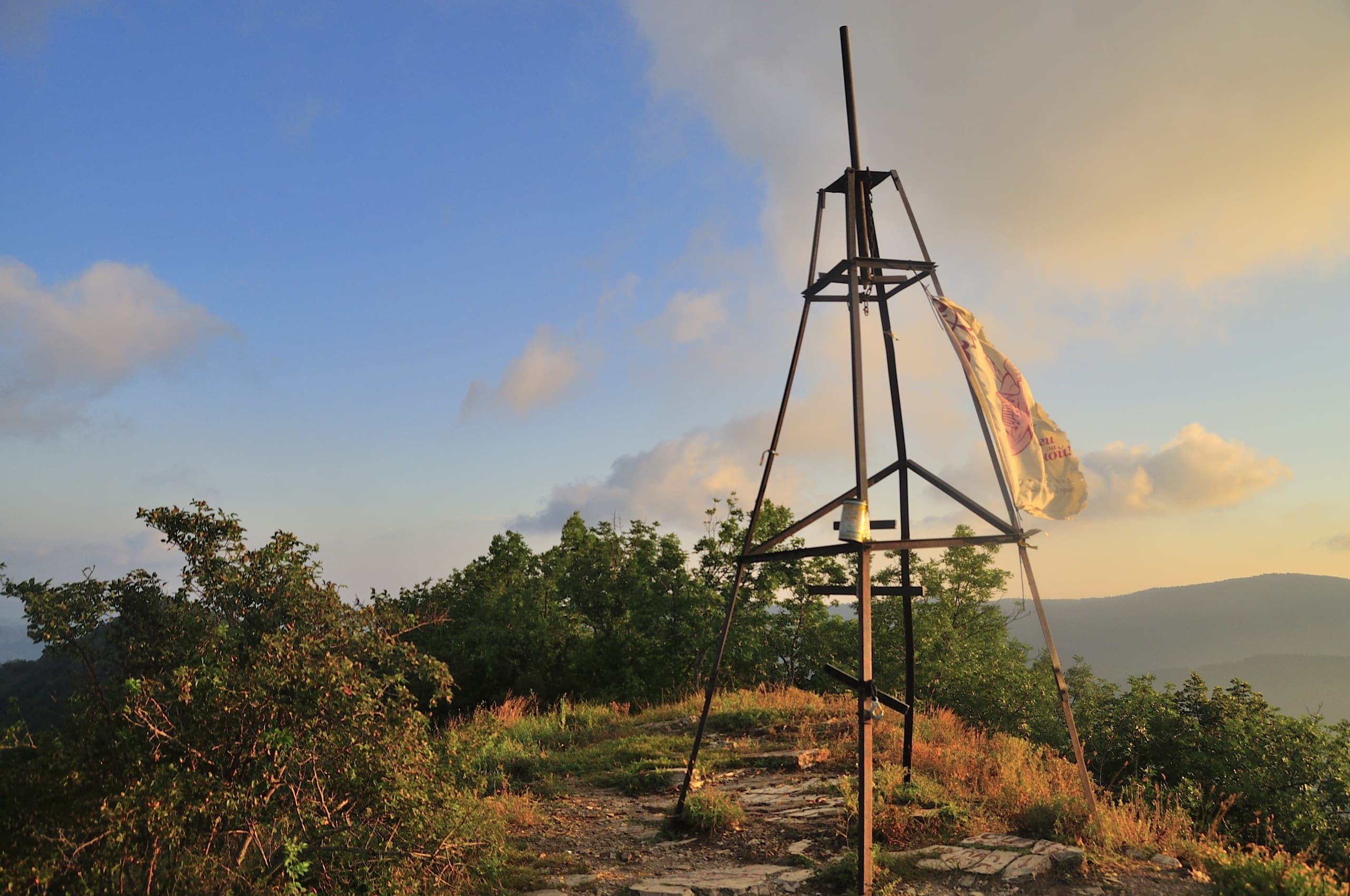 Мы всё это время сидели на вершине у триангуляционного пункта, кушали, любовались, щёлкали затворами. А ещё оставили в банке автограф, её за неделю до нас оставила на горе группа из Ейска.