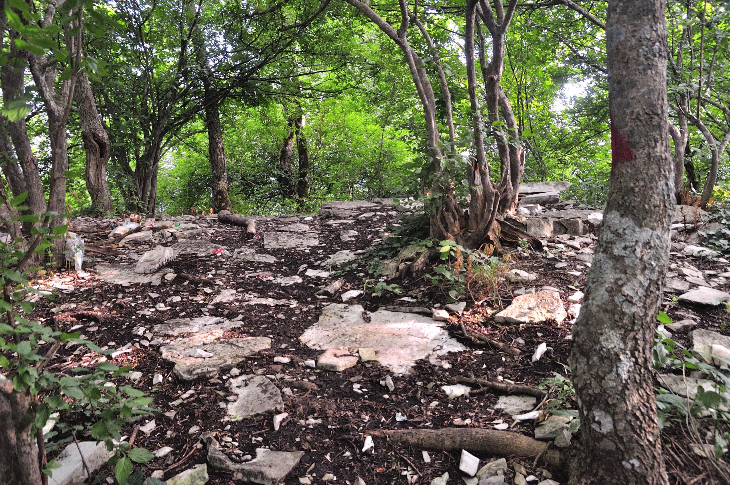 Забрались на небольшой скальный уступ и вернулись в густой лес. Здесь располагается отметка в 716 метров — Восточный Папай. Сквозь ветви начал проглядываться силуэт главной вершины. Я прозвал это место Папайской ступенью — после крутого подъёма ровный, удобный участок, за которым новый подъём, а за ним вершина.