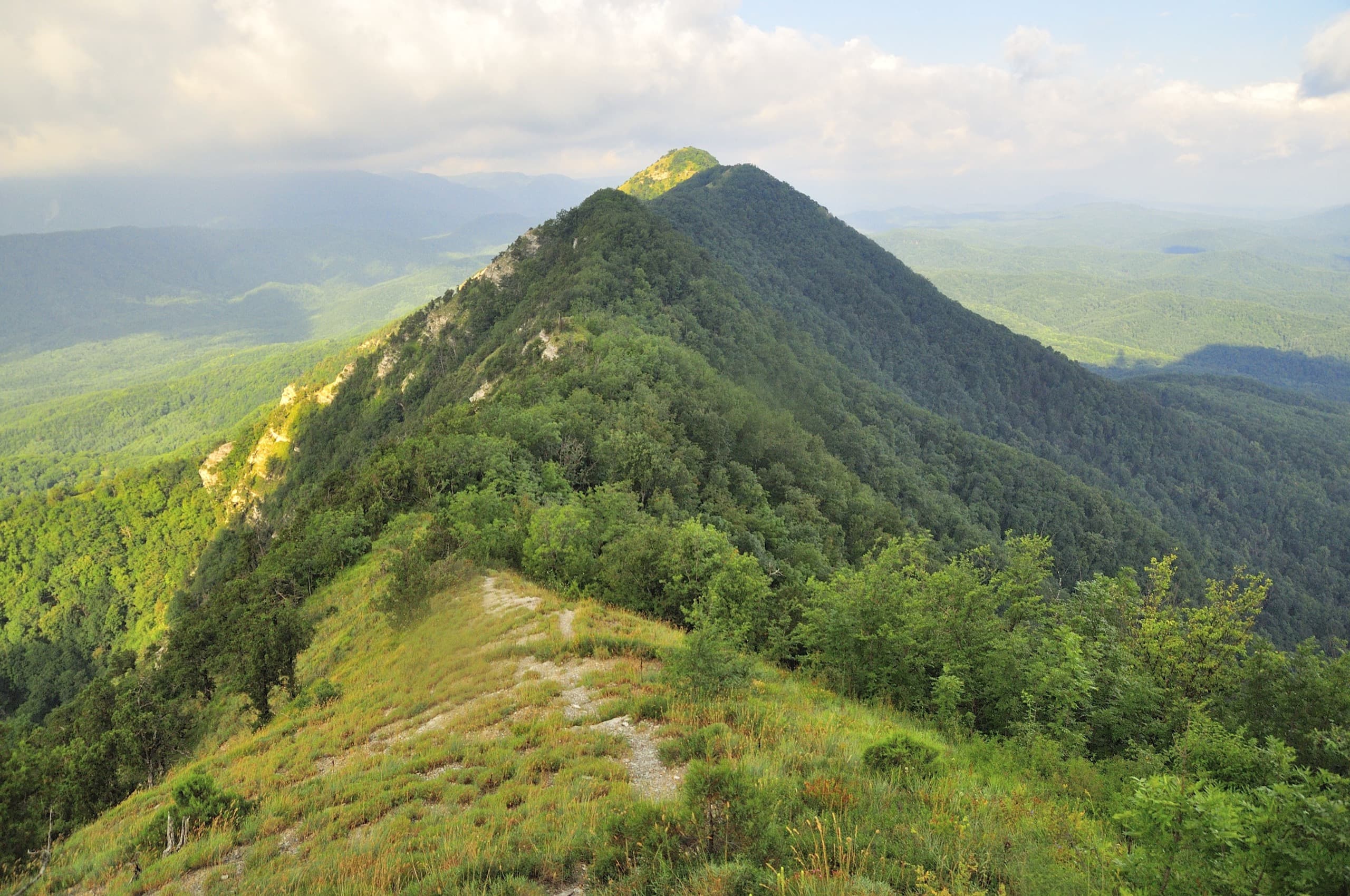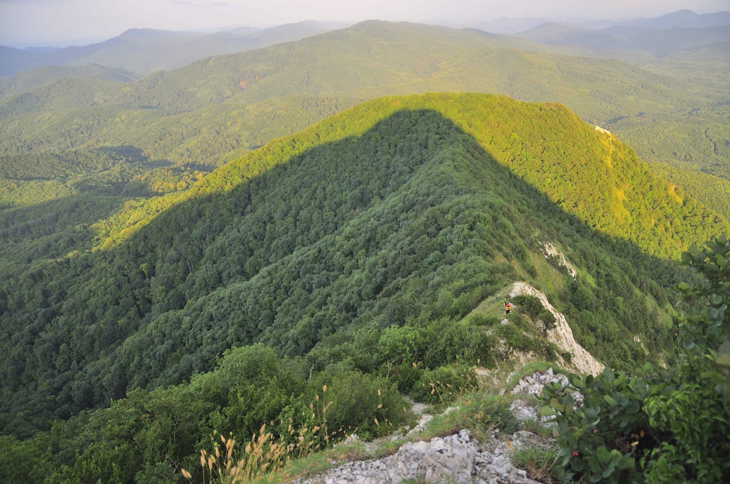 Вышли мы в половине девятого. За пару минут дошли до Центрального Папая. Неприметная вершина, видов с неё не открывается, лес завален камнями — палатку будет поставить проблематично. Зато в двух шагах начинается скалистый гребень, ведущий к Западному Папаю, в народе его прозвали «папайской пилой».