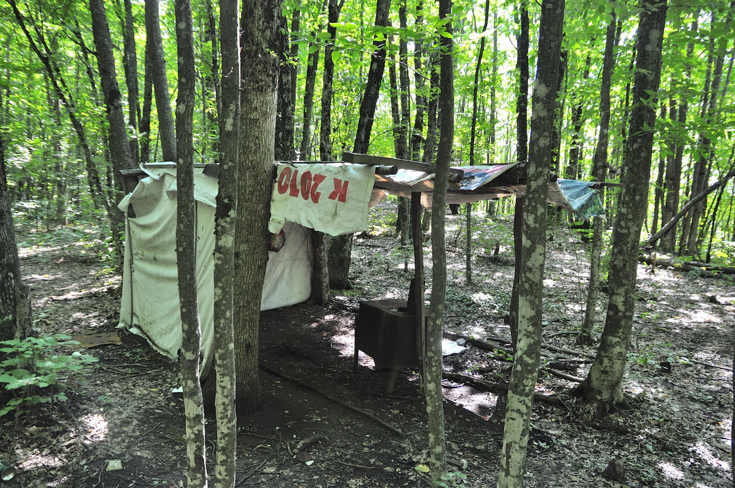 Под западным склоном нашли балаган: крыша, буржуйка, да одна стена из баннера. Родник у балагана высох и смысла задерживаться мы не увидели.