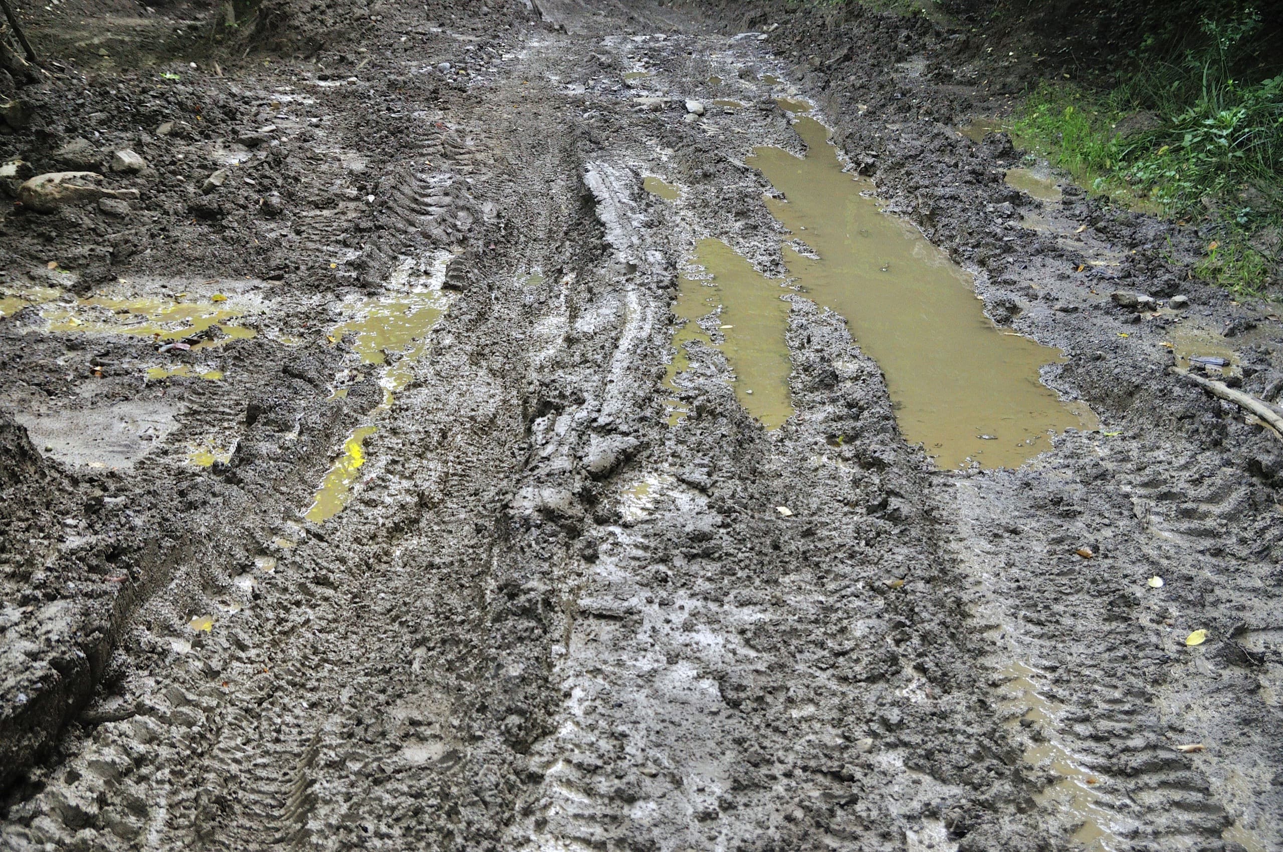 День перевалил за середину, мы переваливали за половину пути до начала подъёма. После Запорожского источника заканчиваются явные контрольные точки, путь достигает апогея скучности. Километр за километром грязная разбитая дорога, причём если после «Дубравы» грязь была сносной, то после источников гигантские грязевые ванные идут одна за другой, обходим их по тонкой бровке у обочины, балансируя чтобы не упасть в противную жижу.