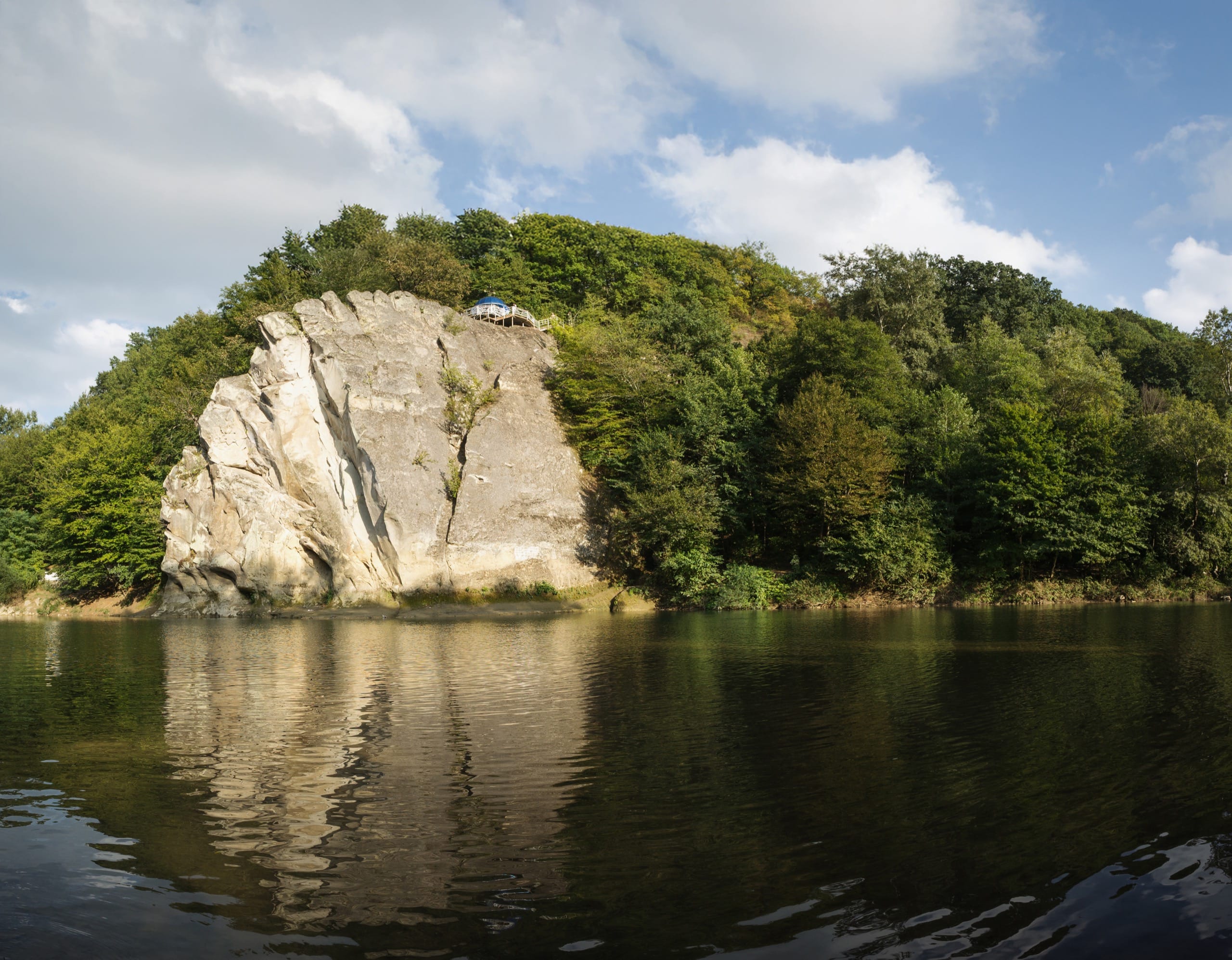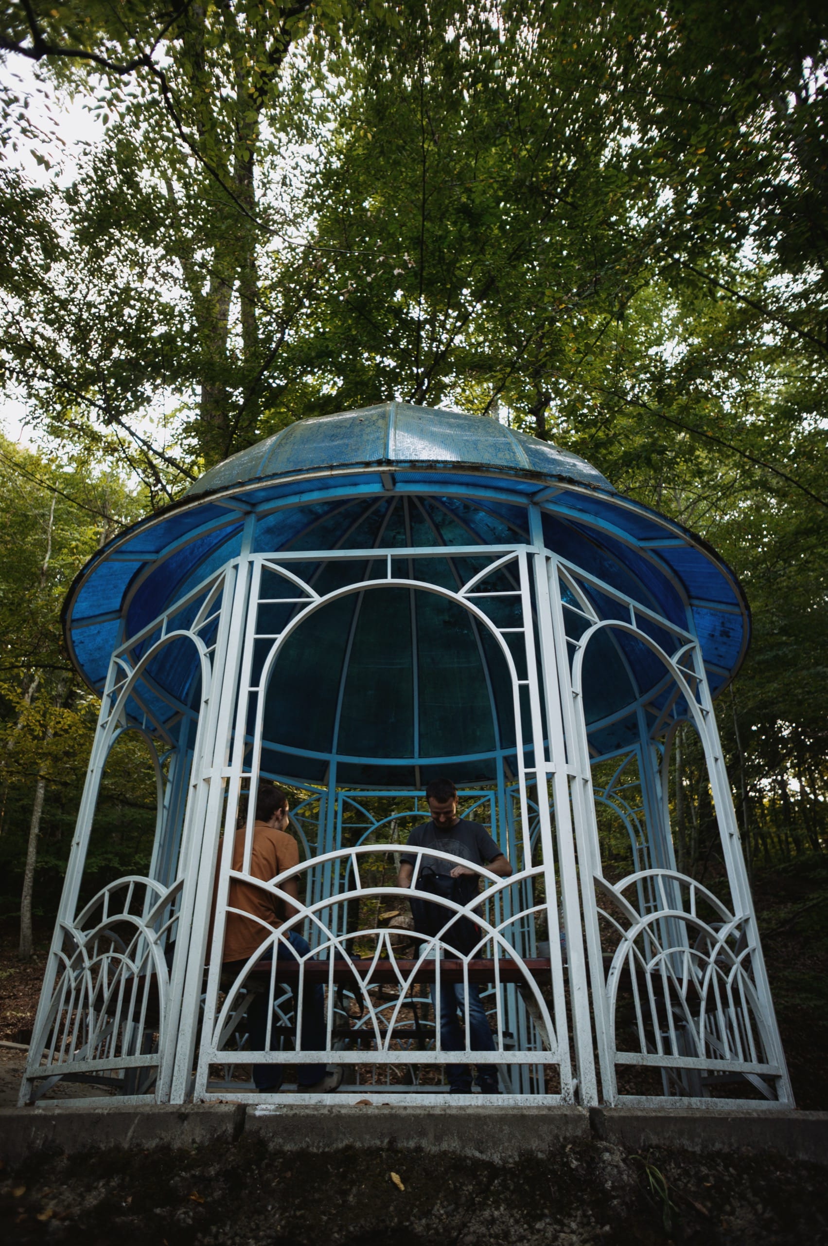 Автор (в рыжем поло) сидит в беседке на скале Петушок.