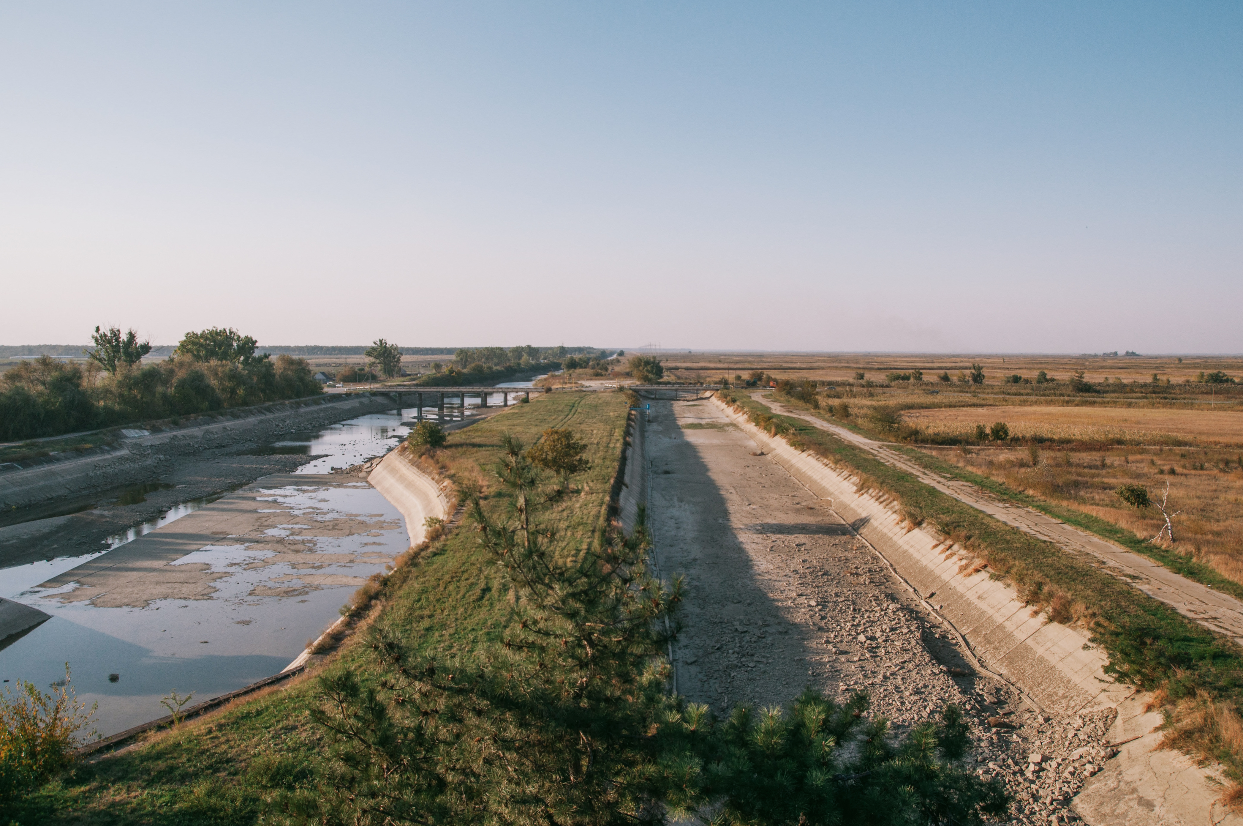 Основная плотина с судоходным шлюзом располагается на русле Кубани у хутора Екатерининский. Туда мы в этот раз не заезжали, а ограничились осмотром заброшенных зданий у хутора Прикубанский, нависших над руслом магистрального канала.