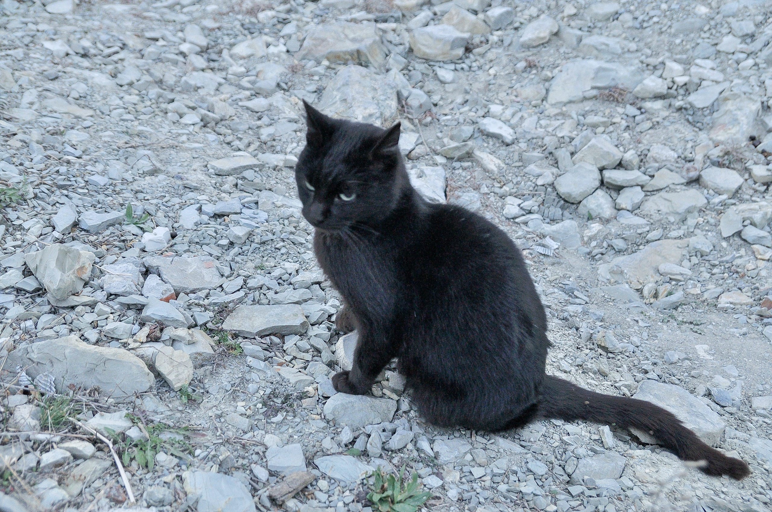 На подъёме повстречался чёрный-чёрный кот, которому мы приглянулись и он вместо перебегания дороги начал юлить под ногами, выпрашивая еды, ну или на худой конец почесон за ухом. Кот, которого я в честь хребта окрестил Маркотом, получил шикарный почесон, но пожрать не вышло.