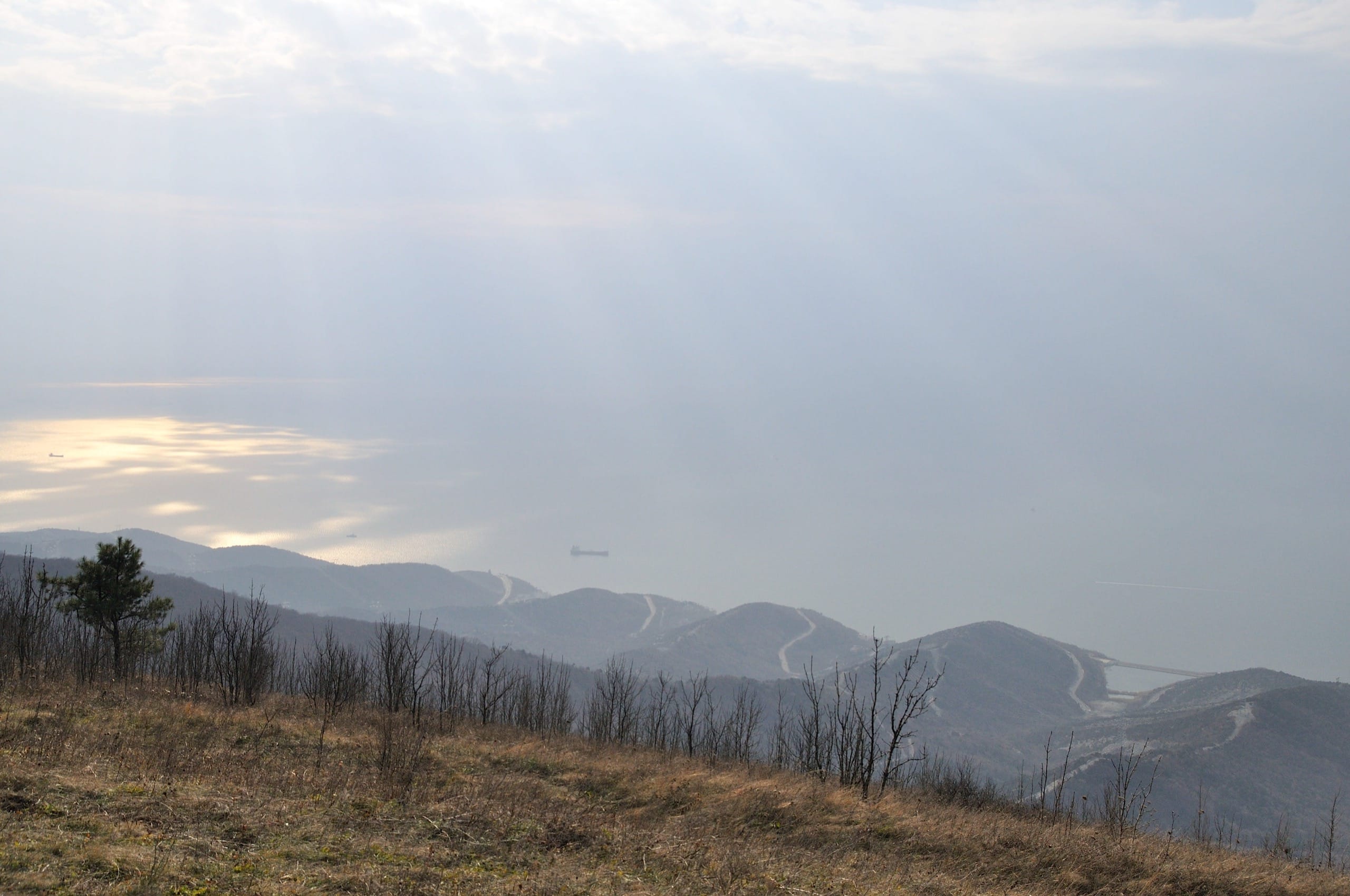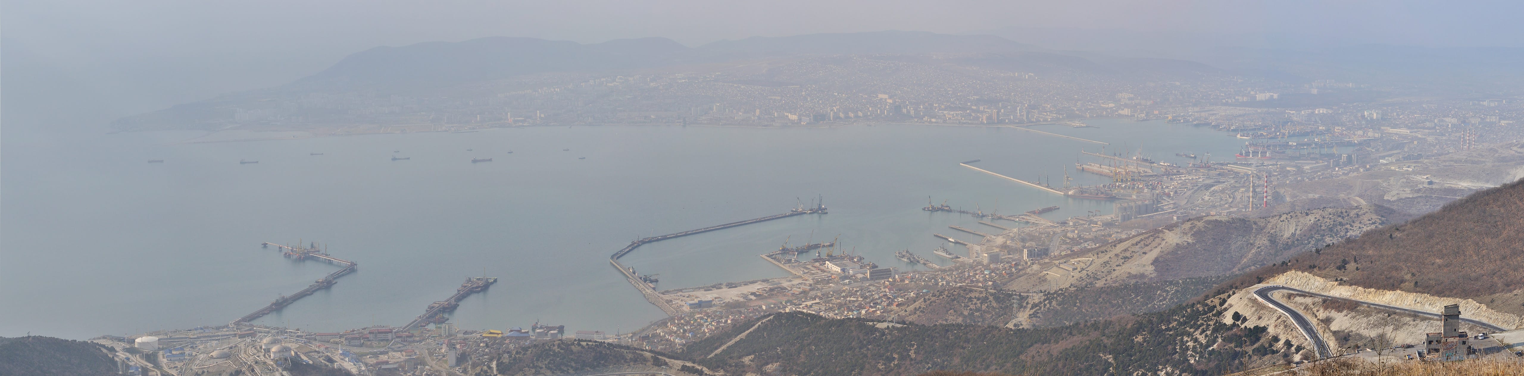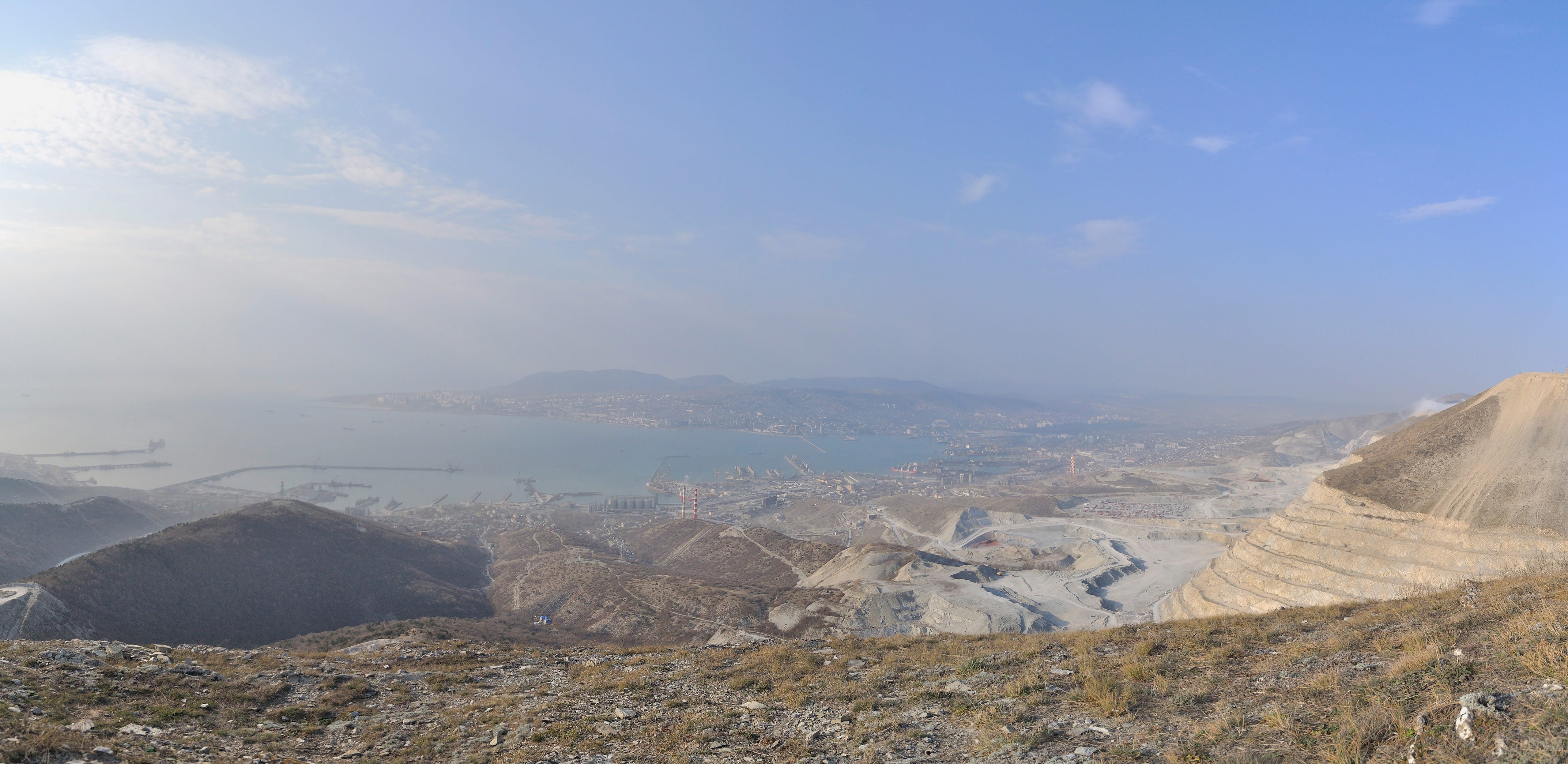 Карьеры будто чуждая жизни мёртвая планета, населённая бескровными механизмами. Как букашки, бегают машины по пепельной пустыне и грызут её, грызут, грызут. За карьерами территория порта: от военной базы слева до обширных грузовых терминалов справа. У причалов и на рейде многочисленные корабли: от мелких буксиров до огромных танкеров. Основная же часть города на другой стороне бухты, стоит прикрытая лёгкой сизой дымкой. Должно быть невероятно красиво посмотреть этот же вид ночью, когда город вспыхнет огнями.