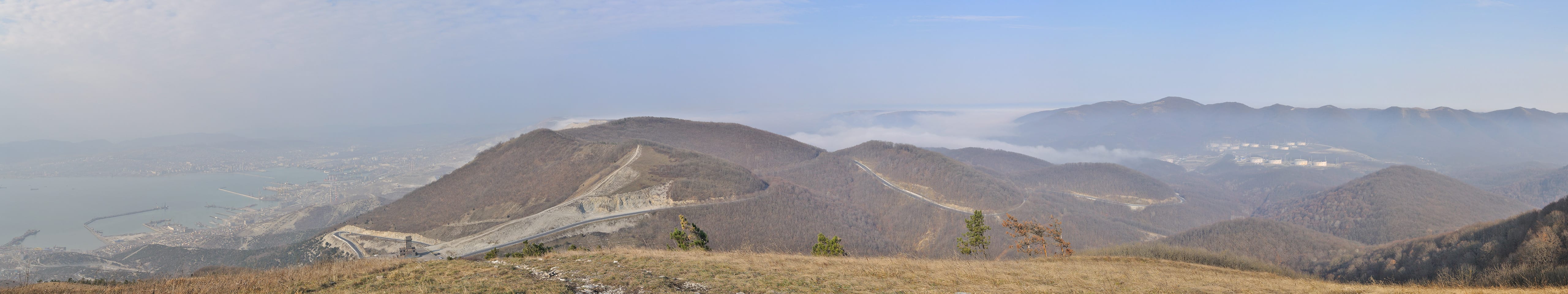 Вид с площадки у ресторана, конечно, крут, но нас заинтересовала лысая безымянная вершина, подпирающая перевал с востока, на неё ведёт тупиковая дорога. Решили сделать крюк и забраться — оно того стоило, если вы когда-нибудь будете здесь, не поленитесь потратить полчаса своего времени, зайдите на эту высоту — вид с Семи ветров нервно курит в сторонке. На 330 градусов разворачивается потрясащая панорама: от нефтебазы Грушевой и стоящих за ней гор Купиева, Шриль, Еременкова, через всё ещё залитую туманом (полдень, однако) долину Богаго, к Сахарной голове, Андреевскому перевалу и дальше к Новороссийску и Цемесской бухте.