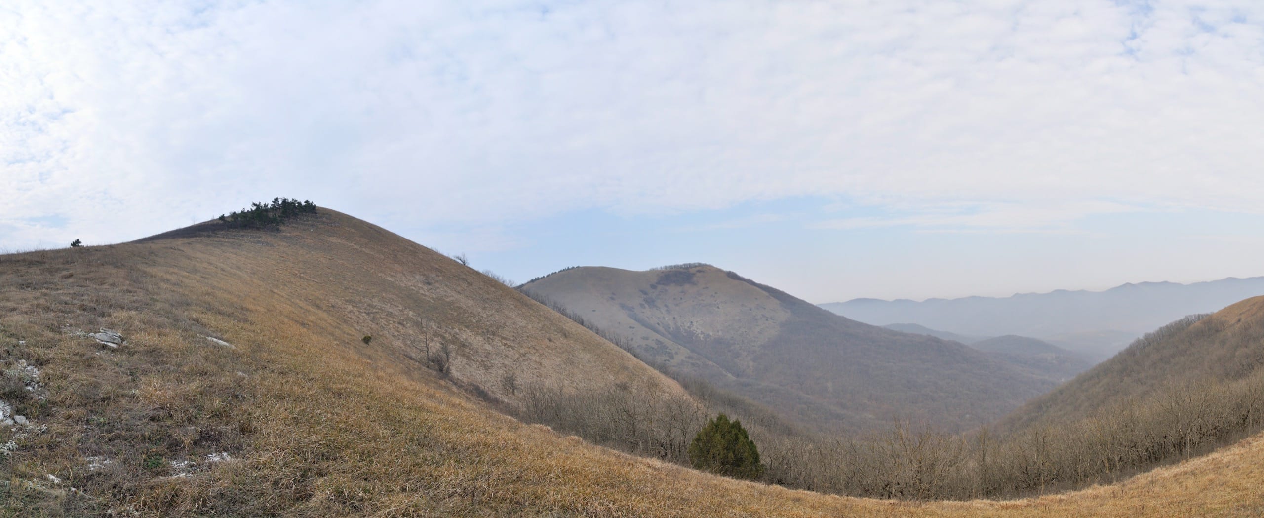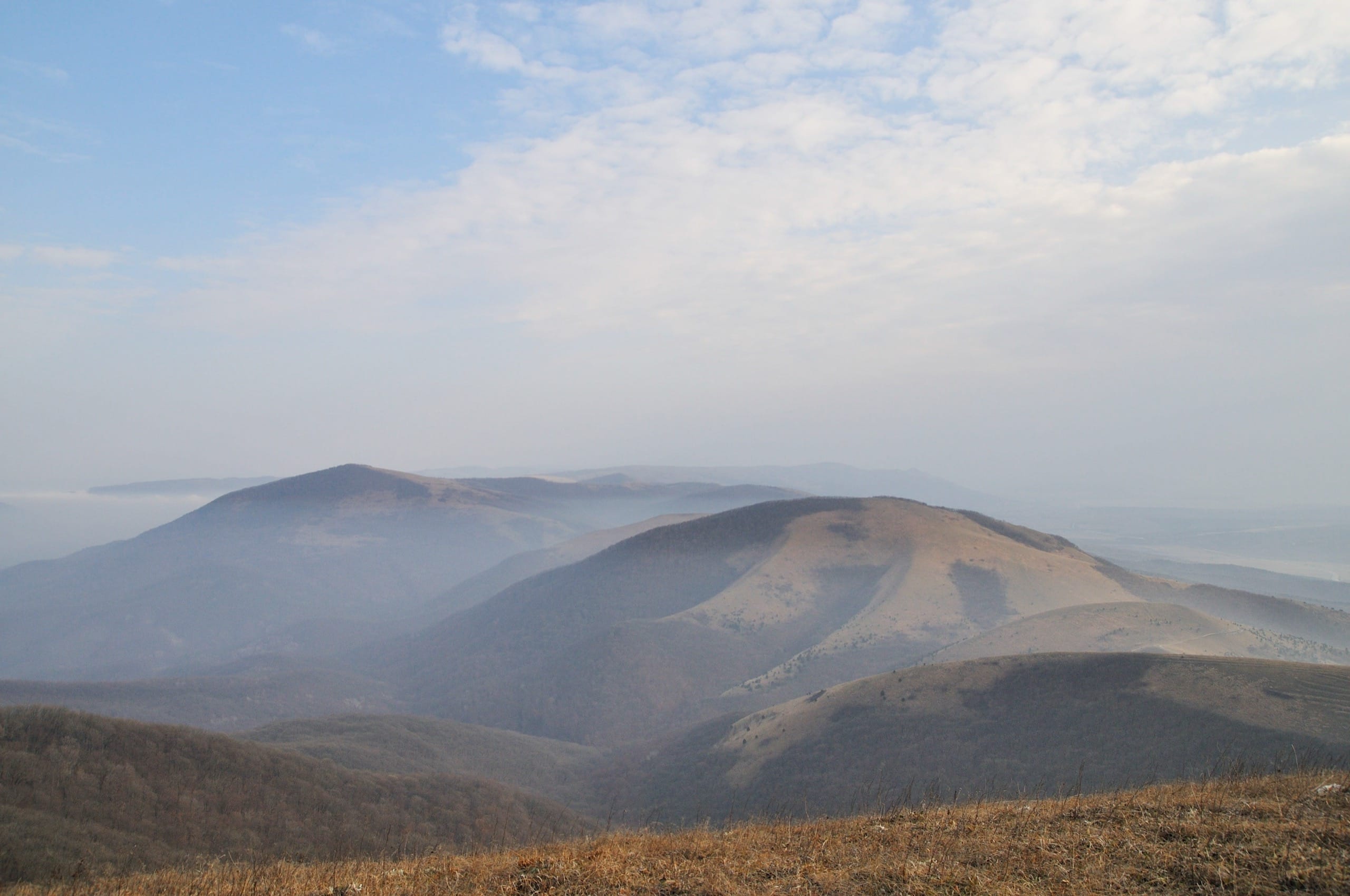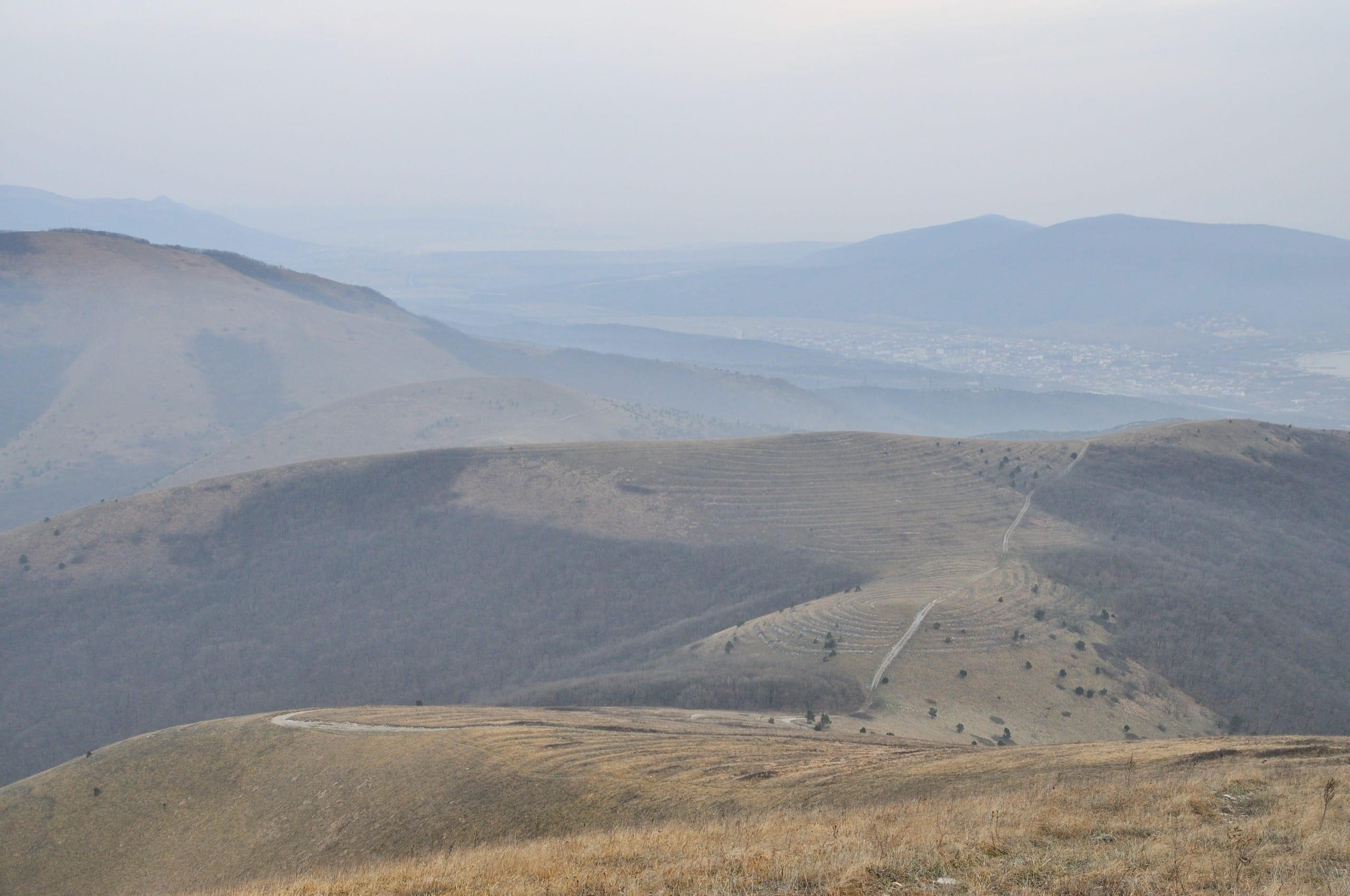 Фото 37. Туманный вид с горы Совхозной на восток. На переднем плане гора Безумная, справа (за кадром) Кабардинка.