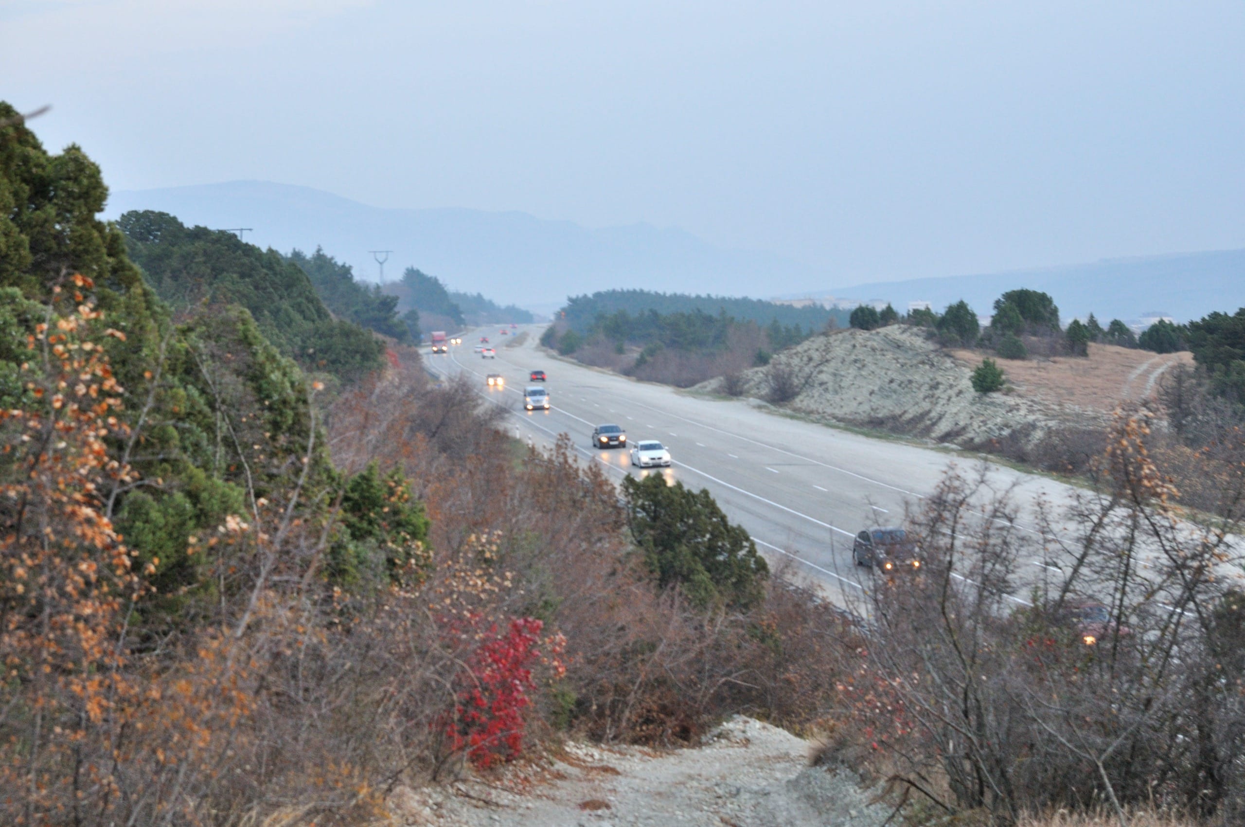 По лесному просёлку топали недолго. Вскоре вышли на прекрасное шоссе, чернящееся свежим асфальтом. Это была новая трасса из города до нефтебазы Грушевой. Траффик на ней был плотным, но к счастью мы недолго глотали газы: уже через полтора километра вышли к знаменитой смотровой точке Семь ветров, расположенной на Андреевском перевале. В отличие от площадки за Сахарной головой, Семь ветров доступна прямо с асфальтированного шоссе, поэтому дико популярна.