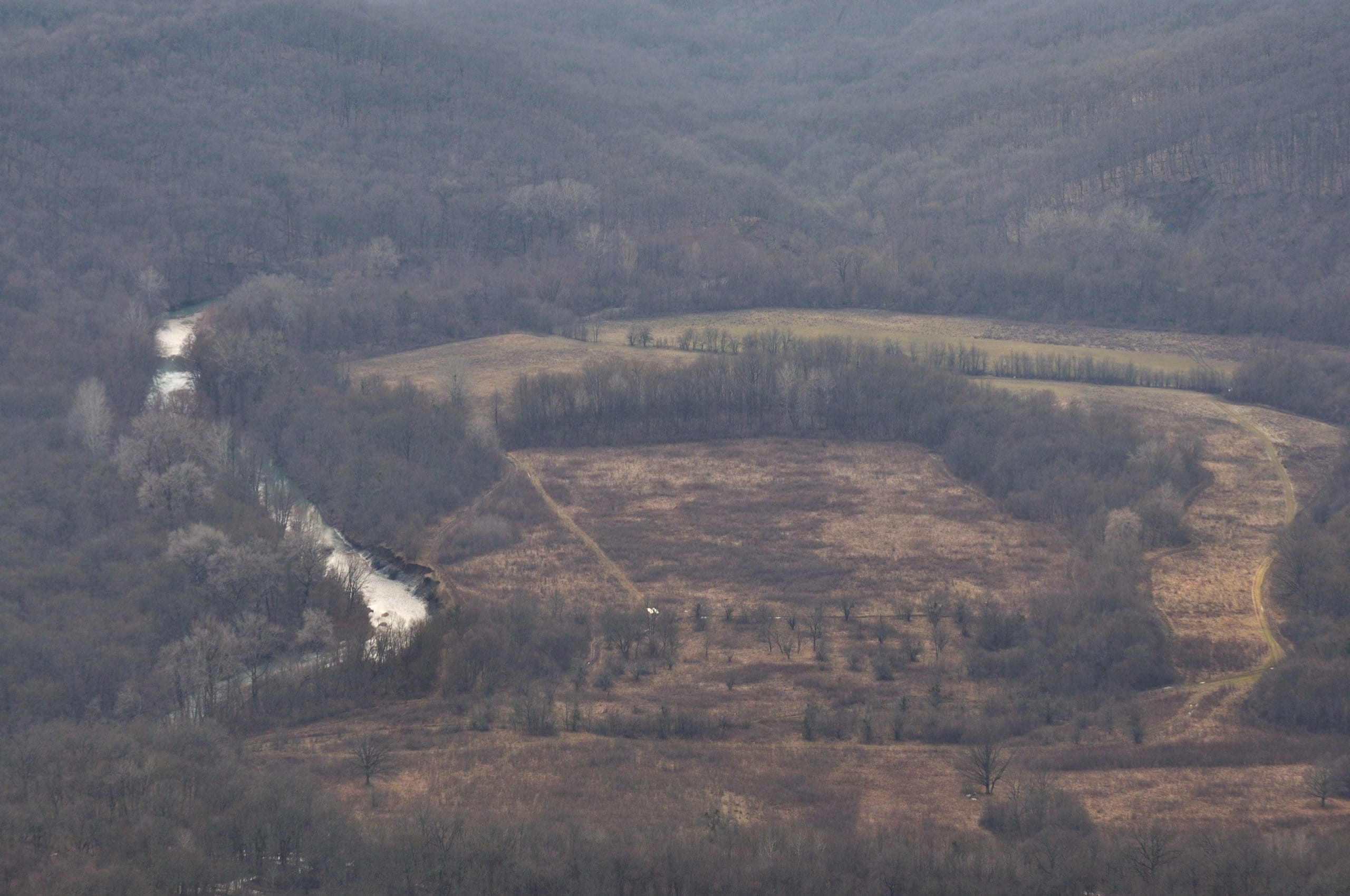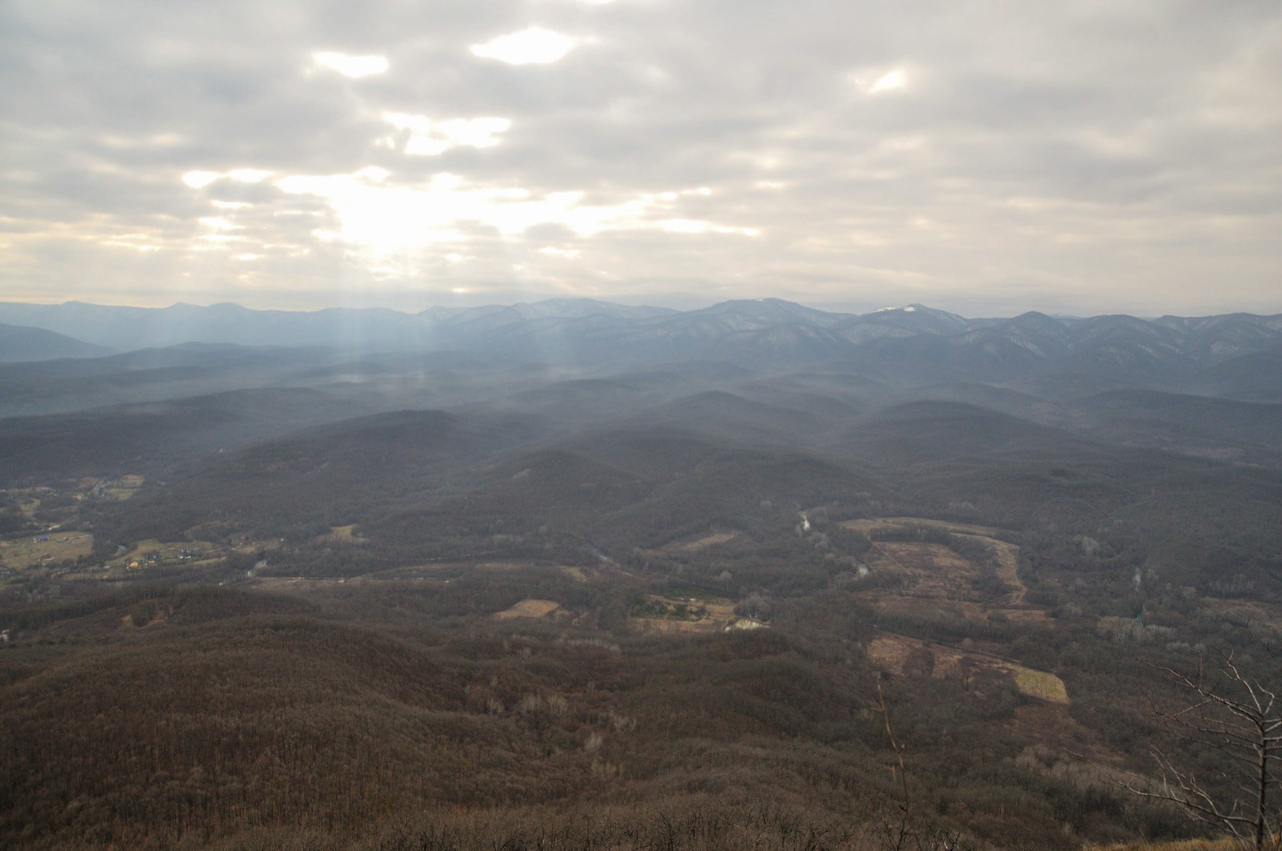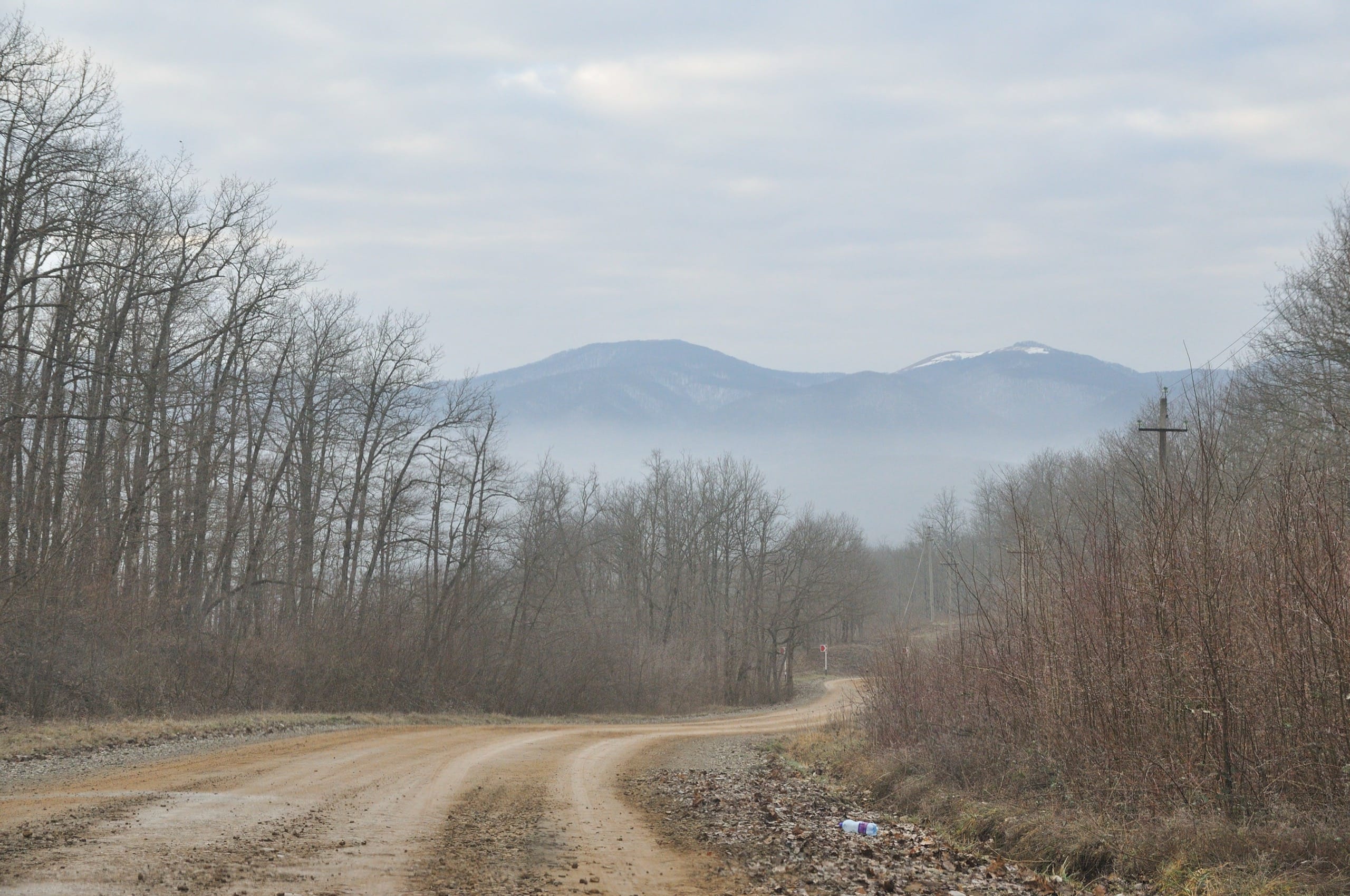 Дошли до полян, остановились на обед. Поляны на Грузинке — это обширная, свободная от леса территория, через которую насквозь проходит проселочная дорога. Поверх леса, на её краях видно немного окрестных гор, а в один момент дымка на горизонте ненадолго расступилась под случайно выскочившим из облаков лучом солнца и вдали показался Крымск. А так в общем место довольно обыденное, но «для галочки» прогуляться можно.