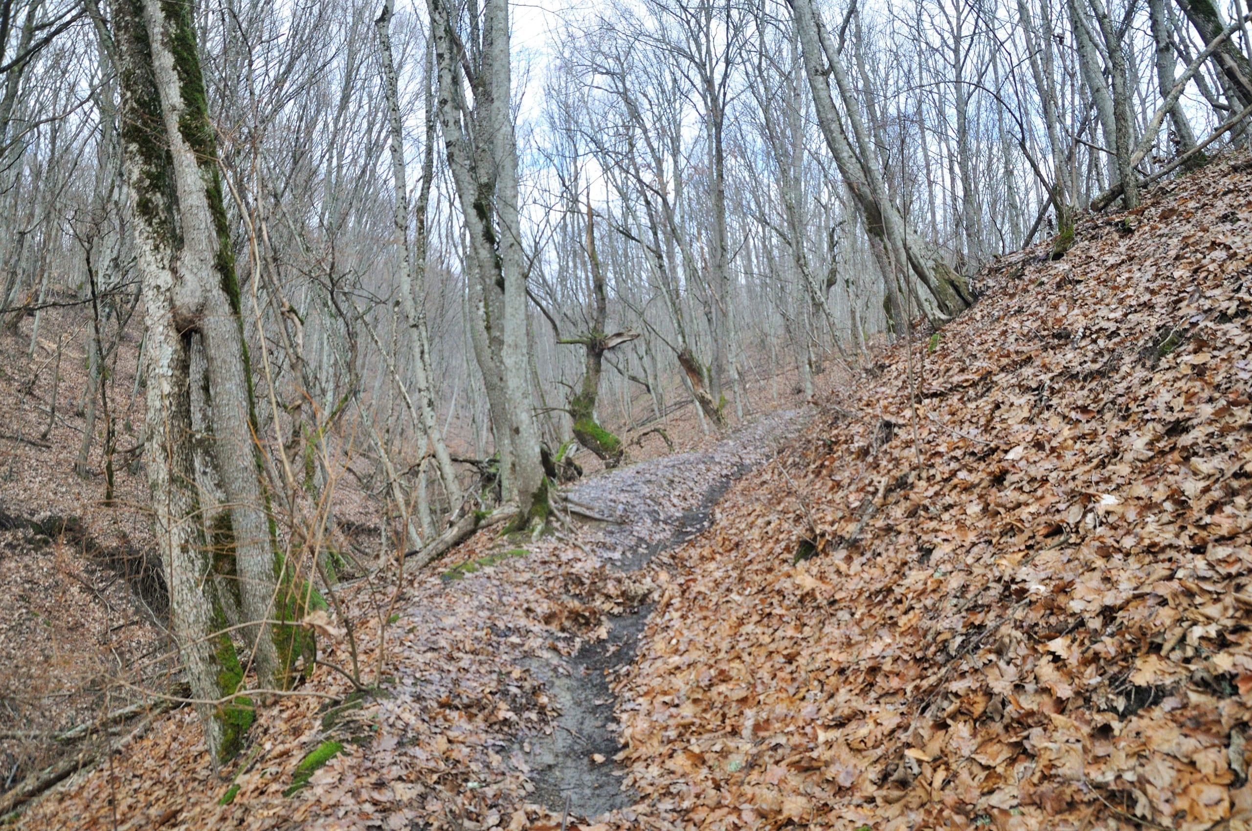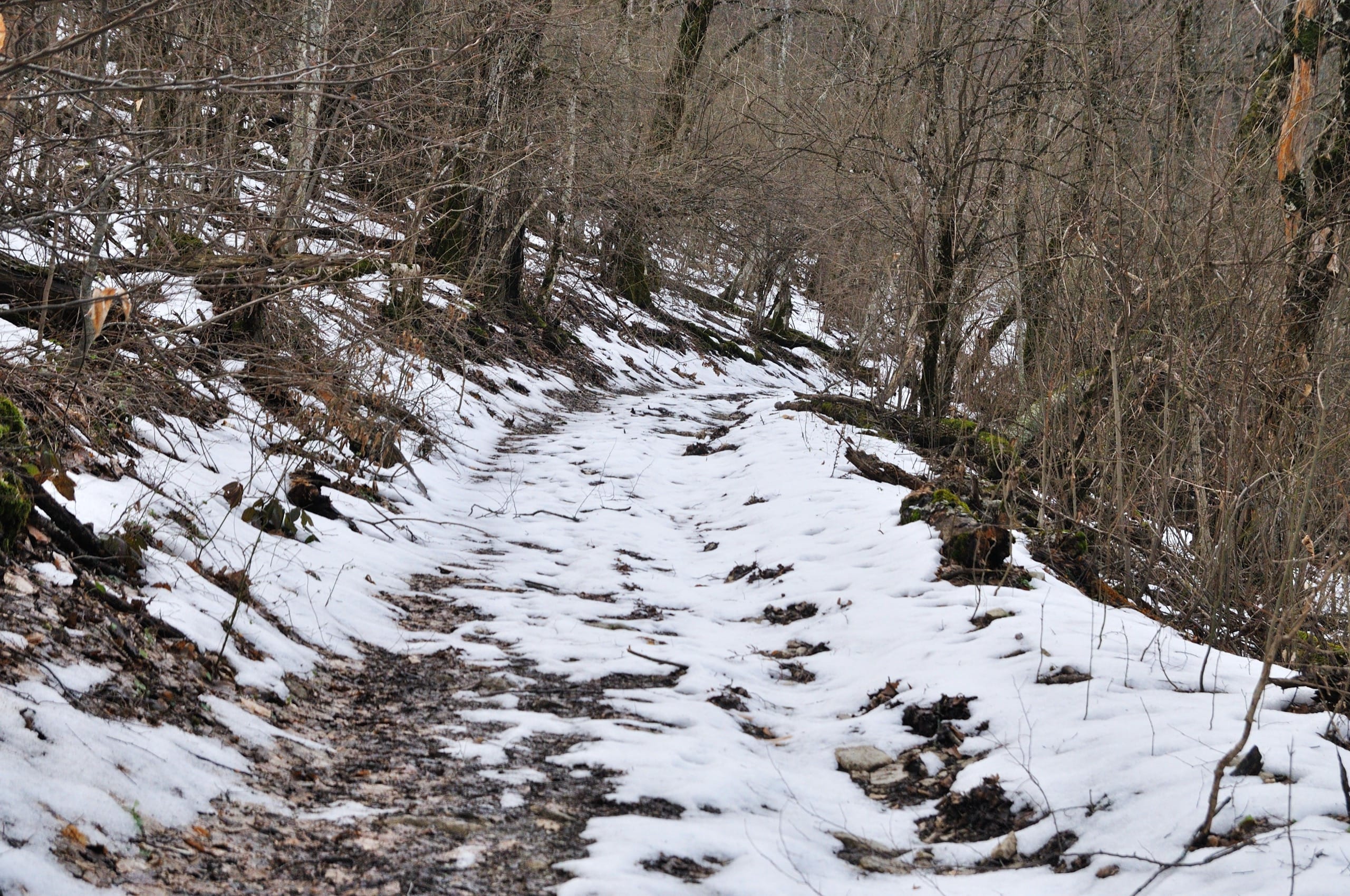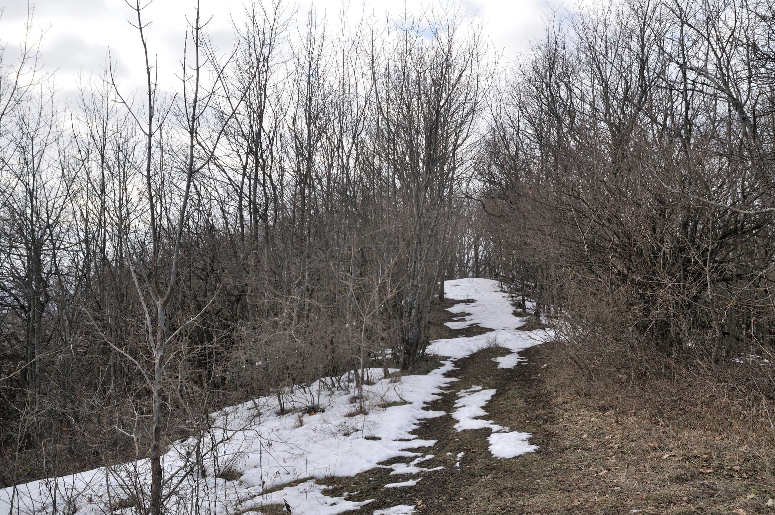 Тропа пошла с востока, в торец горы, голые кроны слабо укрывали пейзажи и мы наблюдали, как всё выше становится гора. В один момент склон стал слишком крут и тропа повела нас вправо, в обход. Понемногу с восточного перебрались на северный, более пологий склон. А там снег! Обильный снегопад был полторы недели назад, но к 18-му числу всё давно растаяло. Внизу растаяло, а тут, сначала редкие прожилки, а потом и вовсе вся дорога оказалась засыпана снегом. Хорошо, что он успел слежаться, оттого идти было совсем несложно.