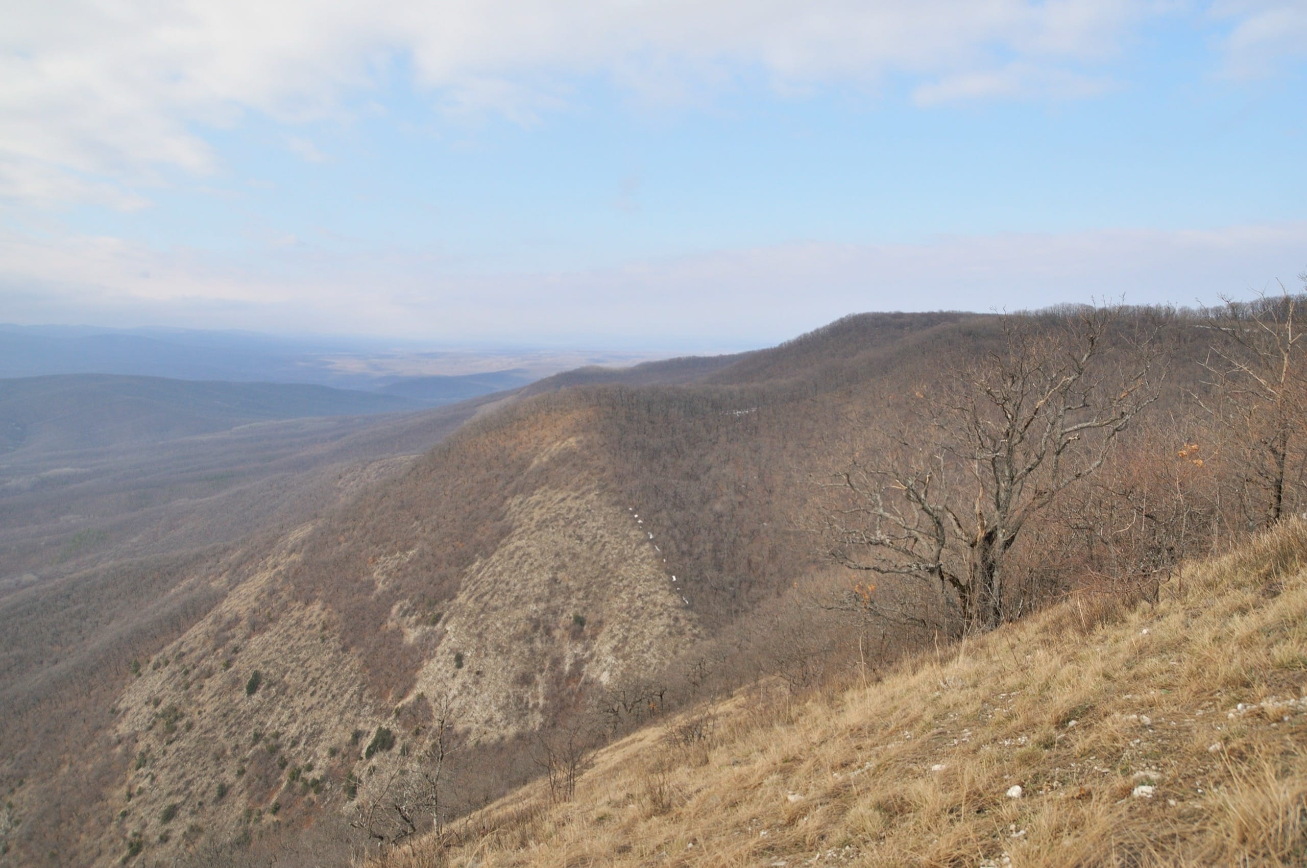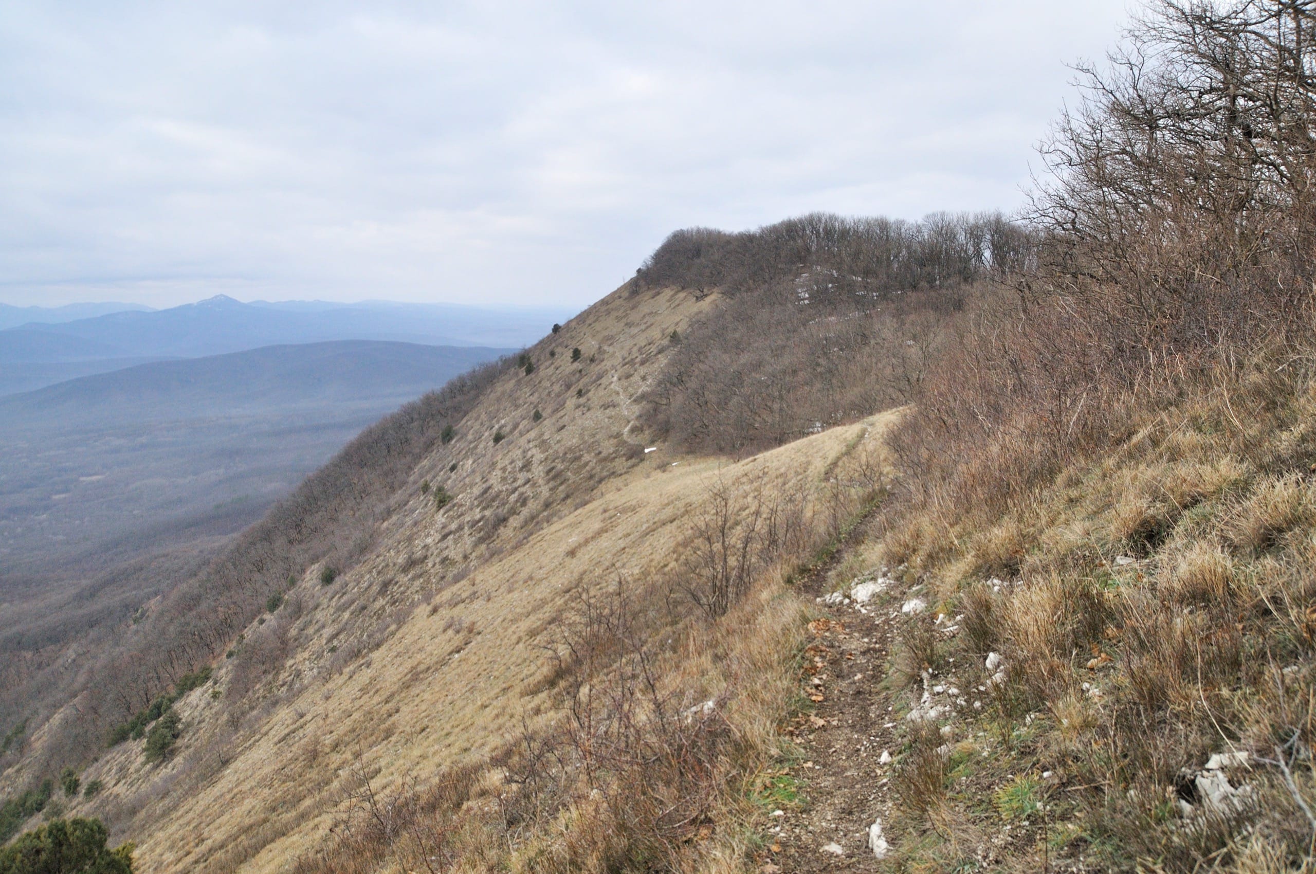 После чая с шоколадкой пошли дальше. Узкая, едва различимая тропинка повела вдоль гребня горы: по левую руку крутой склон, почти обрыв; по правую небольшой подъём, лес на гребне и северный склон на той стороне. Кстати, на южном склоне от снега не осталось и следа: голые камни, сухая трава и ничего белого.