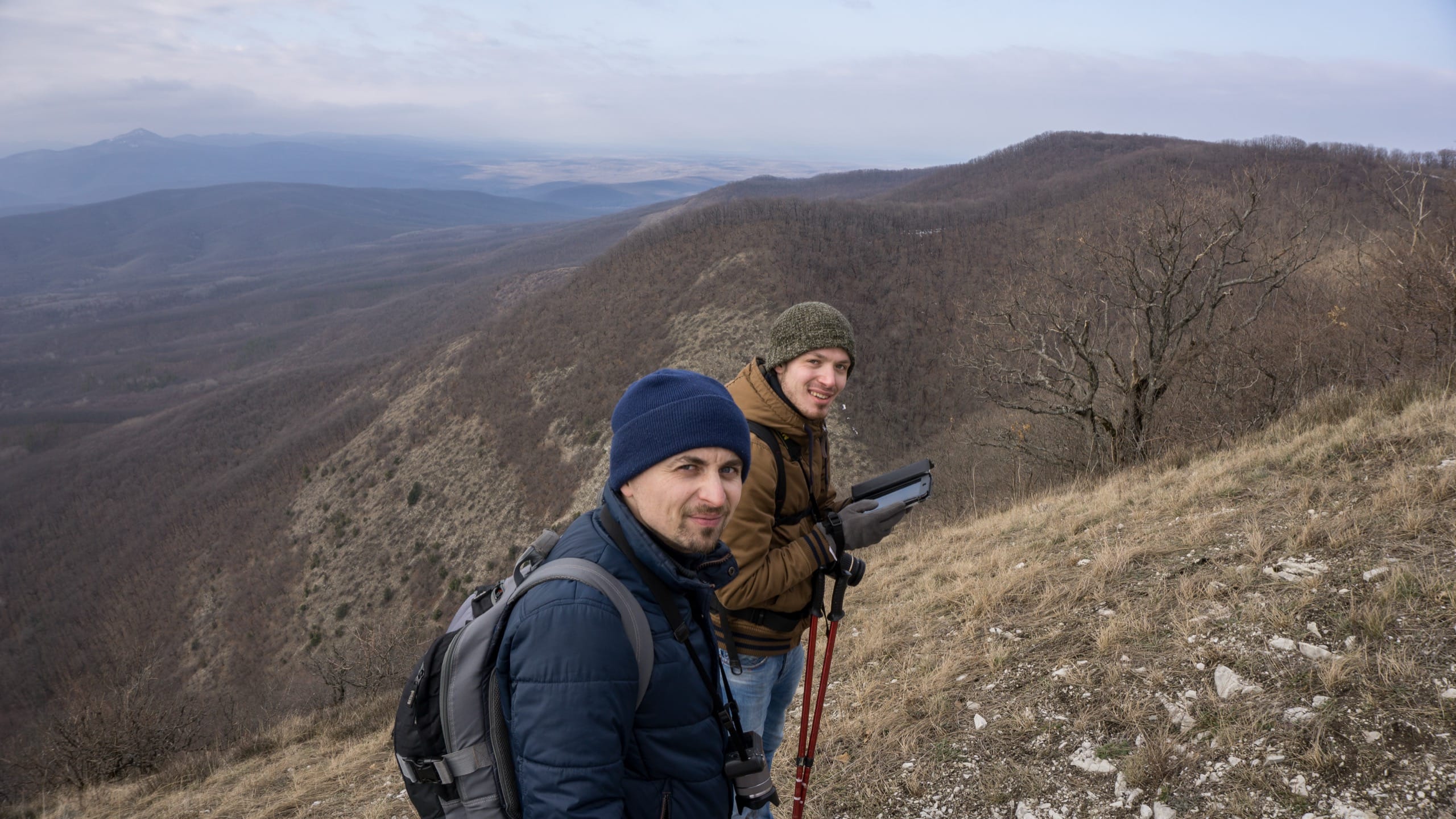 Фото 20. Автор (c планшетом в руках) сверяет маршрут на тупиковой ветке тропинки вдоль вершины. Виталик поймал нас с Евгением в момент когда зашли в тупик и я полез в карту проверять маршрут.