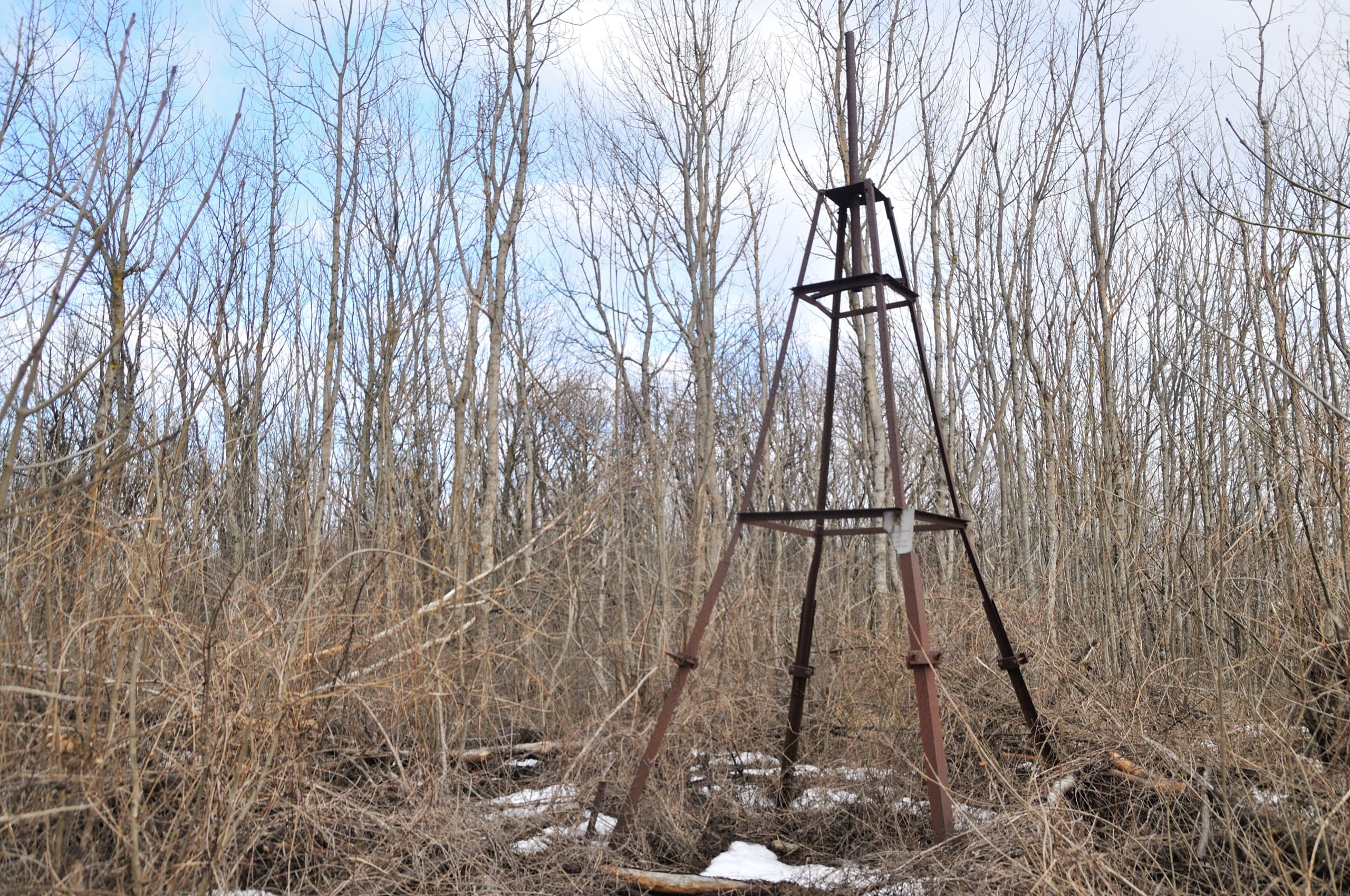 Тропа превратилась в направление и вывела на дно перемычки между Шизе и Михаль, двумя сущностями горы, героини этого рассказа. Но недолго мы нащупывали путь по навигатору, скоро направление снова обернулось, не то что тропой — целой лесной дорогой! Но по ней мы шли недолго. Этот просёлок, на карте не отмеченный вёл вокруг вершины, а нам же надо было «тригу пошатать». Свернули с дороги и напролом через лес. Десять минут и мы у цели. Вот он, ржавый триангулятор. Сфотографировали и пошли дальше.