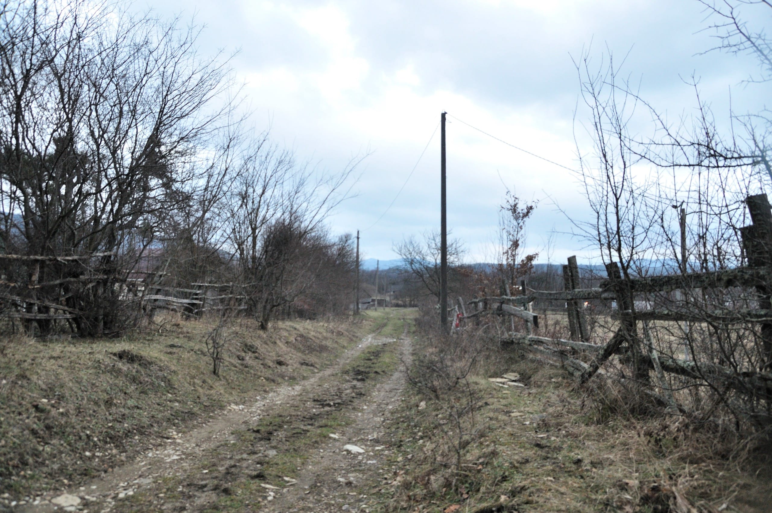 Должна была быть тропа, ведущая к дороге, но там, где по навигатору рисовалась стёжка, на деле начинался крутой, заросший порослью склон. Пришлось ещё немного побродить по лесной чаще, прежде чем через несколько сотен метров мы вернулись на дорогу, по которой бодро пошагали по гребню хребта Грузинка к расположенным на середине хребта полянам.