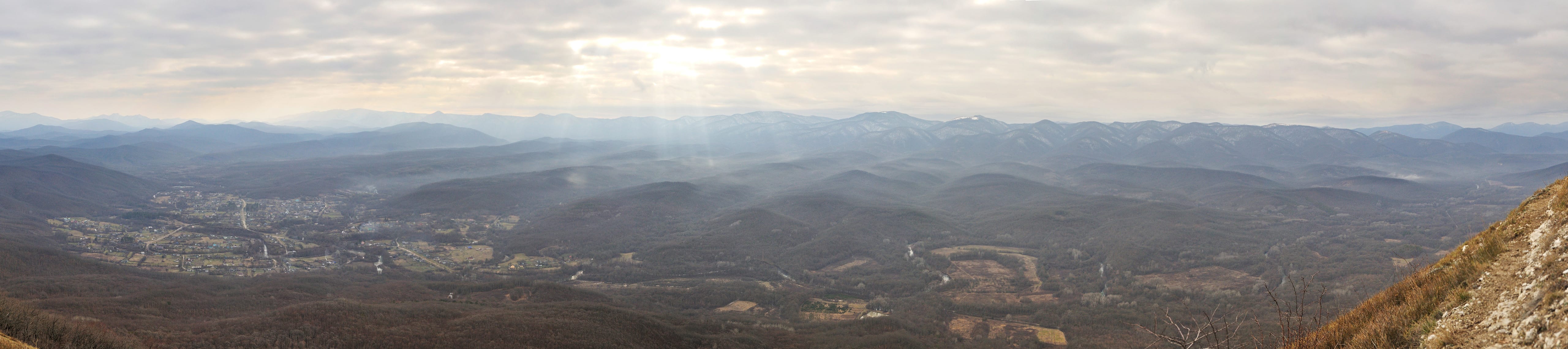 Панорама 1. Вид с вершины Шизе на долину Абина, хребет Коцехур и станицу Эриванскую.