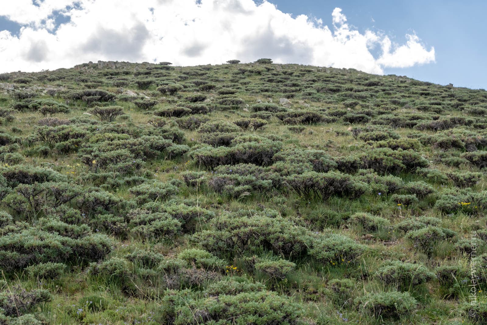 На южном склоне растительность местами почти полностью отсутствует. Предположу, что это результат активного выпаса скота.