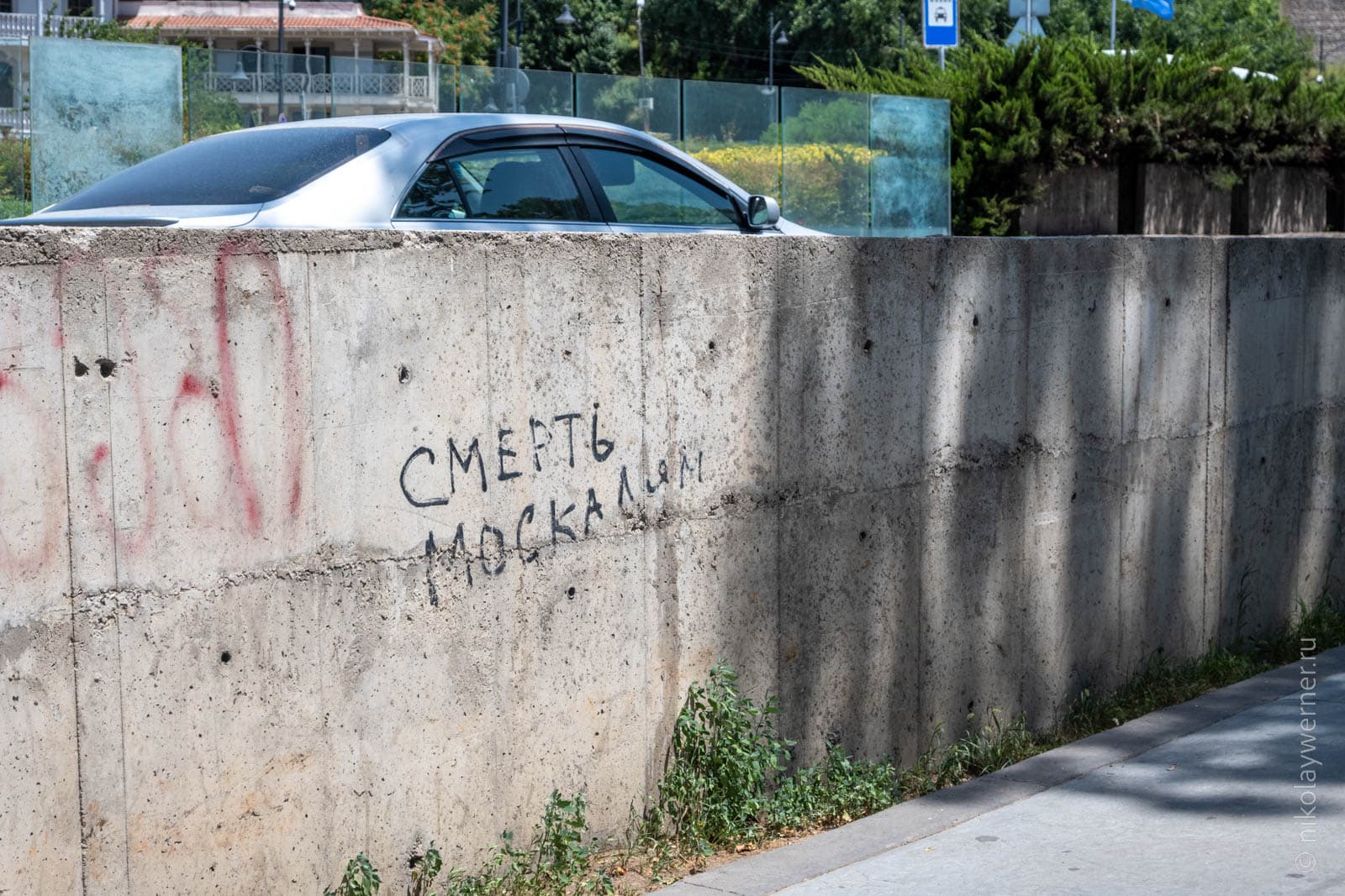 Если смотреть на них, то может показаться что грузины прям ненавидят русских и здесь должно быть не безопасно. Но это не так. Конечно, где-то есть негативно настроенные люди и о случаях откровенной русофобии я слышал. Но всё же это не правило. Большая часть грузин относятся к русским либо нейтрально, либо хорошо. Забегая вперёд скажу, что за эту поездку нам так и не довелось встретить человека, который бы как-то с нами плохо обошёлся.