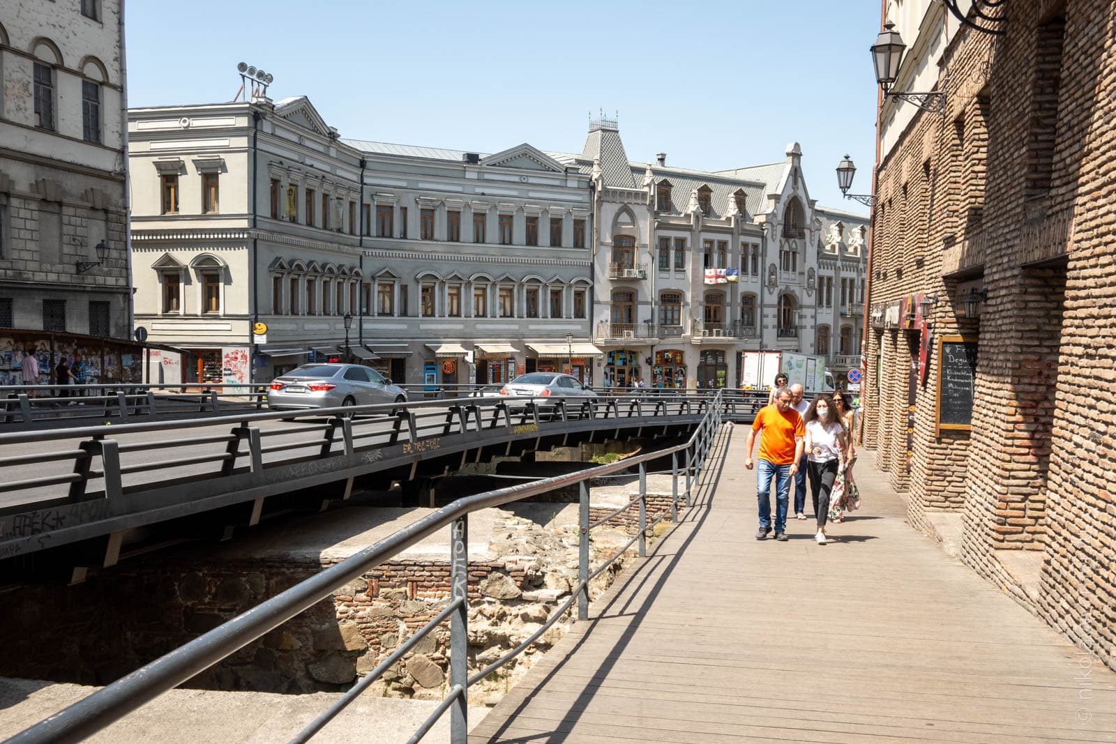 Откуда по улице Пушкина пошли в сторону площади Орбелиани. Привлекла внимание эстакада, бережно постеленная поверх обнаруженной в этом месте старины.