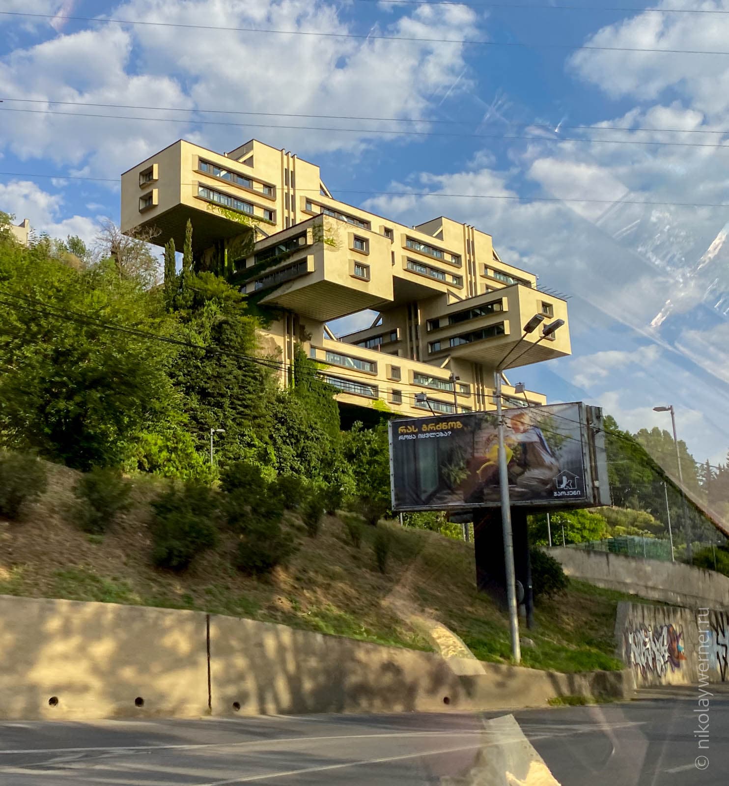 Начну со знаменитого здания Министерства Автомобильных дорог Грузинской ССР, одного из великих памятников советского модернизма. Построено в 1975-м году, авторы получили за него набор наград, архитекторы многих стран до сих пор восхищаются этим чудом, а сегодня там располагаются офисы Банка Грузии.