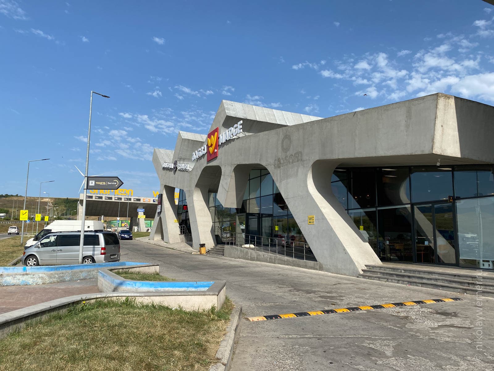 Проехали Гори. Он находится южнее трассы, мы туда не сворачивали. Остановились рядом, перекусить в придорожном фастфуде. Было вкусно и недорого. И здание понравилось, необычные формы.