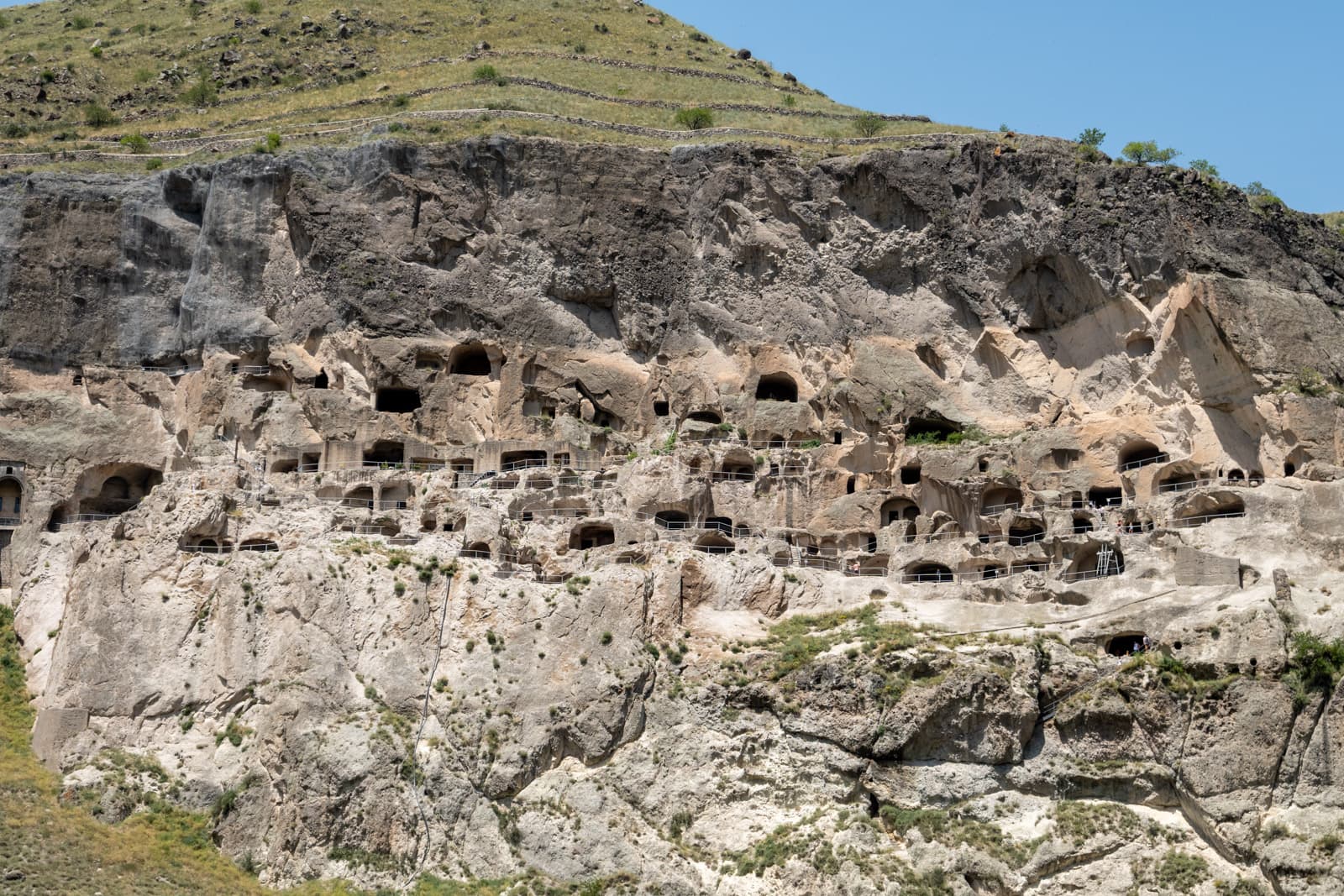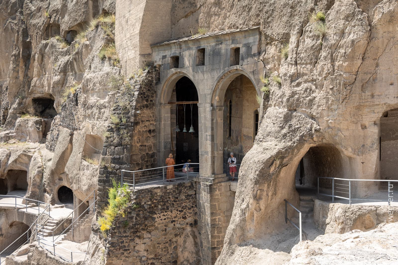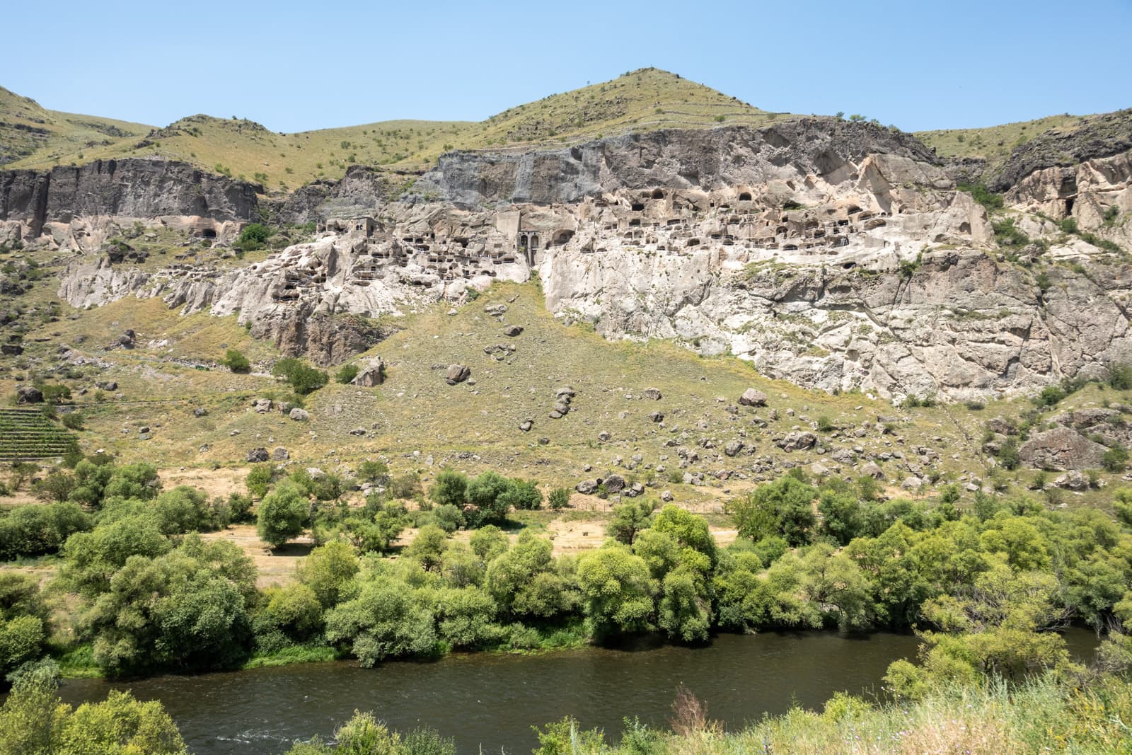 Вардзия расположилась в скале, нависшей над левым берегом реки, а дорога приводит к монастырю по правому берегу. Таким образом, прежде чем приступить к осмотру сего великолепия, путник получает возможность оценить масштабы строения со стороны.