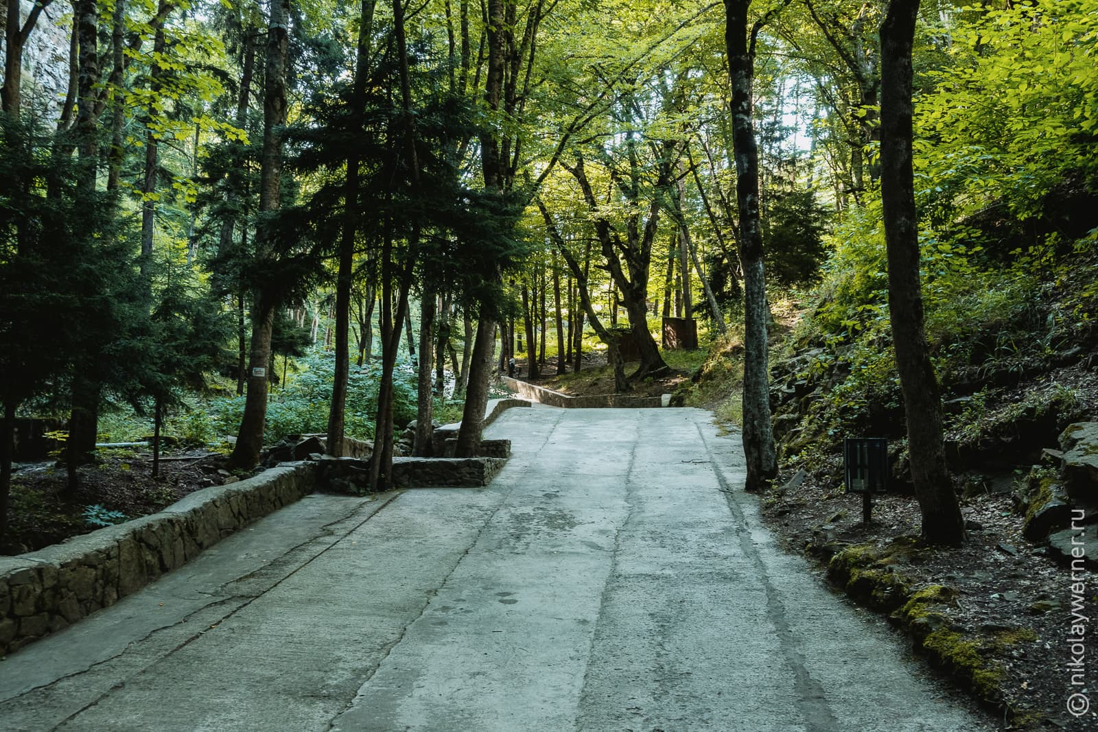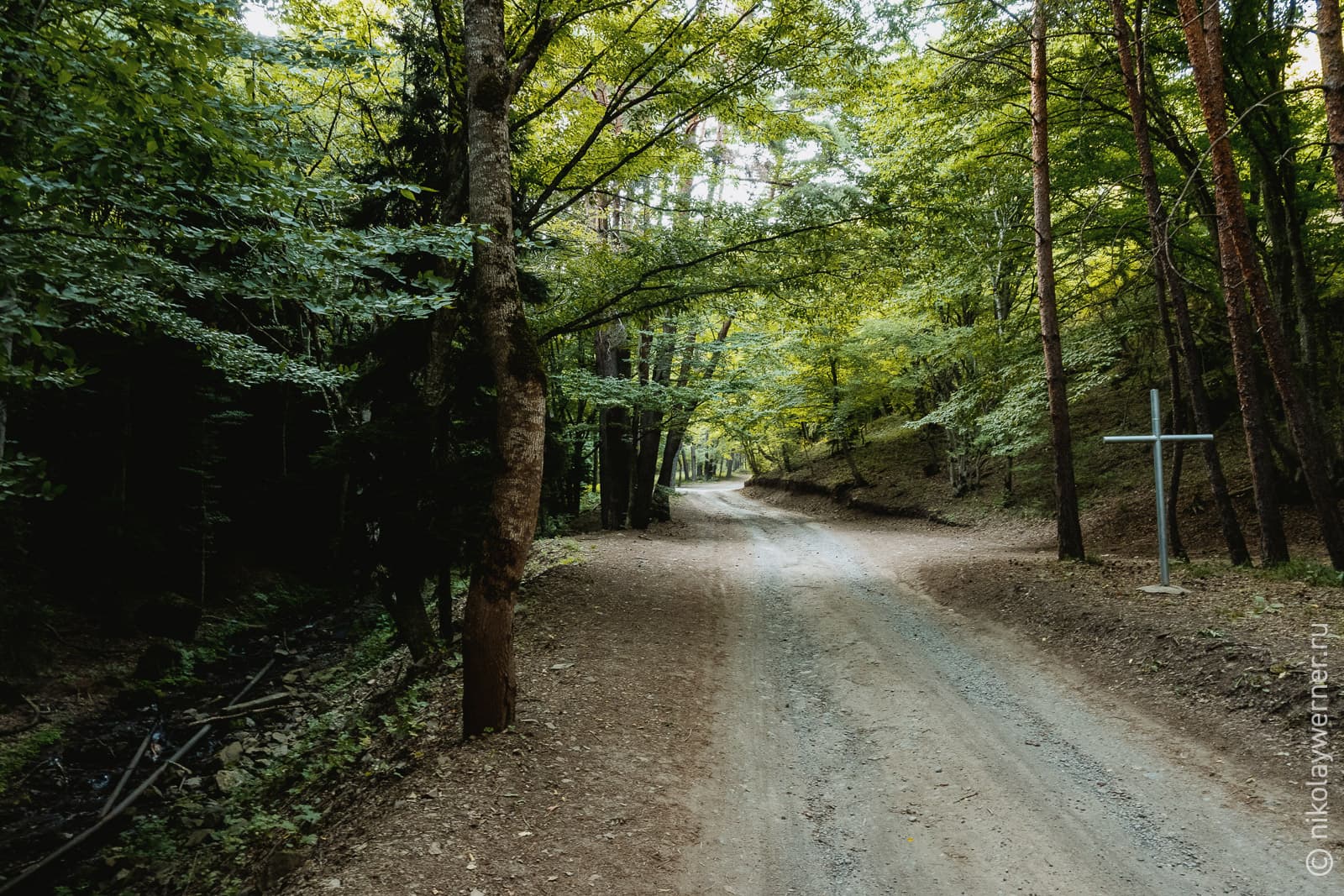 Так вот, чтобы попасть в Зелёный монастырь, иначе Цване, нужно не доезжая 9 км до Боржоми (со стороны моря) свернуть влево, в лес. Дальше будет около километра чудесной лесной дороги (возможно, после дождя не очень чудесной). После небольшая парковка и мощёная дорожка, уводящая к монастырю.