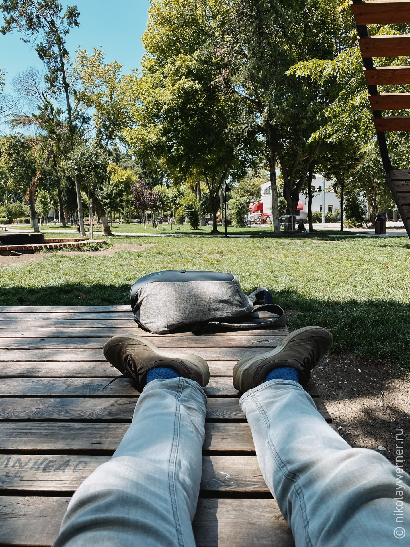 Но вообще, мы были уставшие, на улице было ужасно жарко, поэтому когда увидели парковые лежаки, не удержались и остались на них.