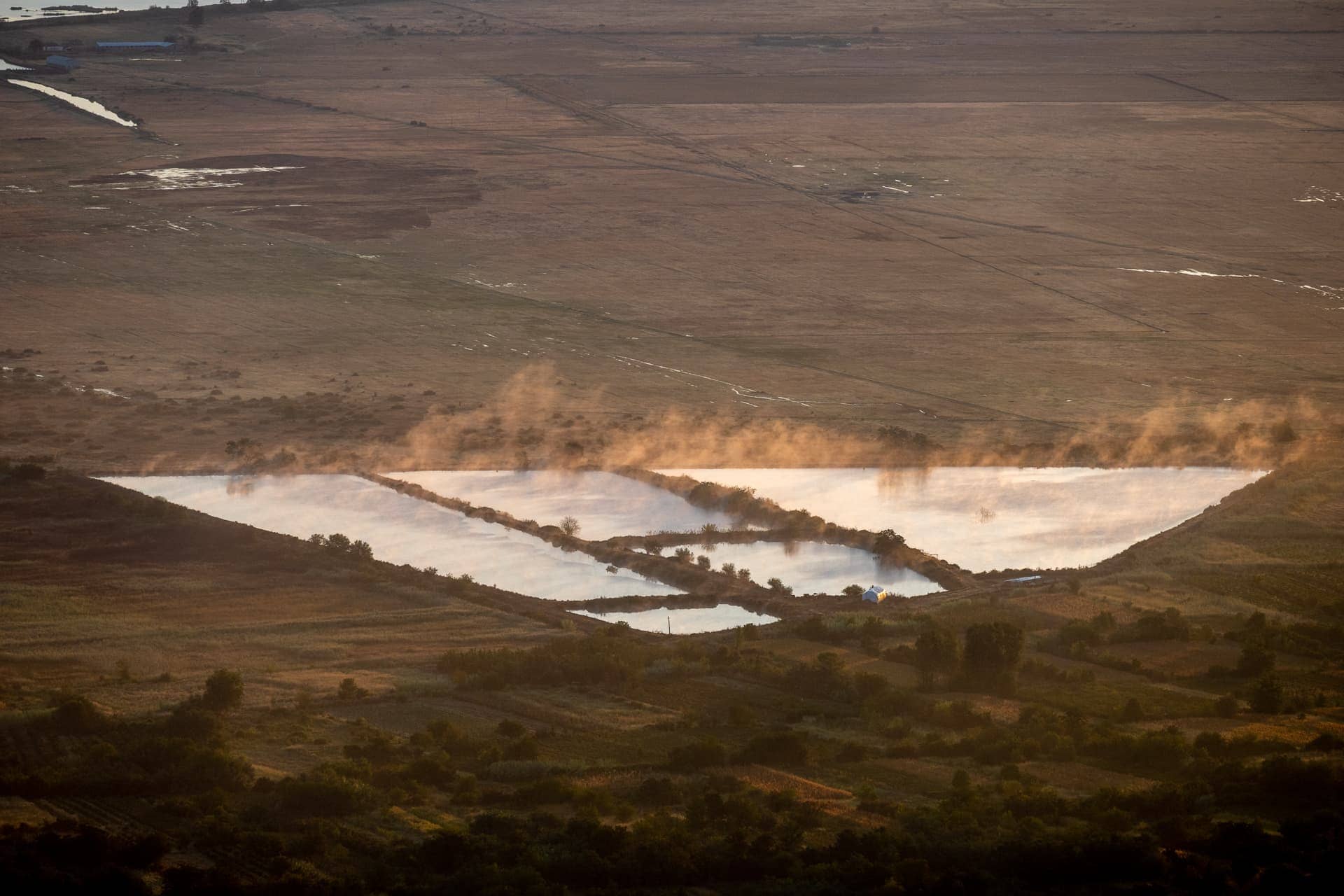 Пылал в лучах солнца пар, поднимающийся на прудами.