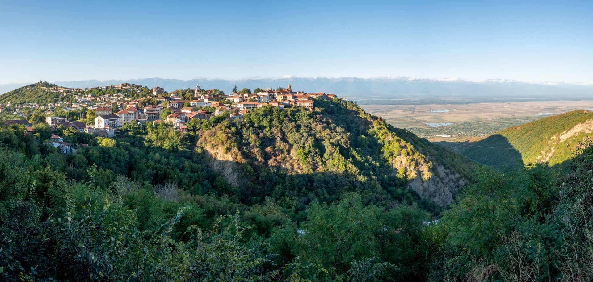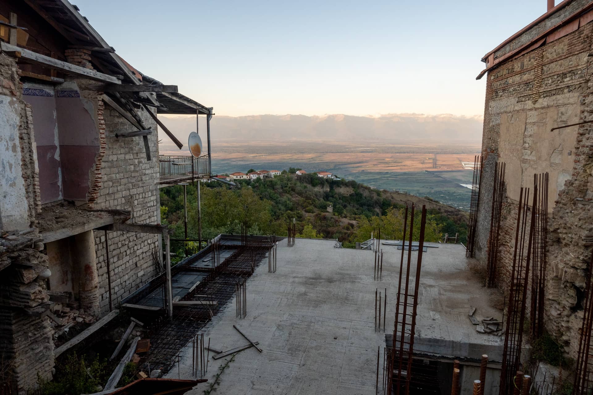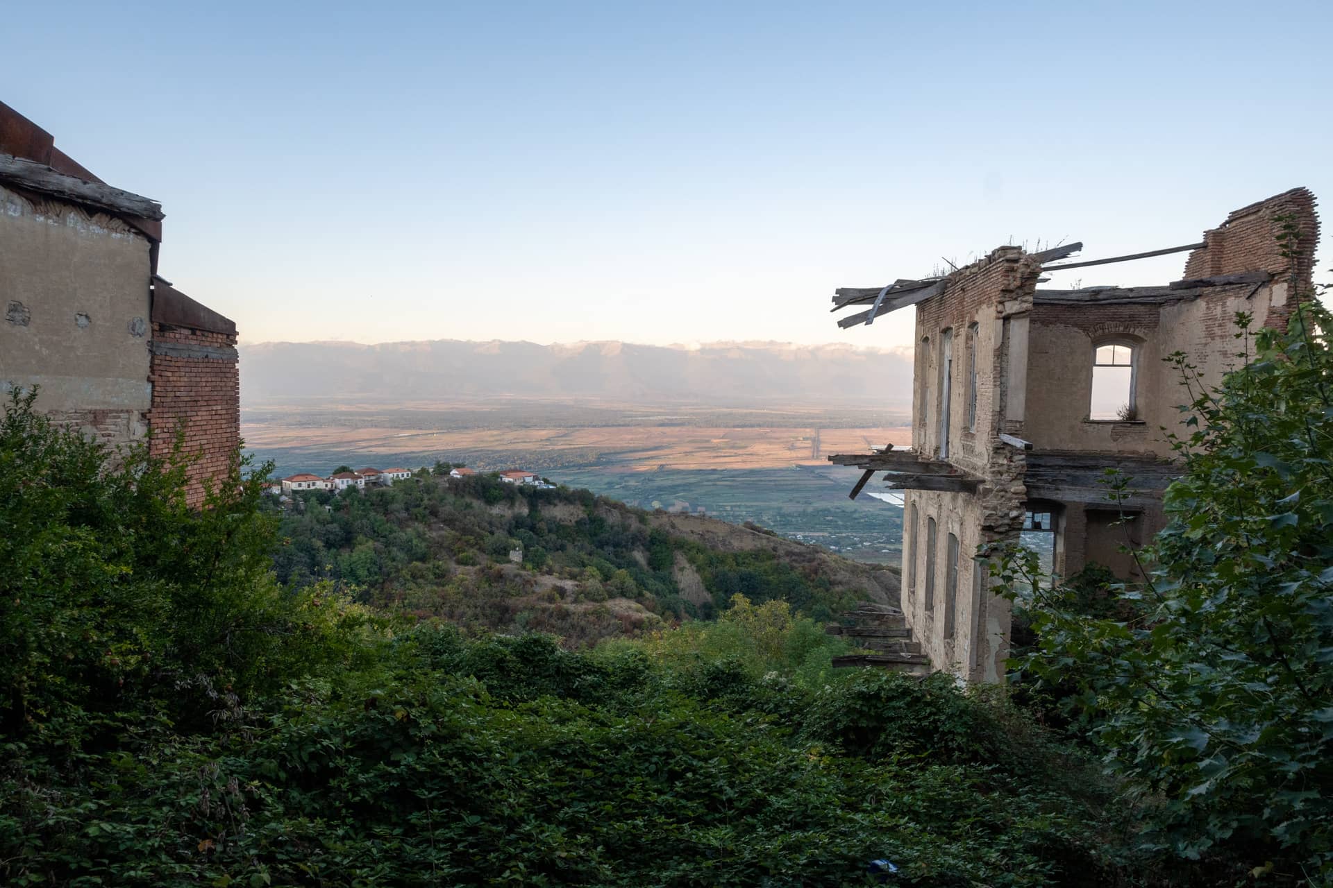 Возле одной из немногих развалин туристической секции Сигнахи открывается очередной классный вид на Алазанскую долину и стоящий за ней Большой Кавказский хребет.