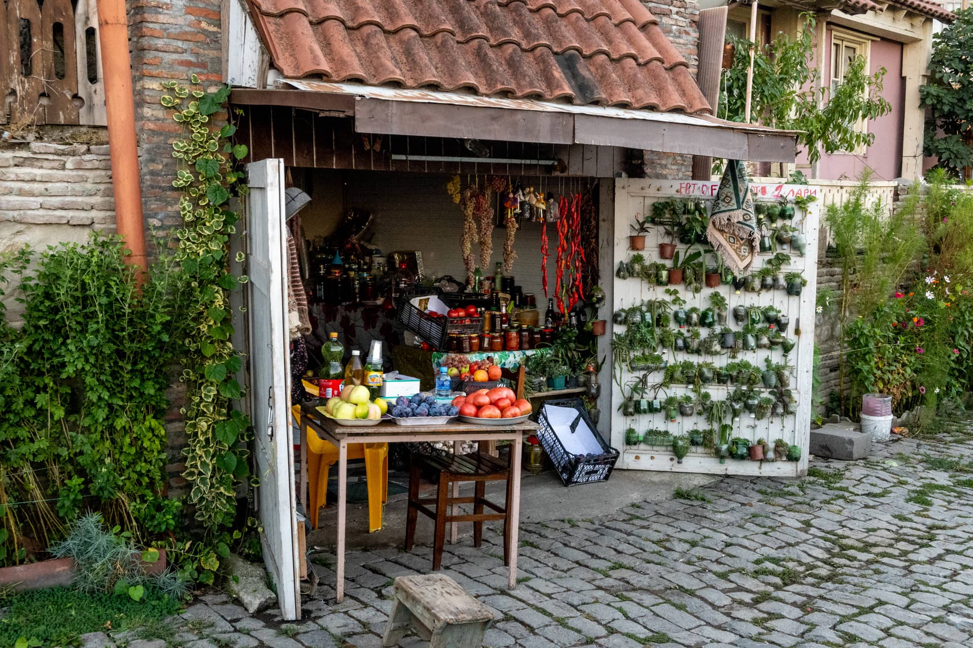Придомовая лавка с овощами и закрутками.