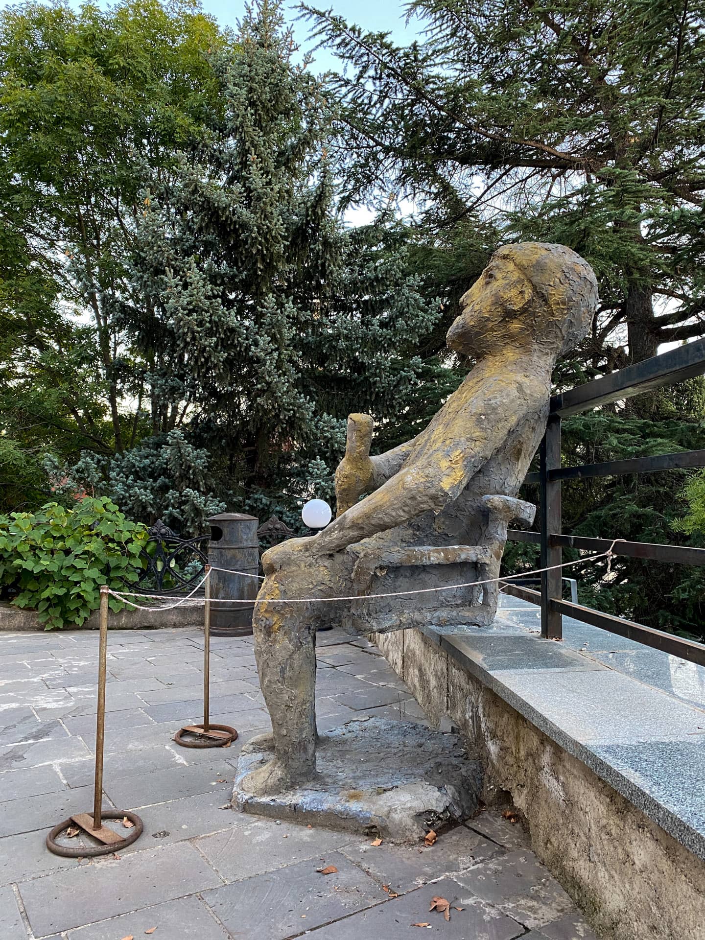 Возле музея сидит бронзовый (или каменный?) мужик с рогом.