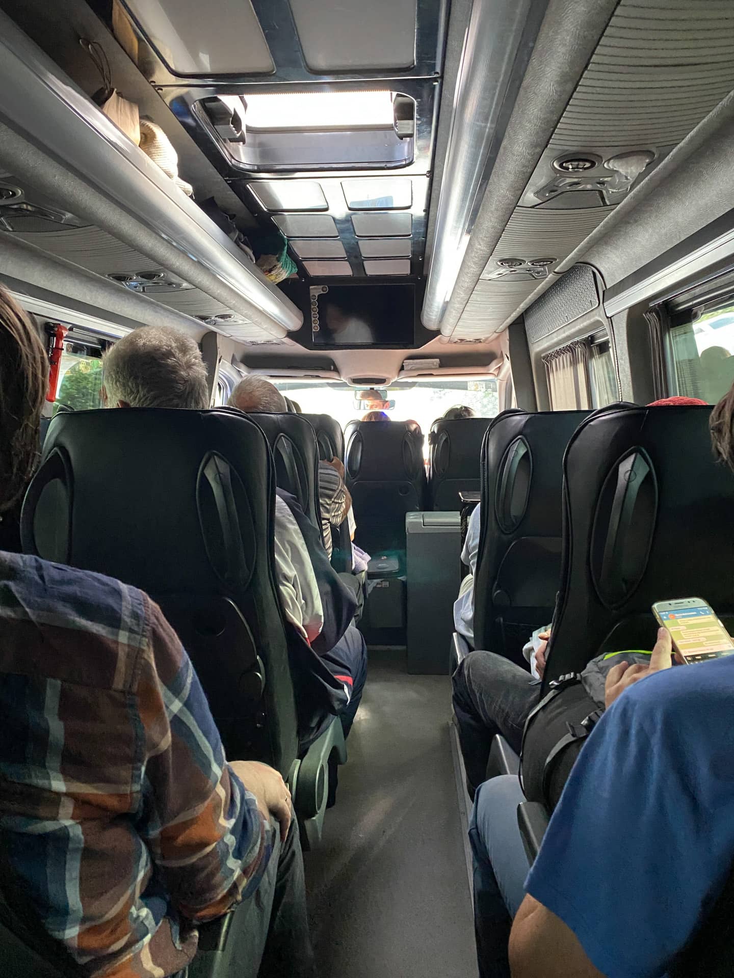 Надо сказать, что телевизор, висящий прямо по курсу стал настоящим проклятием в дороге. Ибо вскоре водитель включит на нём какие-то третьесортные клипы, пытающиеся вытянуть примитивную музыку за счёт самосвала голых жоп. Всё это на максимальной яркости жгло глаза, мешая смотреть в окна... Чтобы более-менее комфортно ехать мне пришлось городить на голове козырёк из подручных средств, который прикрывал это безобразие.