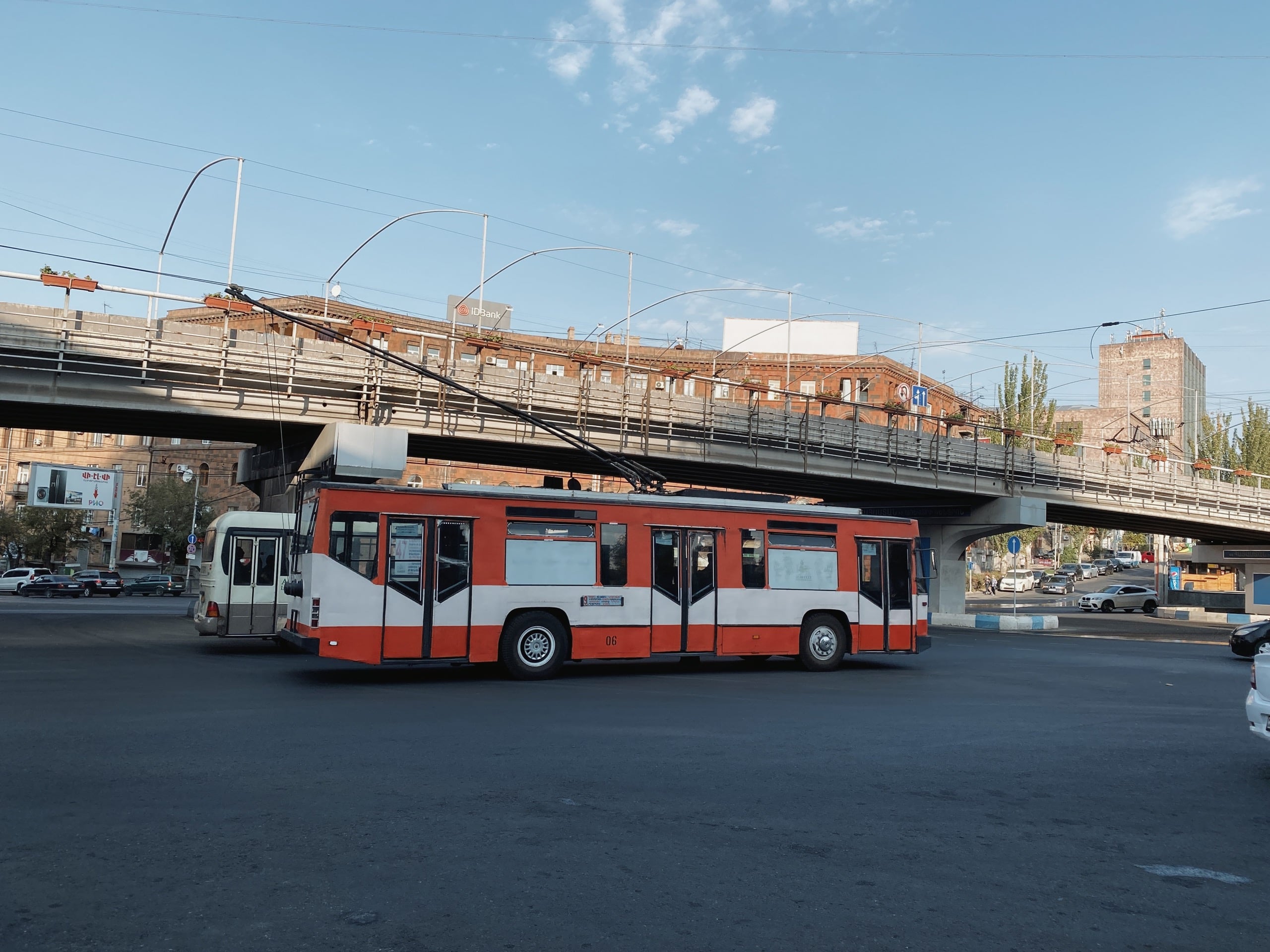 В Ереван мы приехали в без десяти девять. Вышли на стандартной GG-остановке, у метро Барекамутюн. Первым делом решили выпить кофе. Я присмотрел на улице Сарьяна кофейню «Айк» и мы вызвали туда такси. Пока ждали машину я сфотографировал троллейбус.